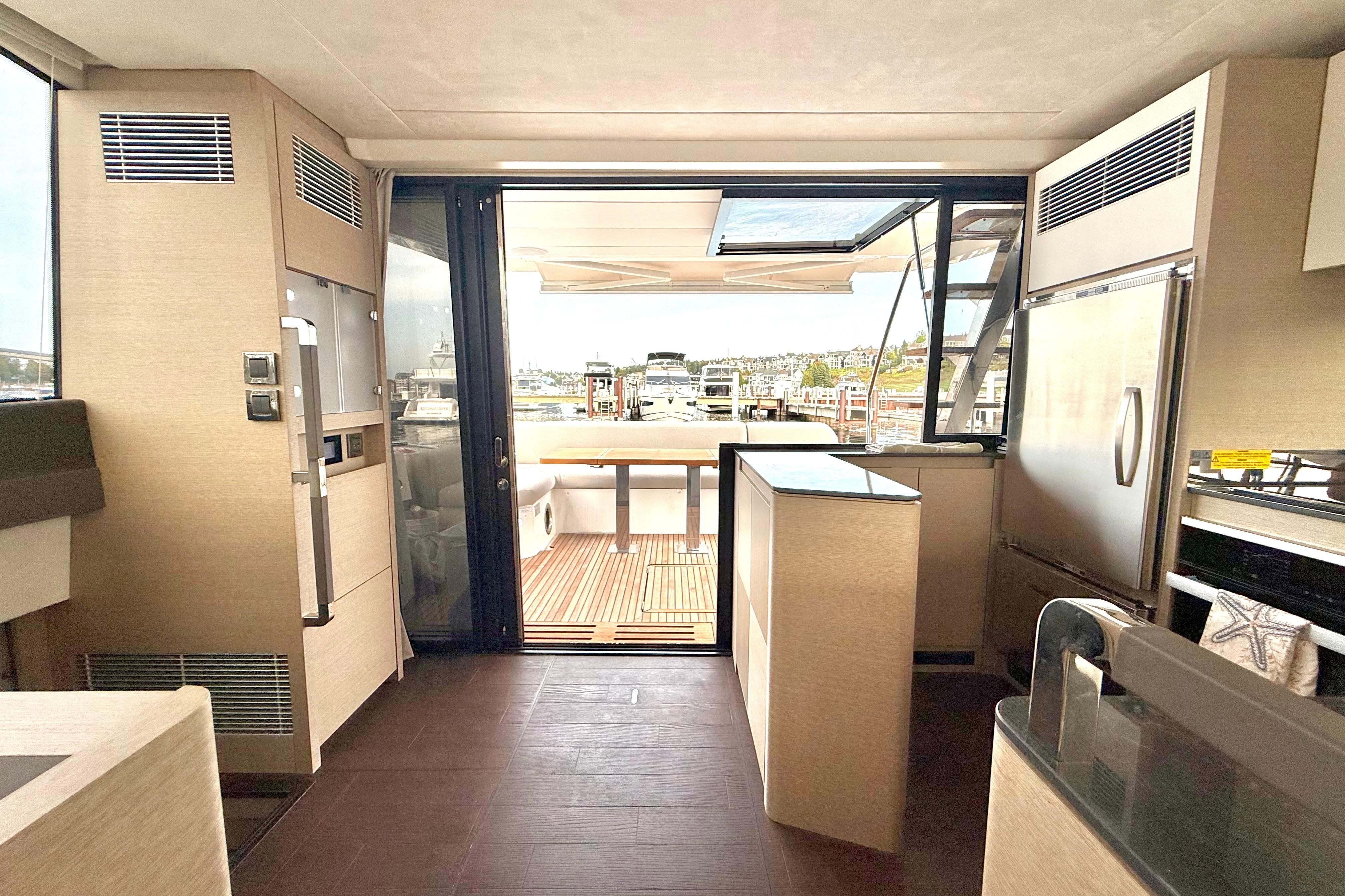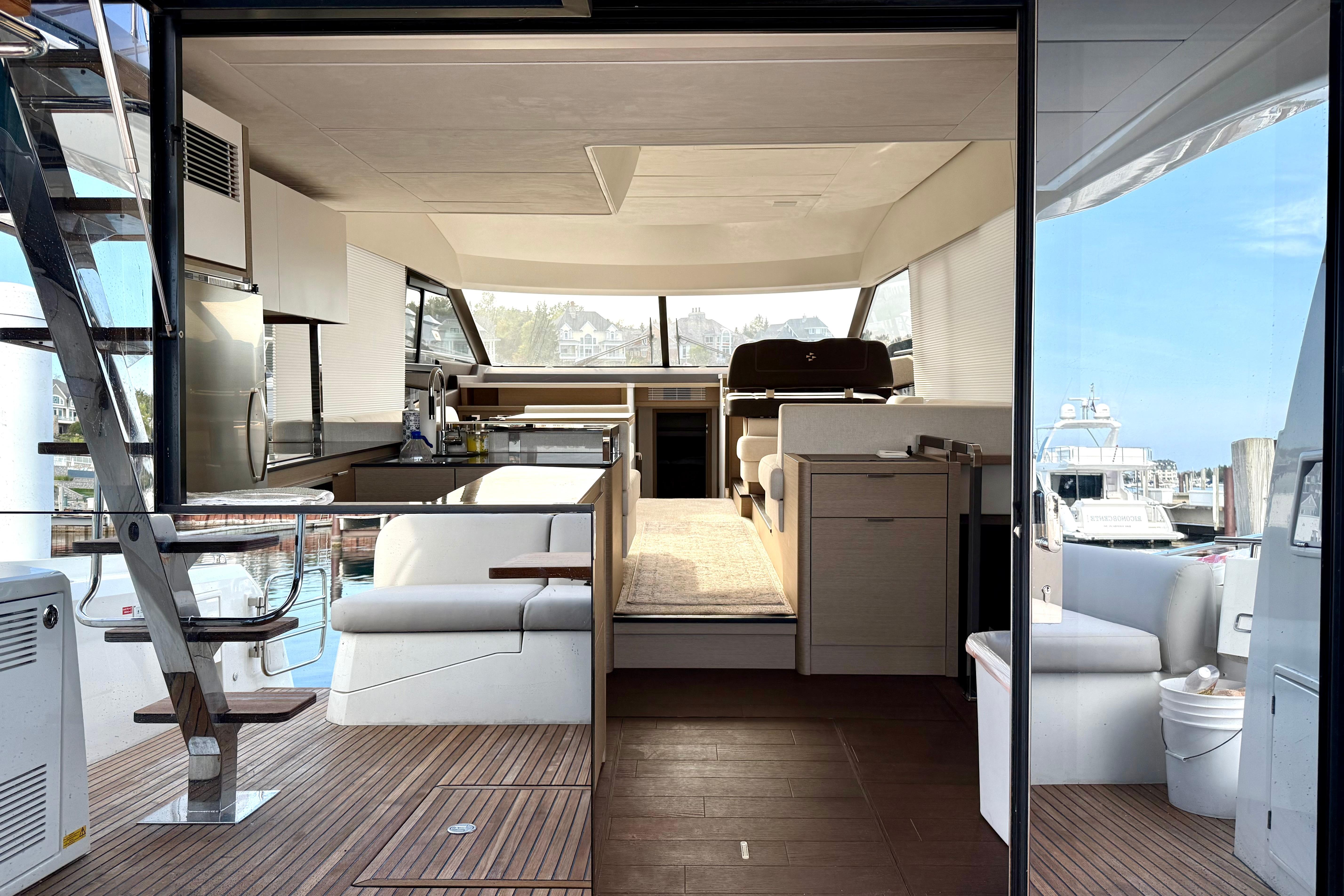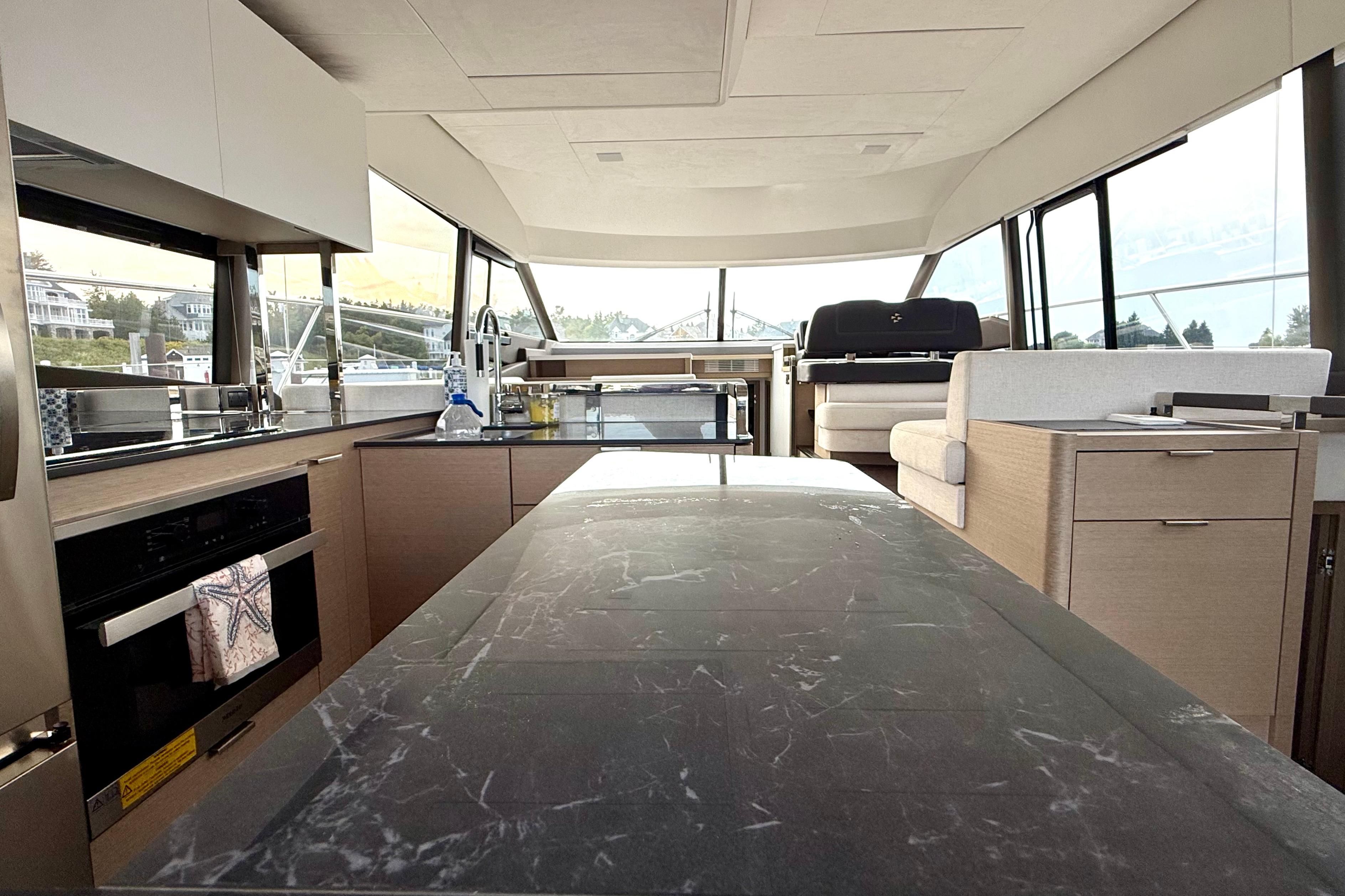 Lifestyle Flexibility: The aft-Galley flows seamlessly into the cockpit, making entertaining effortless, while the flybridge and foredeck lounges double your outdoor living spaces.