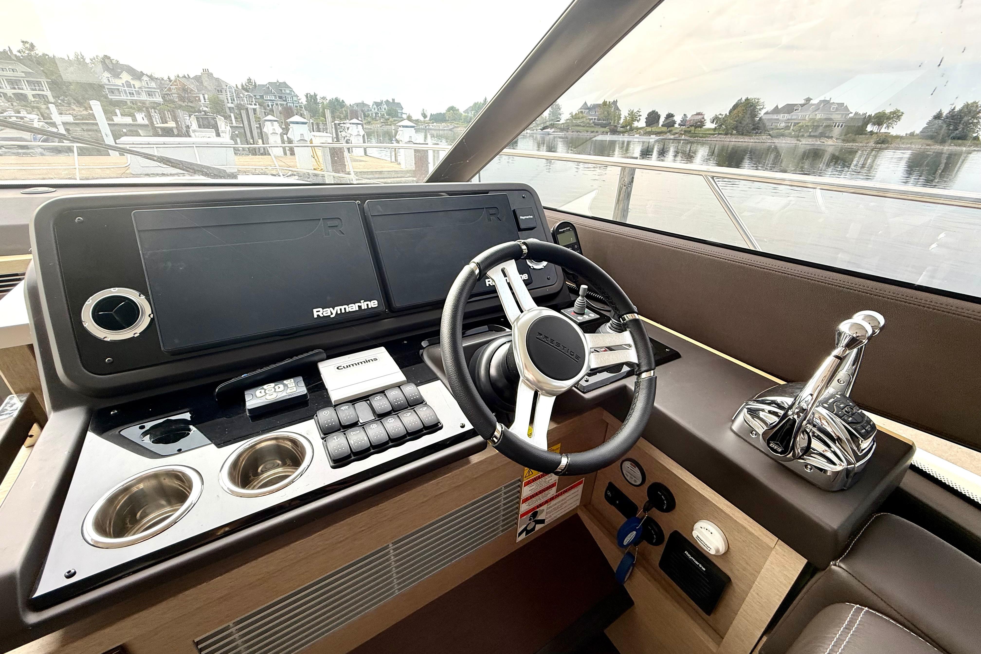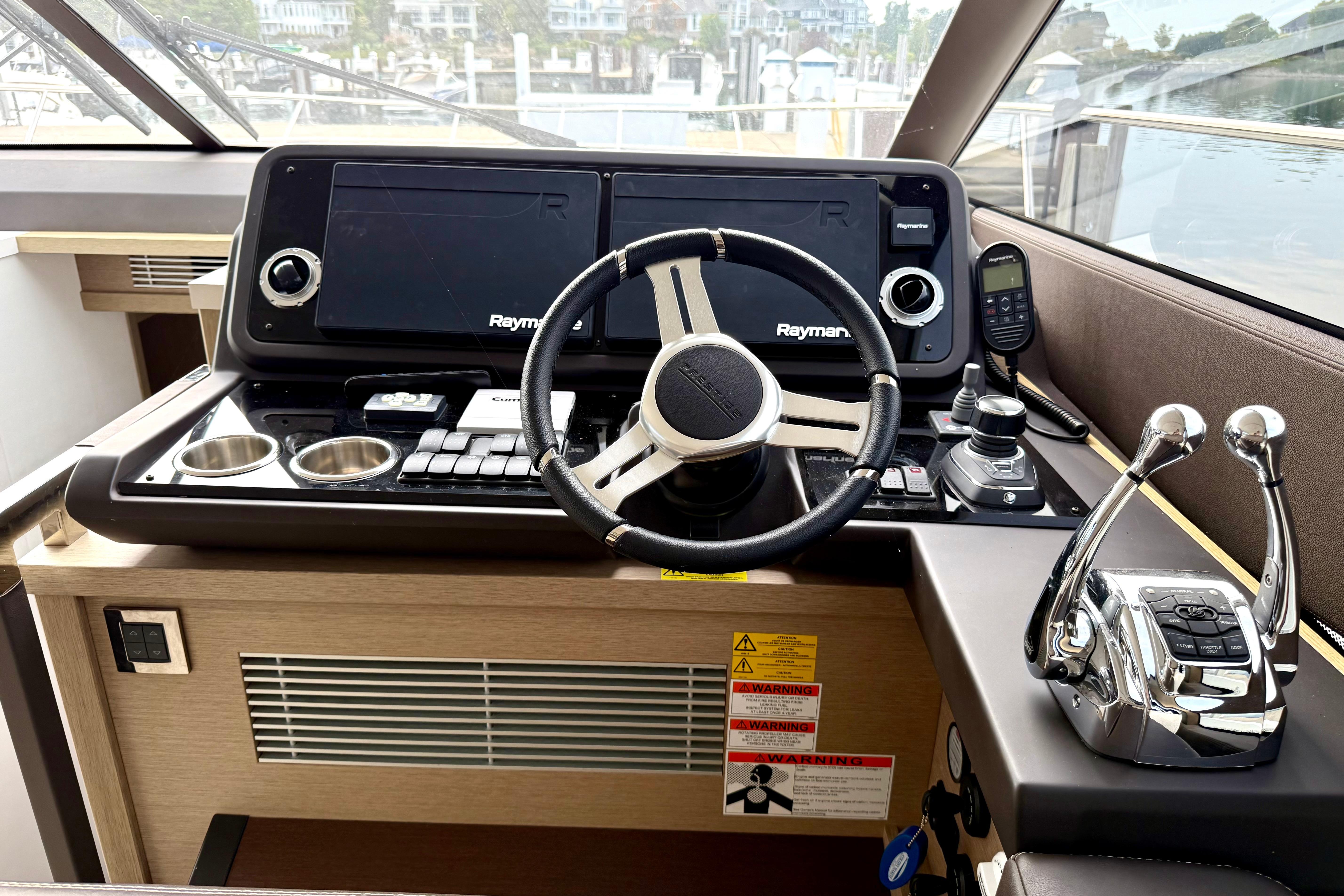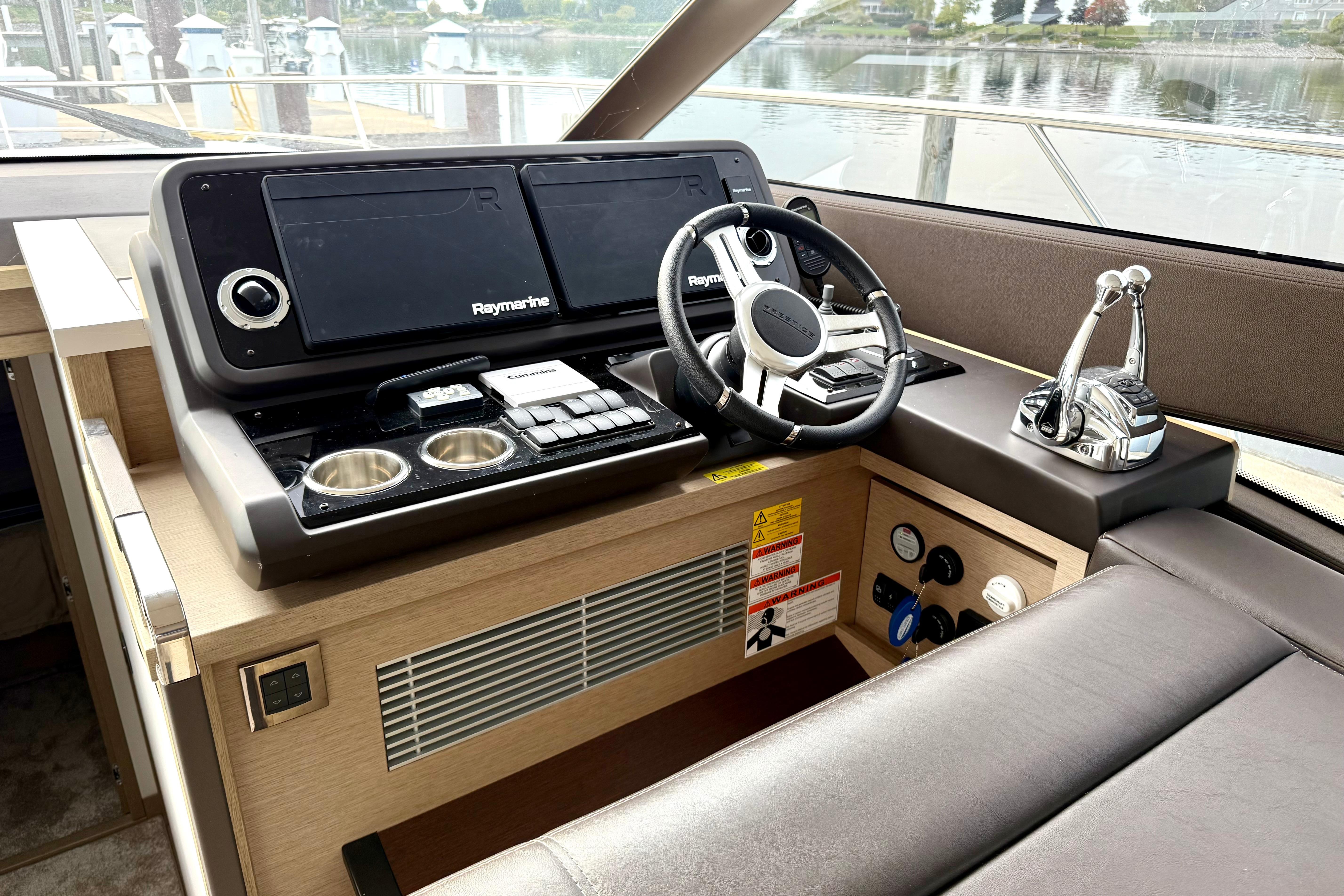 Both lower helm and flybridge helm feature joystick docking, digital engine displays, and multifunction navigation. Sightlines are excellent; side-door access at the lower helm makes single-handing a breeze.