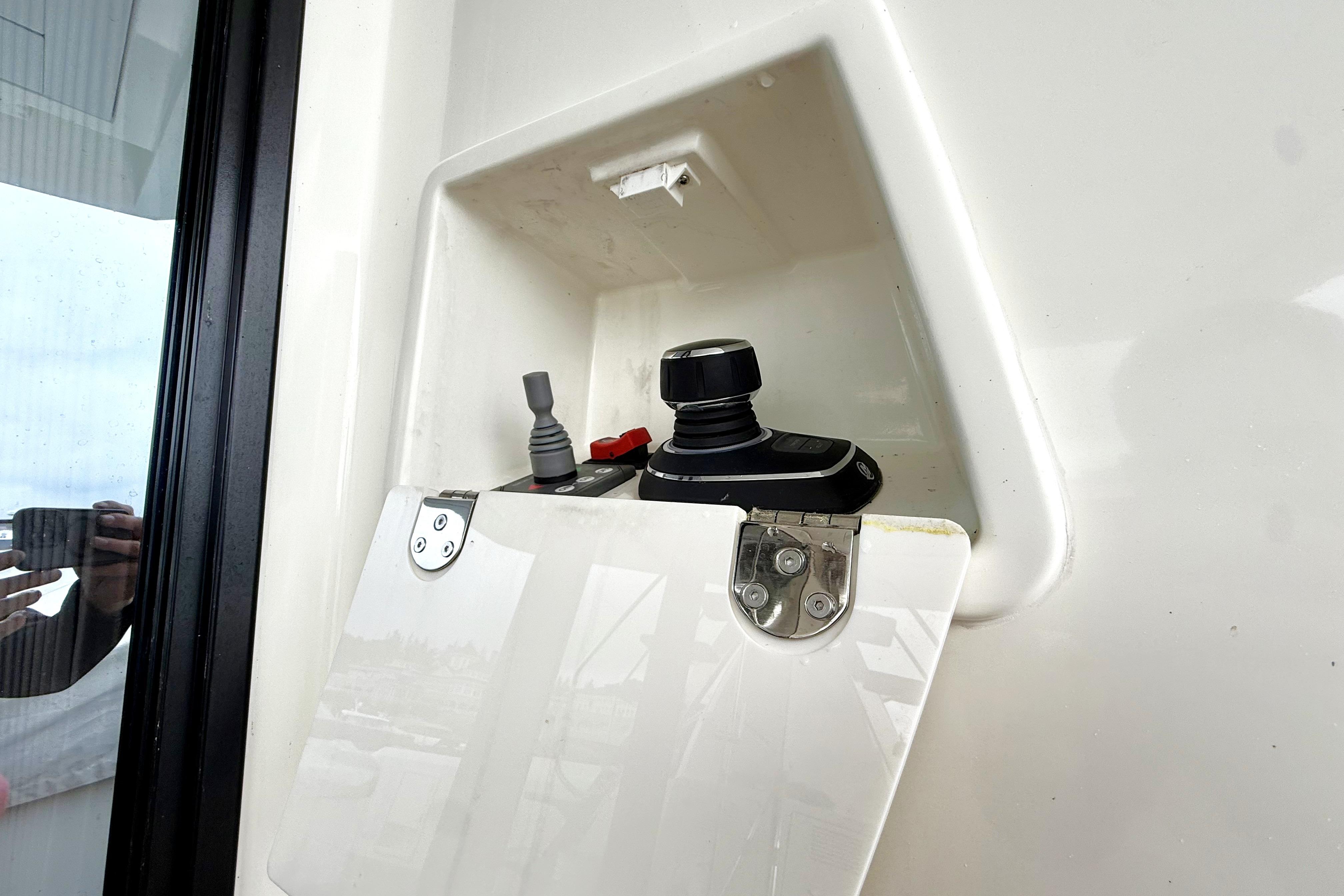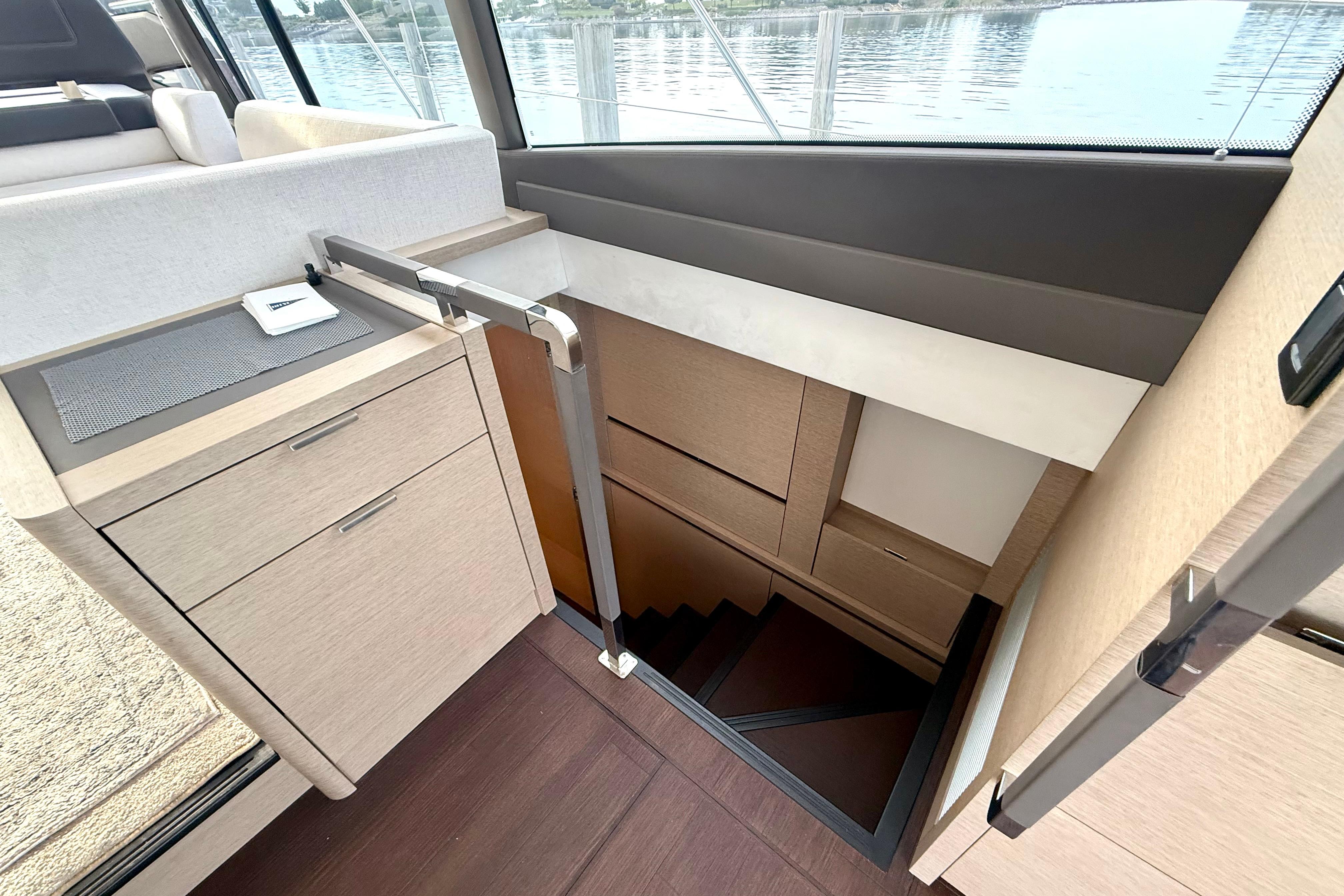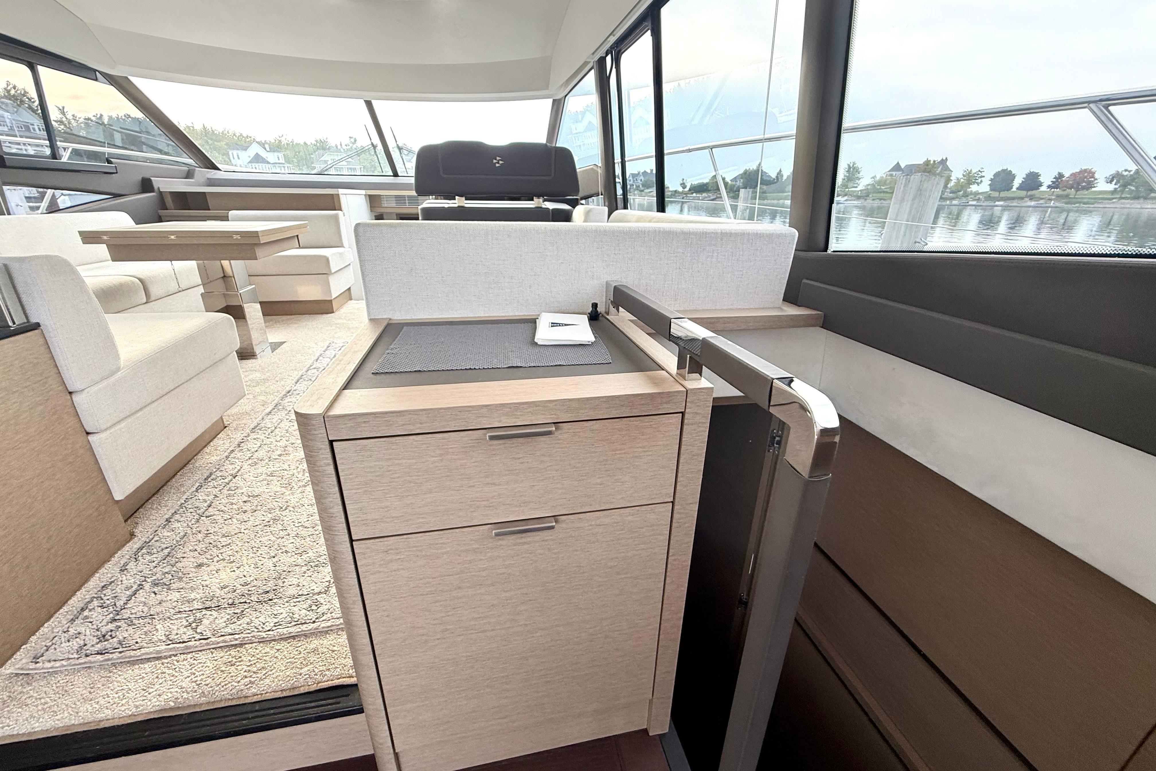 Both lower helm and flybridge helm feature joystick docking, digital engine displays, and multifunction navigation. Sightlines are excellent; side-door access at the lower helm makes single-handing a breeze.