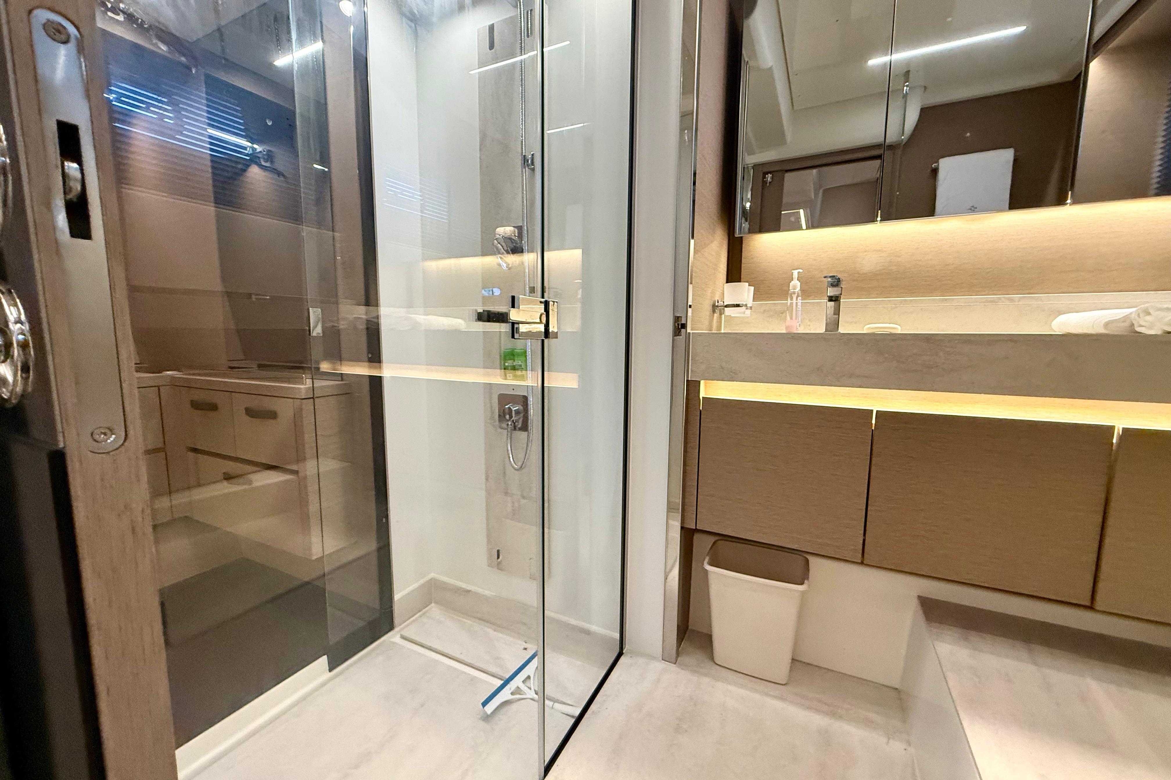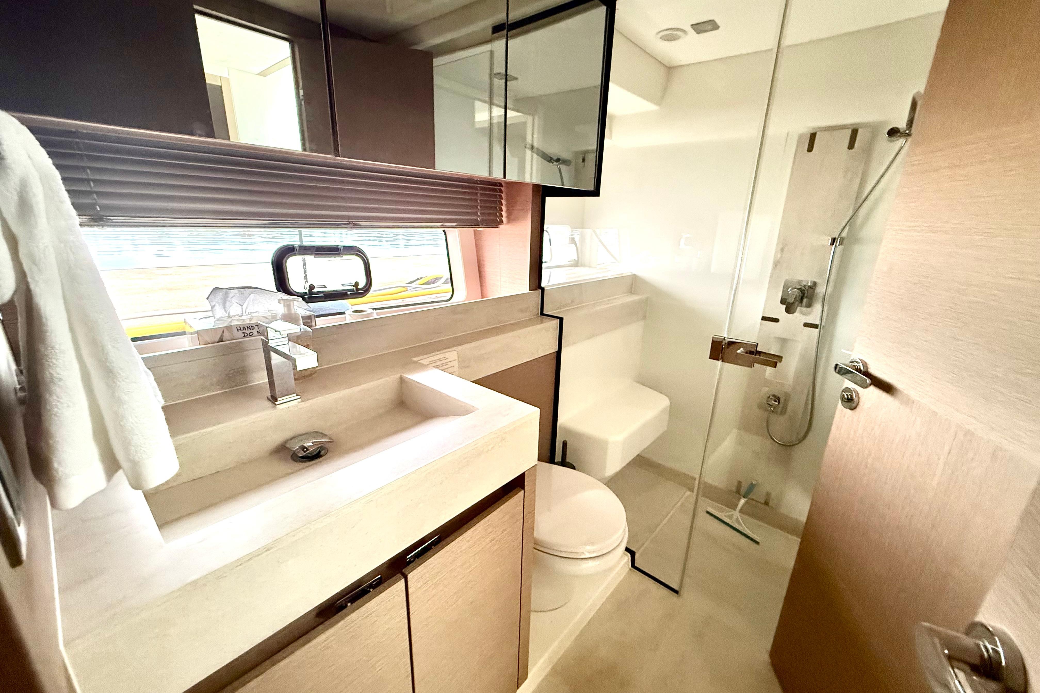 - Plumbing: Electric freshwater toilets, separate shower stalls, water heater