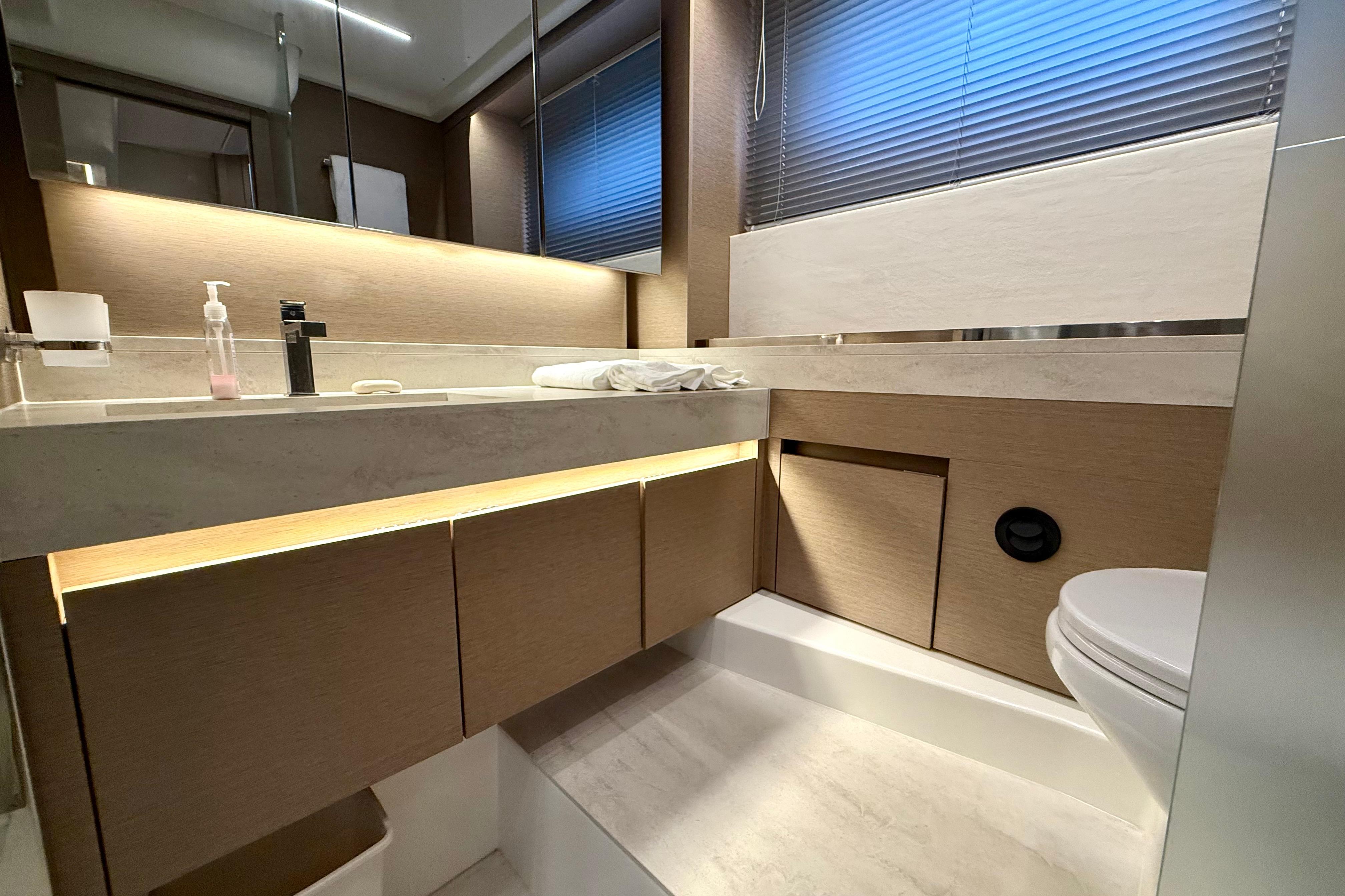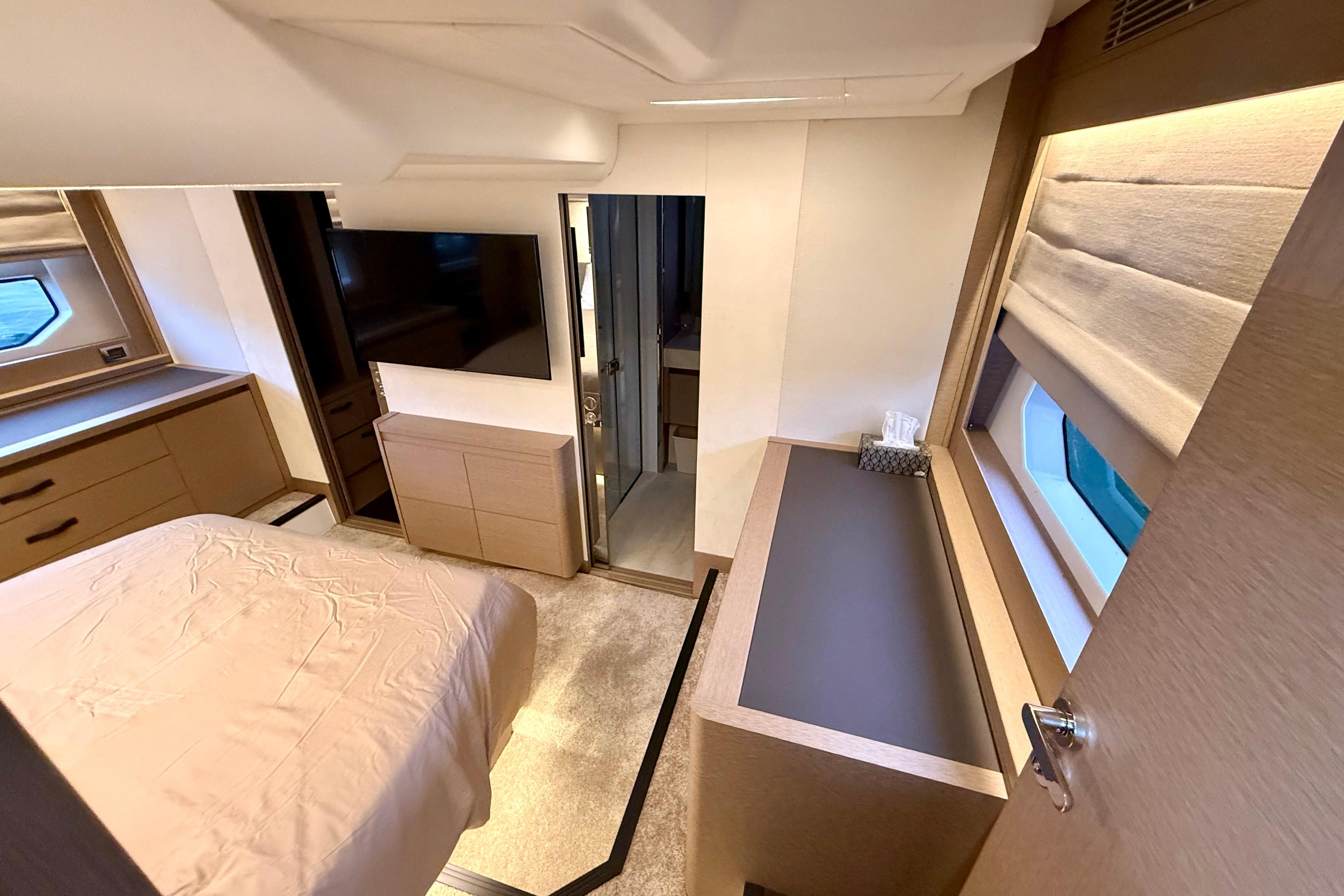 - Owner’s Suite (Full Beam, Midship): private entry, large hull windows, queen berth, settee/vanity, ensuite with separate shower, and walk-in closet.