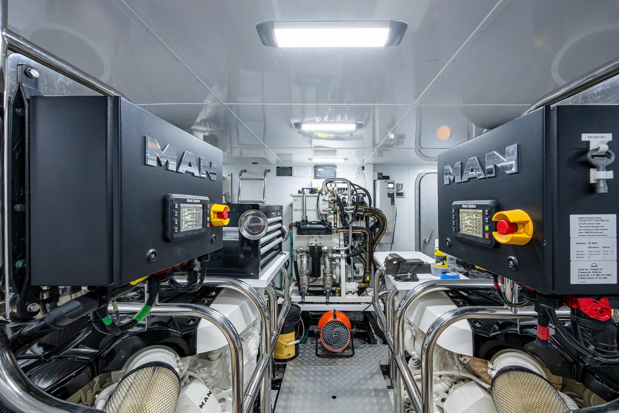 Experience space akin to a megayacht as you enter her main deck saloon and witness a line of sight right through to the forward window. Ascend the internal staircase to the upper deck and another unique experience awaits: a fully enclosed and climate controlled Sky Lounge. Taking pride of place on her lower deck is the full beam Master Stateroom with en suite, complemented by her Forward Stateroom with walk-in wardrobe and en suite bathroom. Additional port and starboard guest cabins can each be configured with two single beds or one double bed, whilst generous crew quarters complete her extensive accommodation.