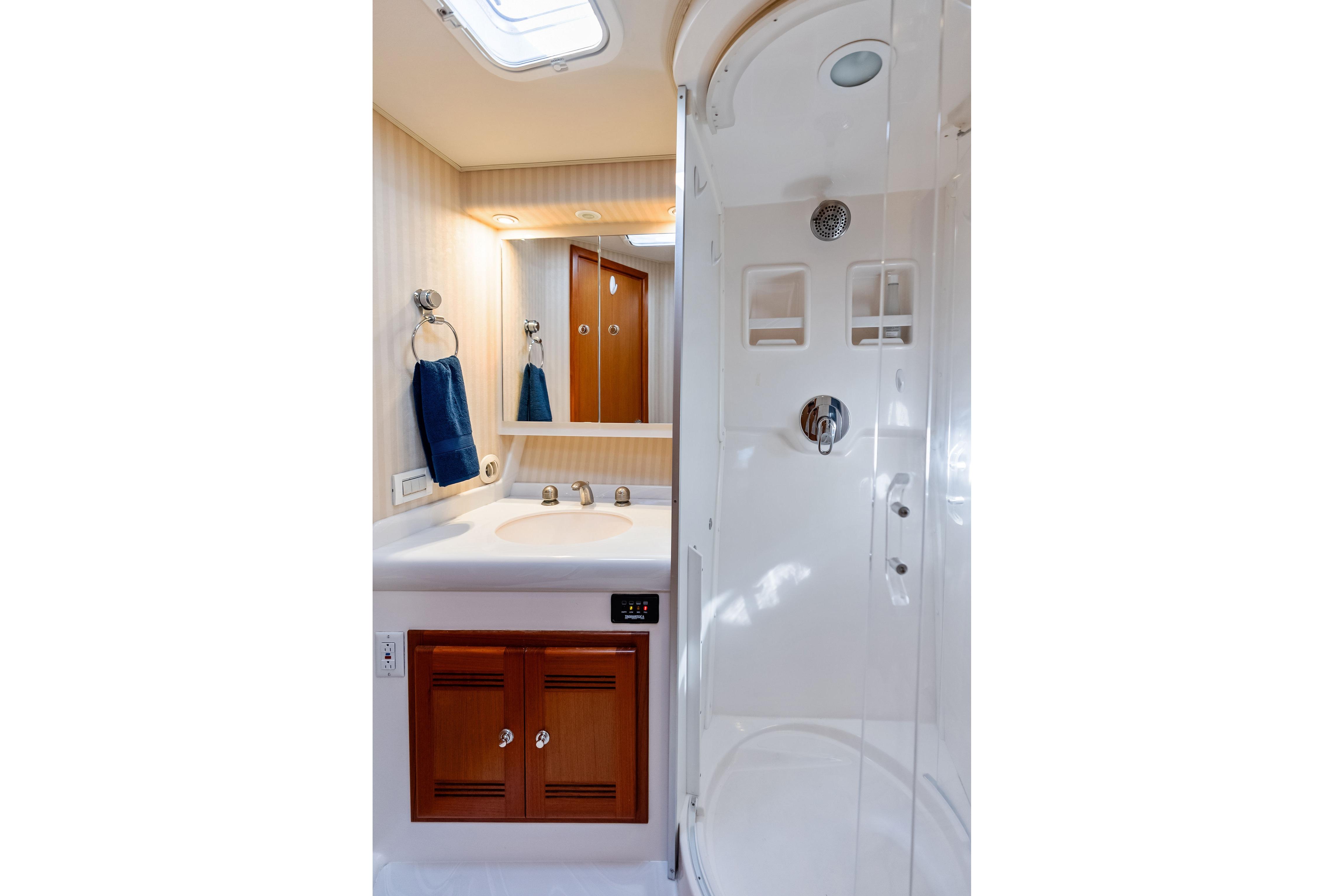 GALLEY & HEAD - The galley and full head with shower are outfitted with Corian countertops, custom sea rails, and Moen fixtures, combining functionality with elegant design.