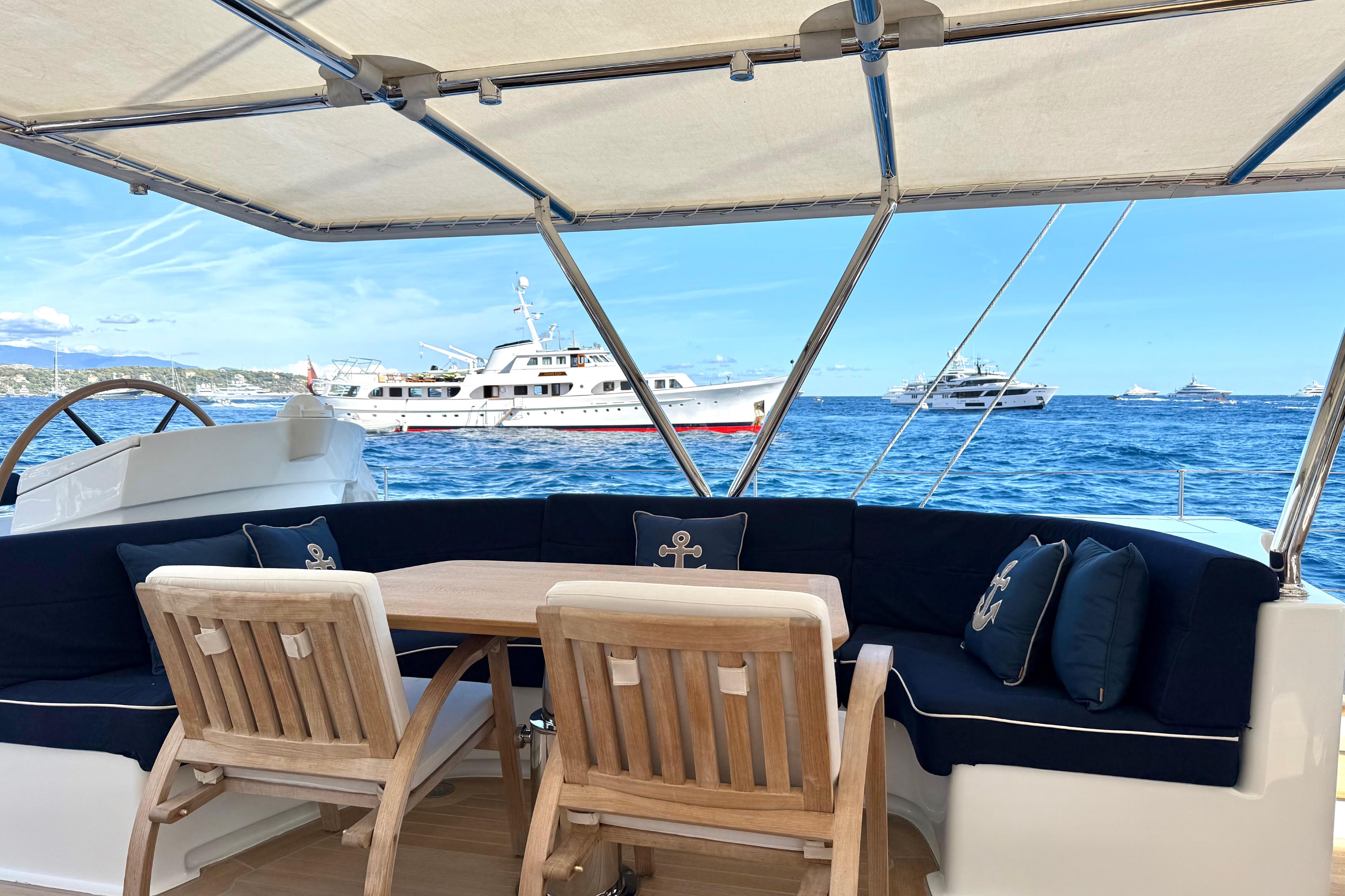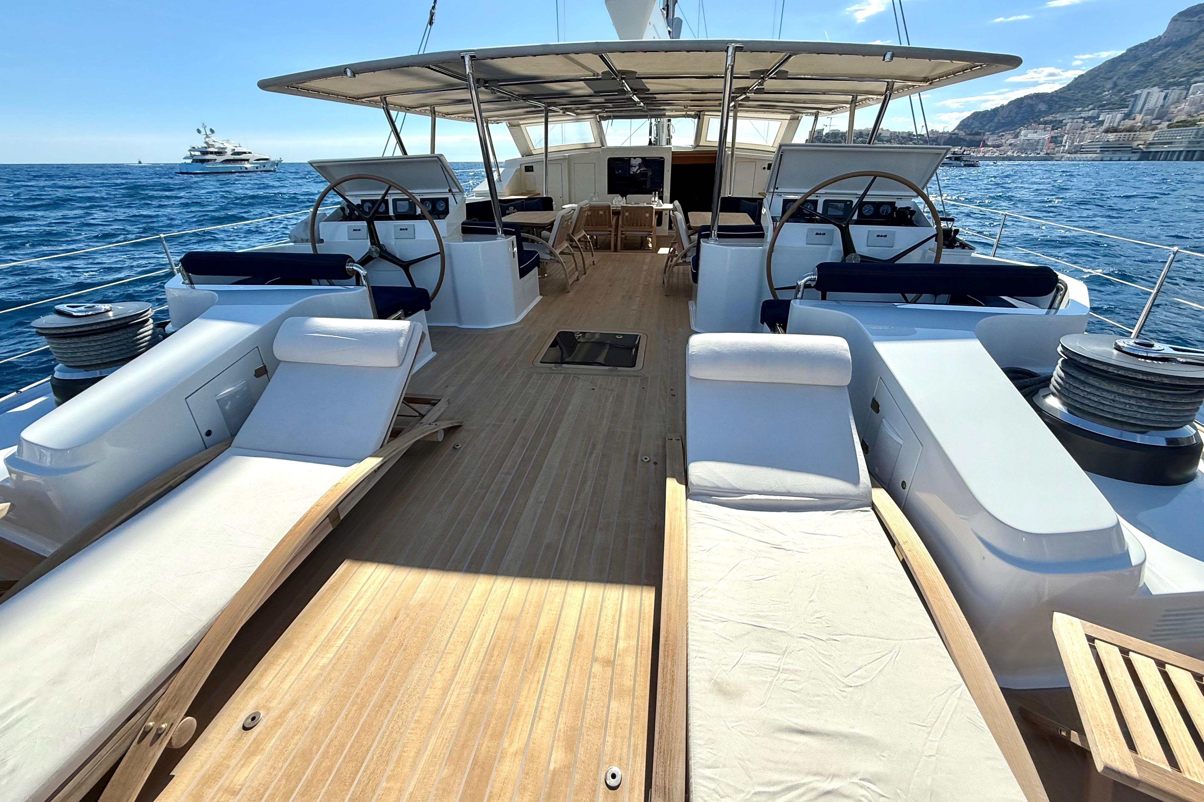 Il accueille 8 à 10 invités dans 4 cabines luxueuses (suite armateur, VIP, twin, cabine supplémentaire) avec salles d’eau privatives, et dispose d’un équipage de 5 à 6 personnes. L’intérieur signé Eva Cadio & Co combine élégance et raffinement.