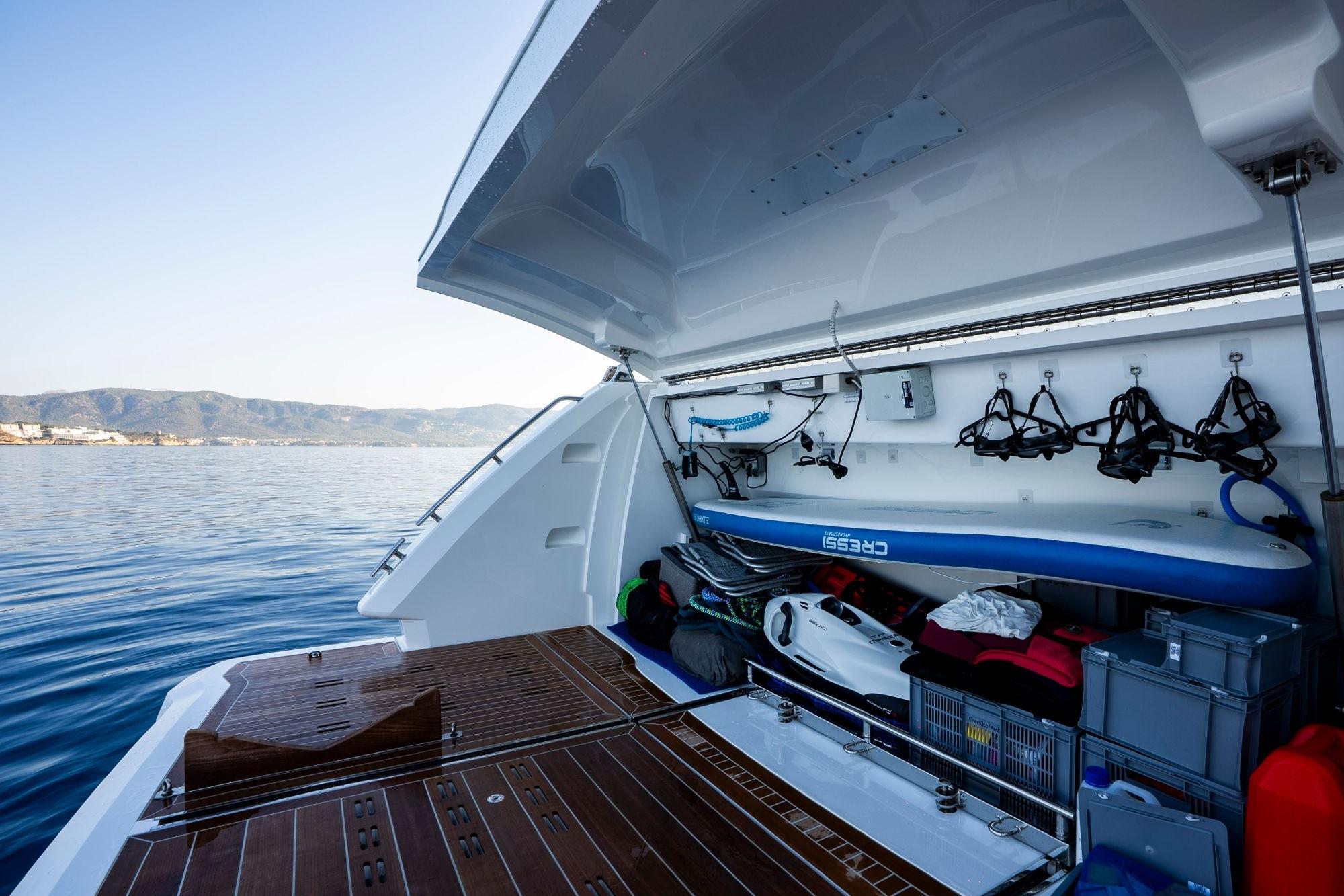 She is also specified with the ski garage, providing excellent storage for a Sea-Doo Spark jet ski. The flybridge aft has been thoughtfully configured with the hard top, upgraded wet bar equipment, and an aft sun pad.