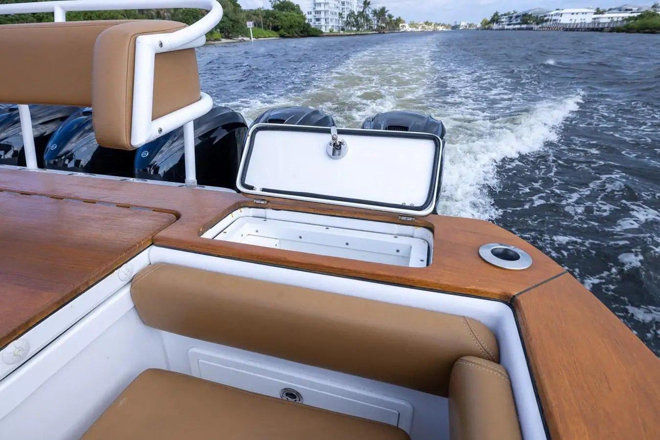 - Seating - Transom Cooler Seats, 28 Qt, Port and Starboard with Cushions and Backrests Seating - Helm Chairs for 5 with Swivel and Vertical Adjustment; Fold Down Footrests and Custom Ladder Backs