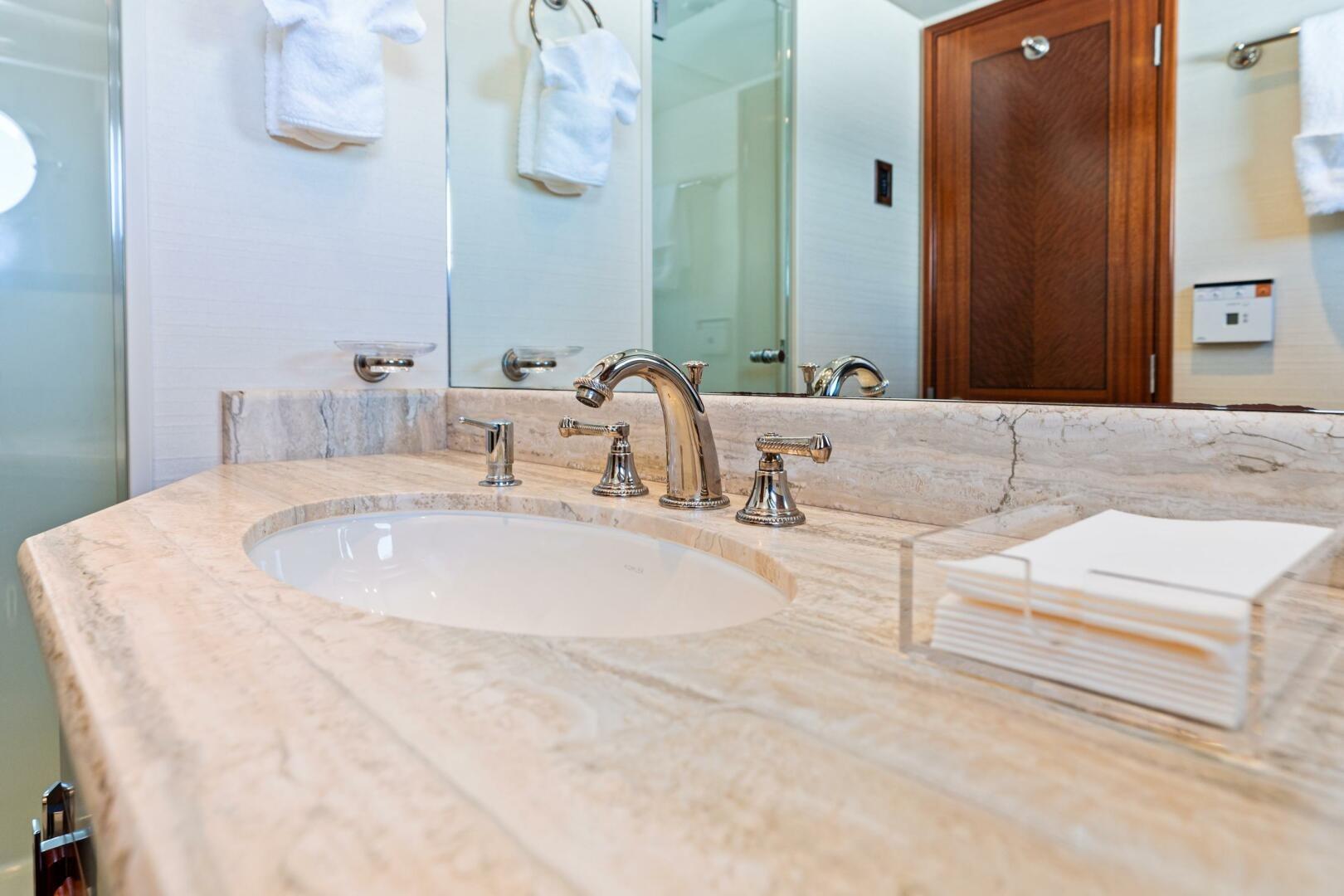 • Port and starboard companionway foyers with double entry doors and custom stone flooring; starboard entry niche with stone-topped foyer table and mirror
