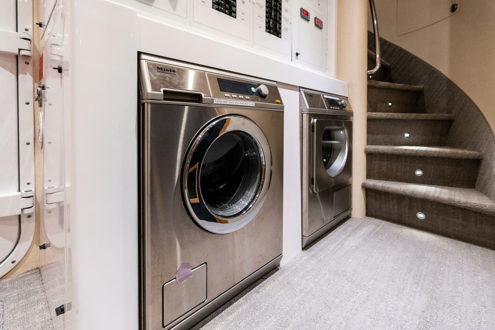 The crew quarters, utility room, and engine room can be accessed either via the spiral staircase descending from the aft deck or through the transom door located on the swim platform. Forward to port is the spacious crew galley, with the engine room door positioned forward and center. To starboard, the yacht’s main electrical distribution panel is located, along with a secondary washer and dryer unit beneath. Opposite the galley and aft is an L-shaped upholstered crew lounge, complete with a settee table for dining or relaxation. The captain’s stateroom is situated to port and features a double bed, desk, and a private ensuite head with shower. The second crew stateroom lies to starboard with over/under berths, while the third crew cabin is located aft to starboard, also with over/under berths. These two staterooms share a head with a shower. Aft to port is the utility area, equipped with dual Glendinning Cablemaster shore cord bins, a freezer, a Manitowoc commercial icemaker, and additional storage for accessories. The watertight transom door providing access to the swim platform is located on the centerline at the aft end of this area.