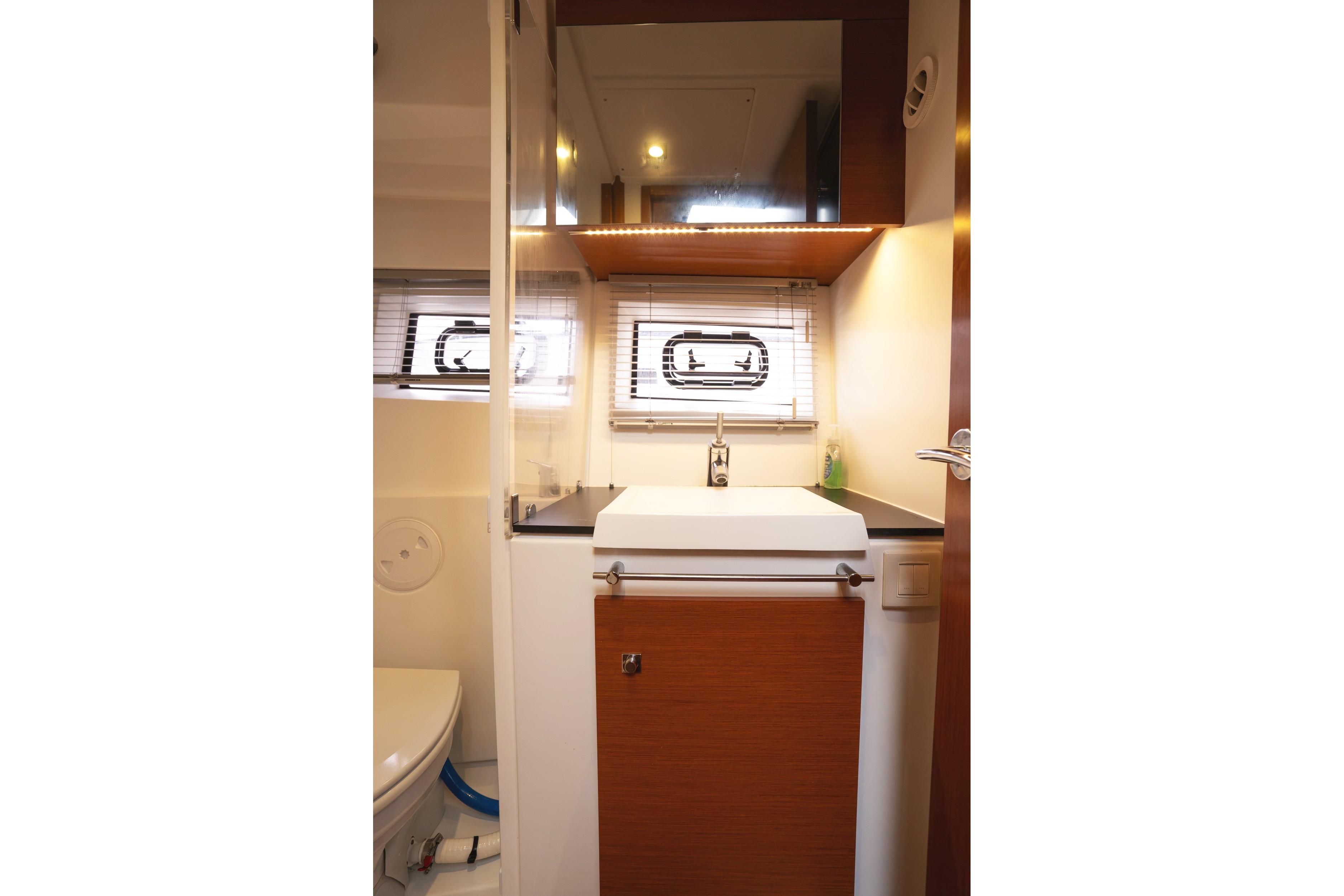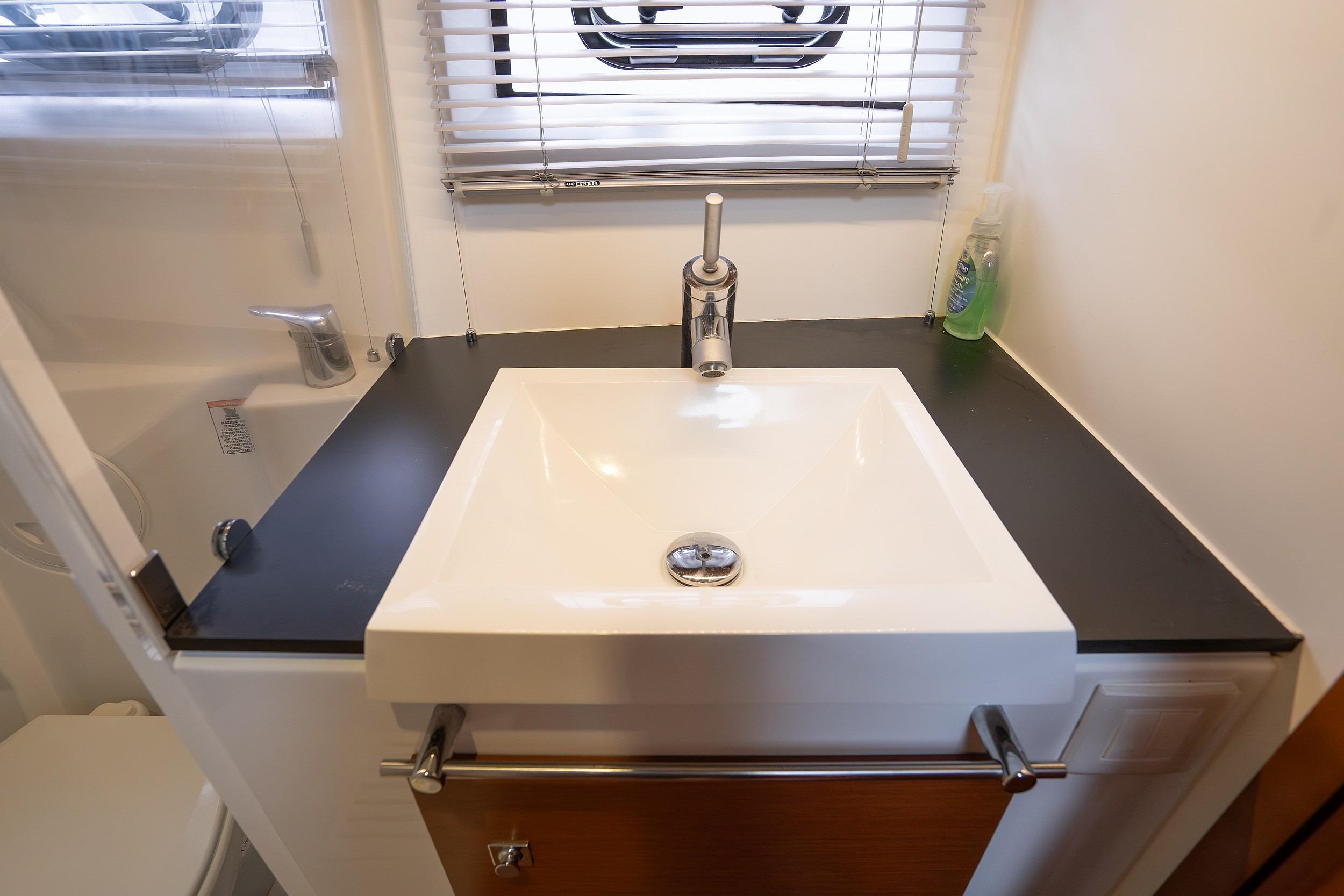 Inside she boasts a two-stateroom, two-head configuration, offering generous accommodations for extended cruising. The forward master stateroom features a queen island berth, ample storage, and an ensuite head. The amidship guest cabin includes two side by side twins which can be combined to create one large berth.