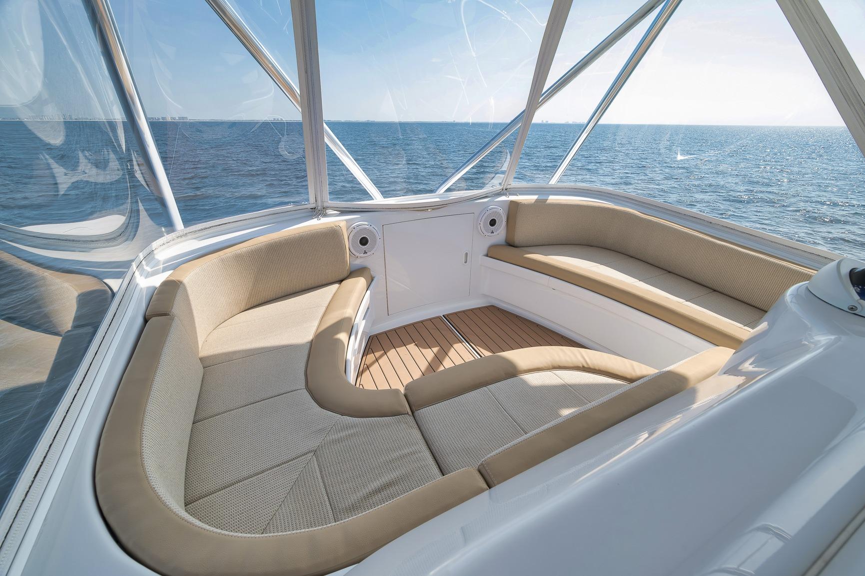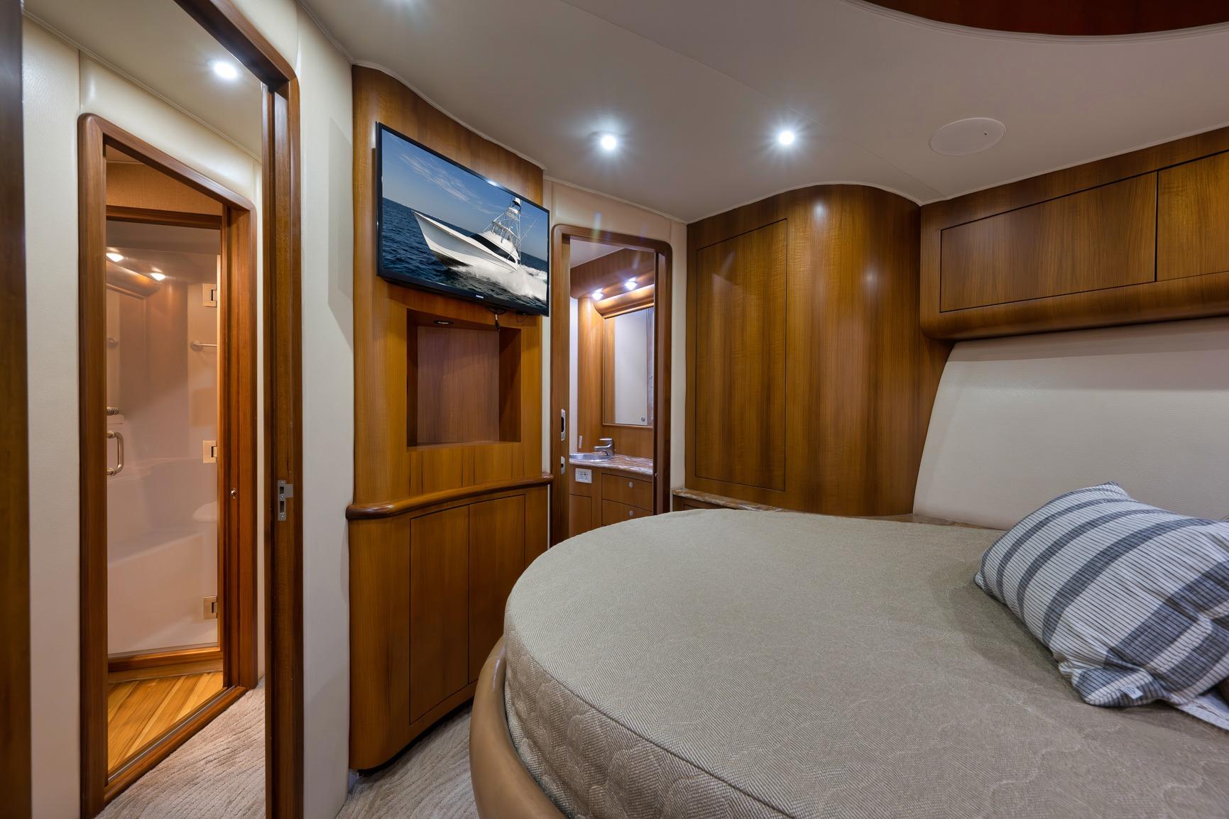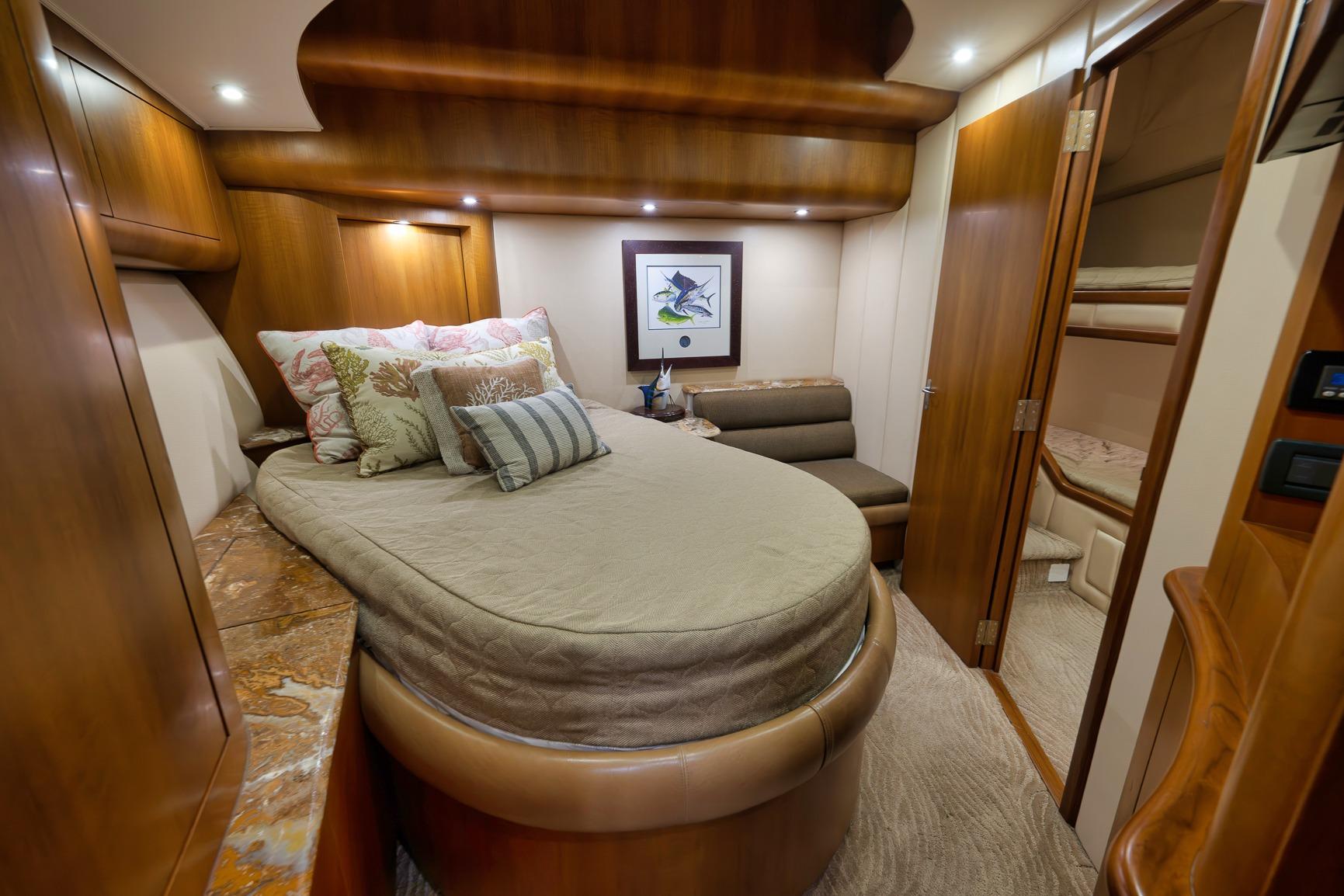 Vessel WalkthroughEntering the salon you will find a large spacious layout with beautiful wood finishes, two custom leather sofas, and a large teak coffee table. Moving forward to the galley, this area has custom stone counter tops, a custom bar top with high polished stainless steel bar stools, roomy custom refrigeration drawers, and freezer space. Moving down the companionway to the port are two over/under berths with personal TVs and receivers. Continuing forward to starboard is the master suite with a full size queen berth, dressing area, and love seat. The master also houses a full ensuite head with shower, teak vanity, and onyx counter tops. Next moving forward is the day head with a full shower. Forward to the bow area is the forward stateroom with two spacious over/under berths. This room is very private for a couples excursion. This vessel is equipped with the latest sonar and two seakeepers.