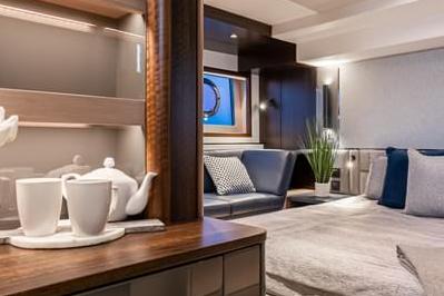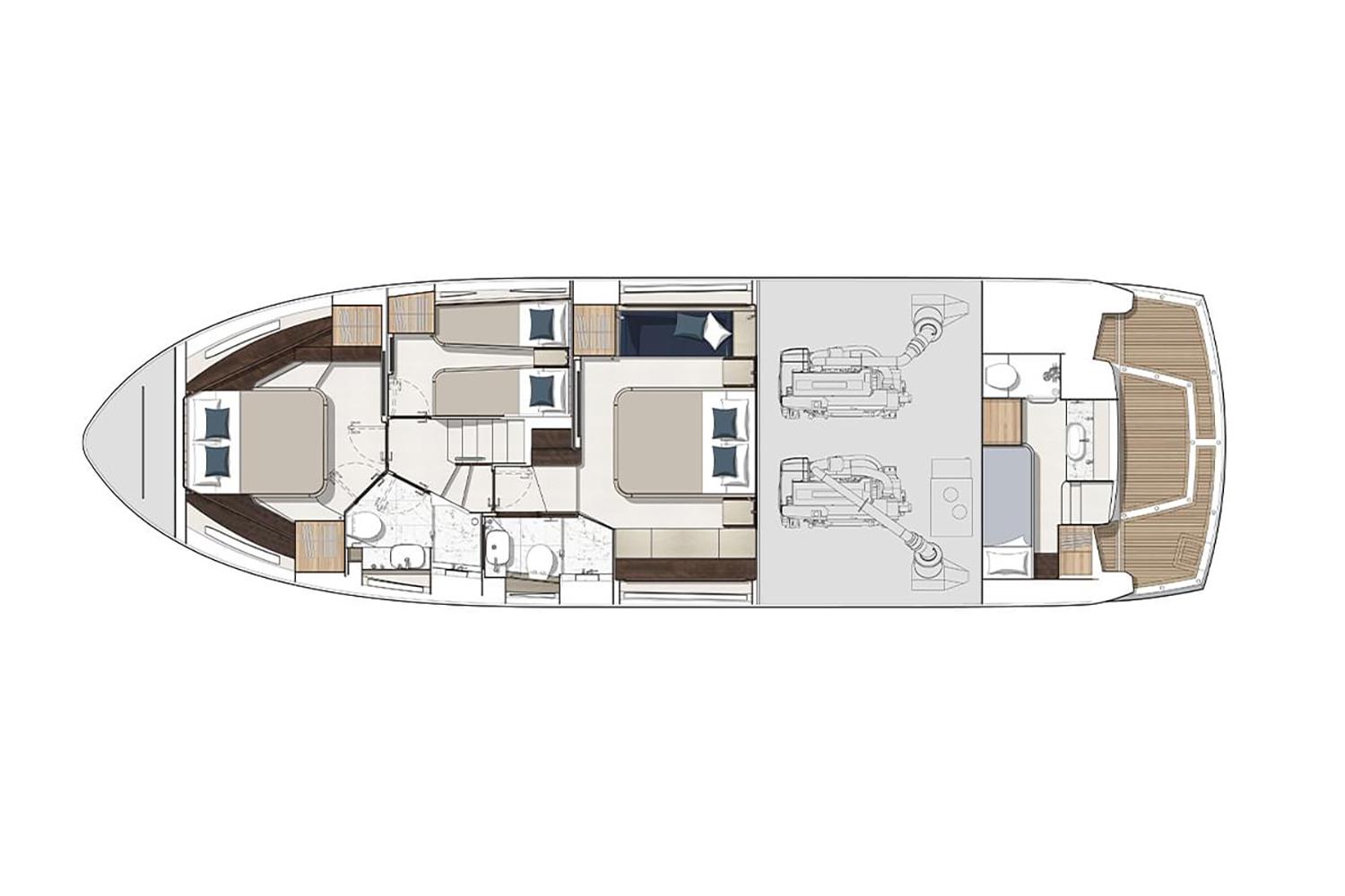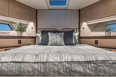 The Manhattan 55 enables its owner to enjoy ample space afforded by its open layout, showcasing the wonderfully well-equipped bathing platform and Beach Club. This area offers an inviting space for family and friends to enjoy the optional built-in barbeque, overhead shower and fold-down transom seating. Powered by Volvo Penta D13-800 engines, the Manhattan 55 can cruise comfortably at 25 knots with a range of 250 nautical miles or achieve in excess of 30 knots at full throttle.