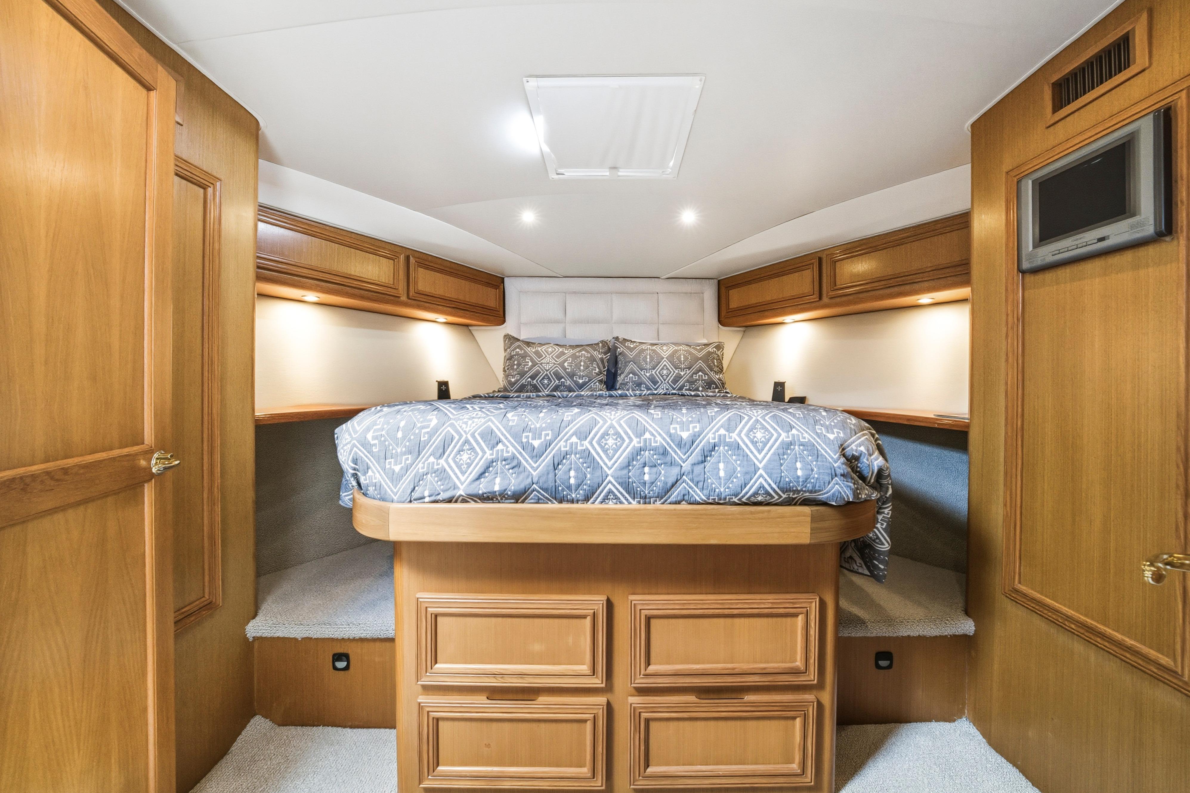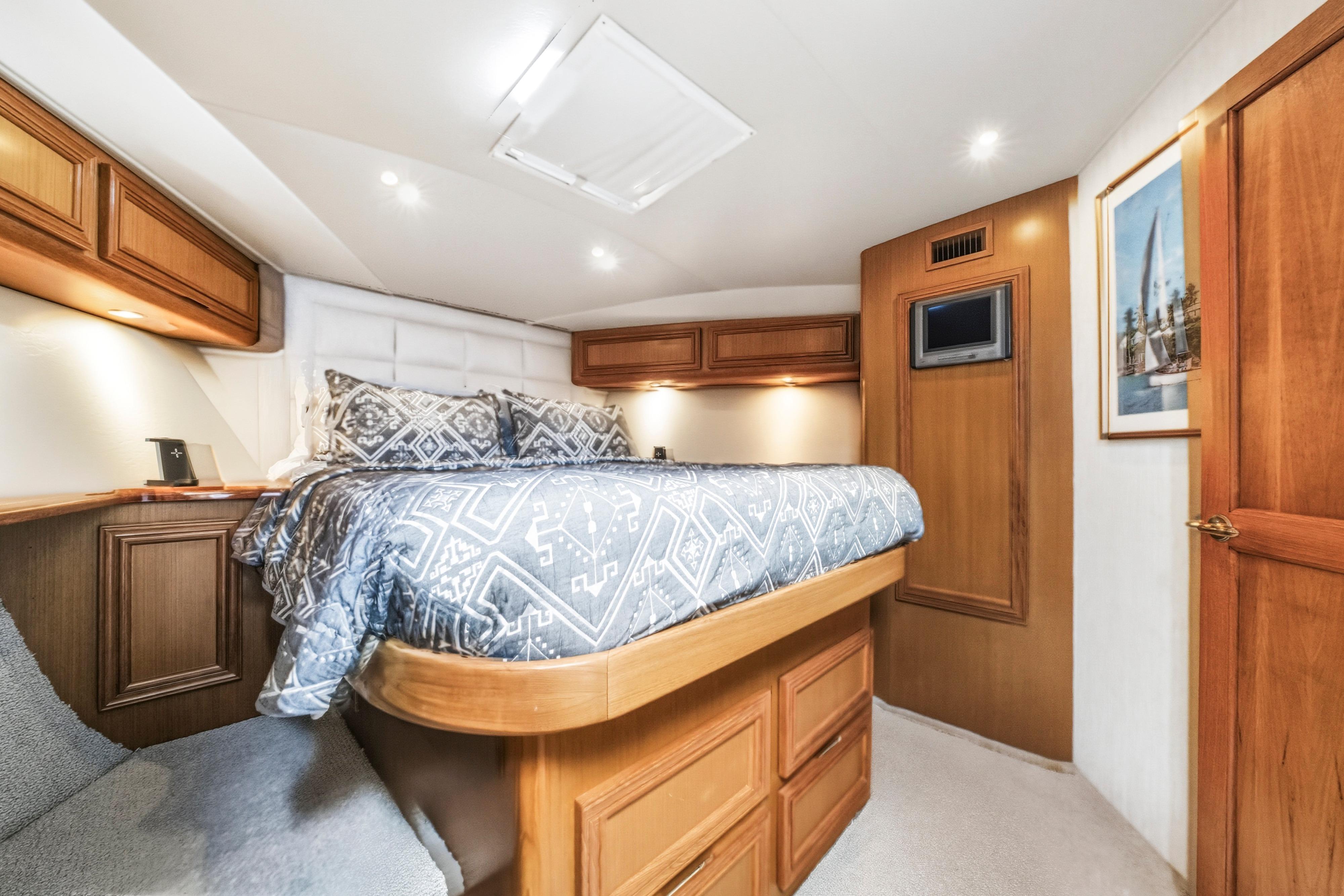 The 48' Cavileer has one of the largest interiors in her class! Three staterooms and two heads. Forward master stateroom has a queen berth and en-suite head and shower. Starboard is a guest over under bunks and to port a guest side by side that can be made to a queen.