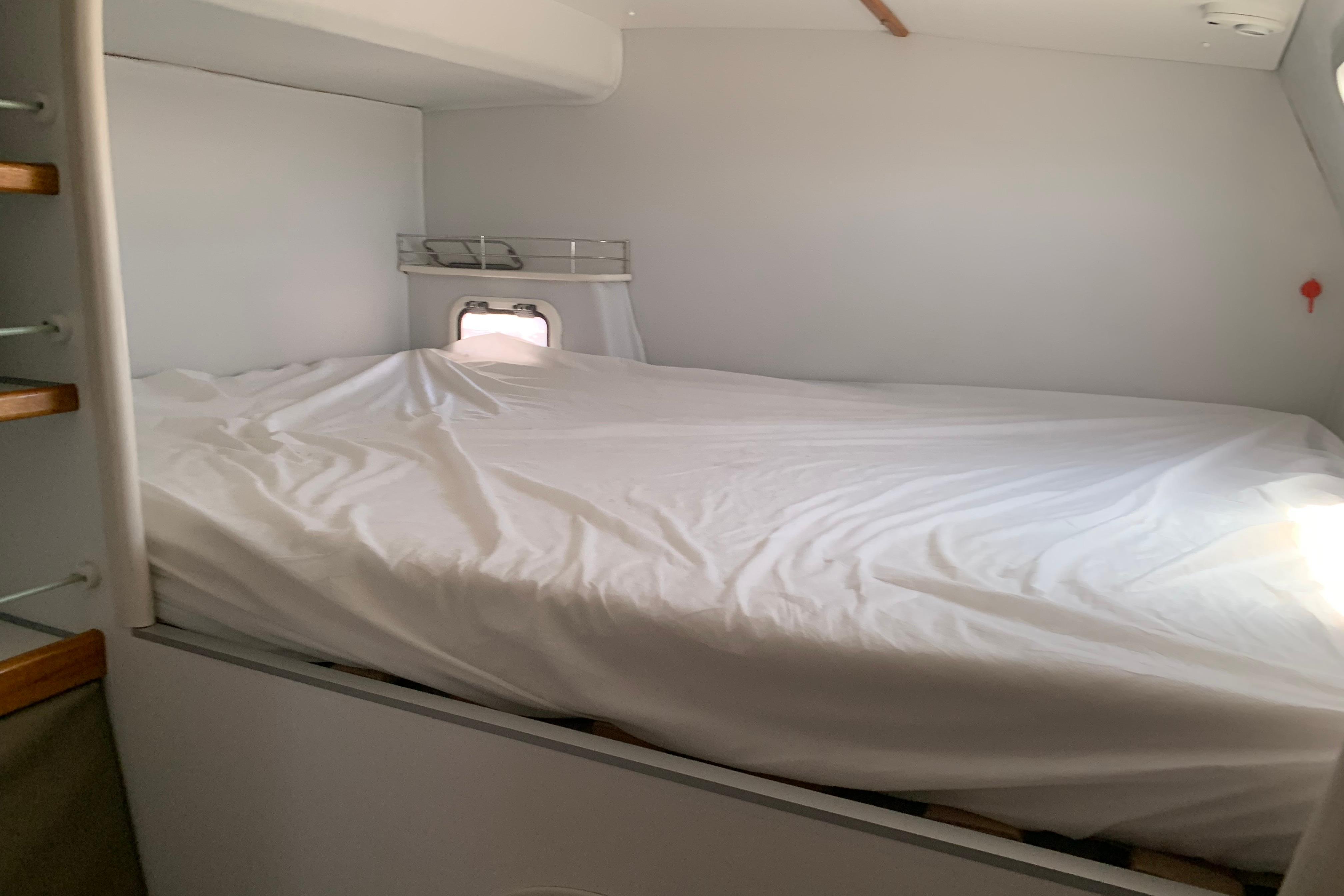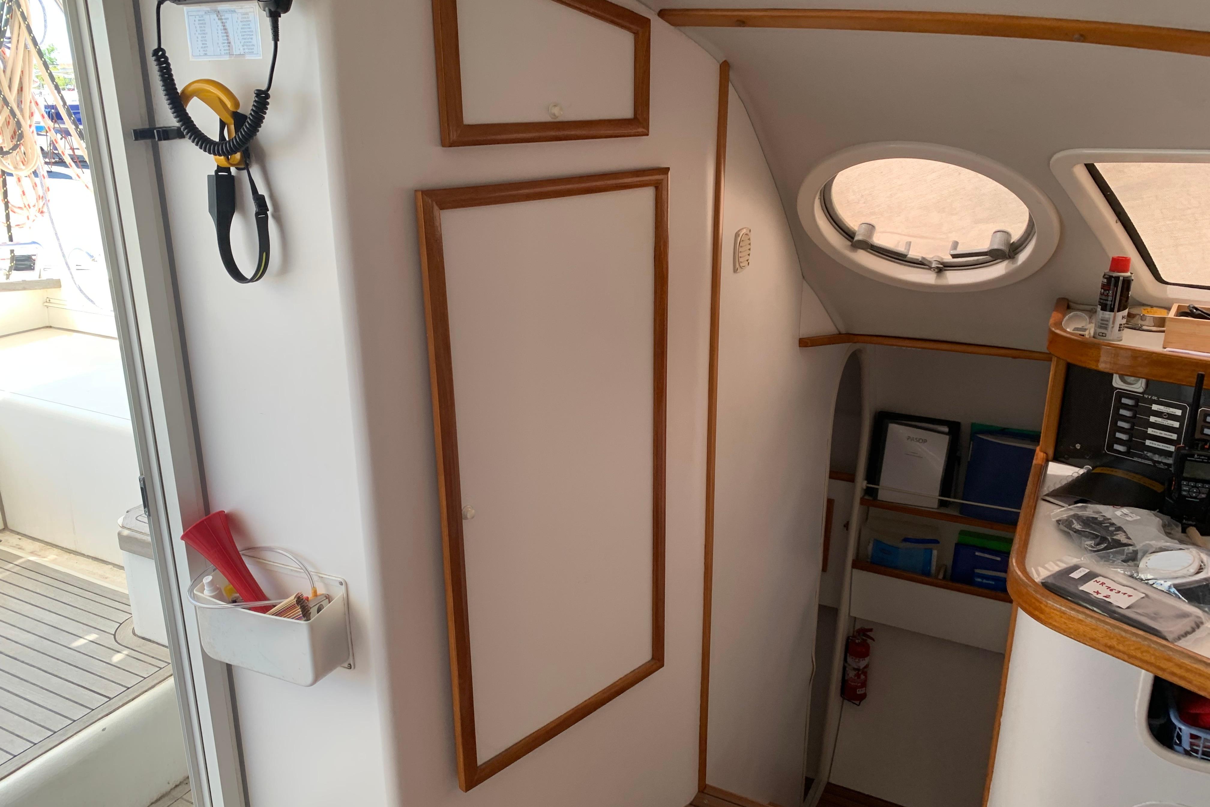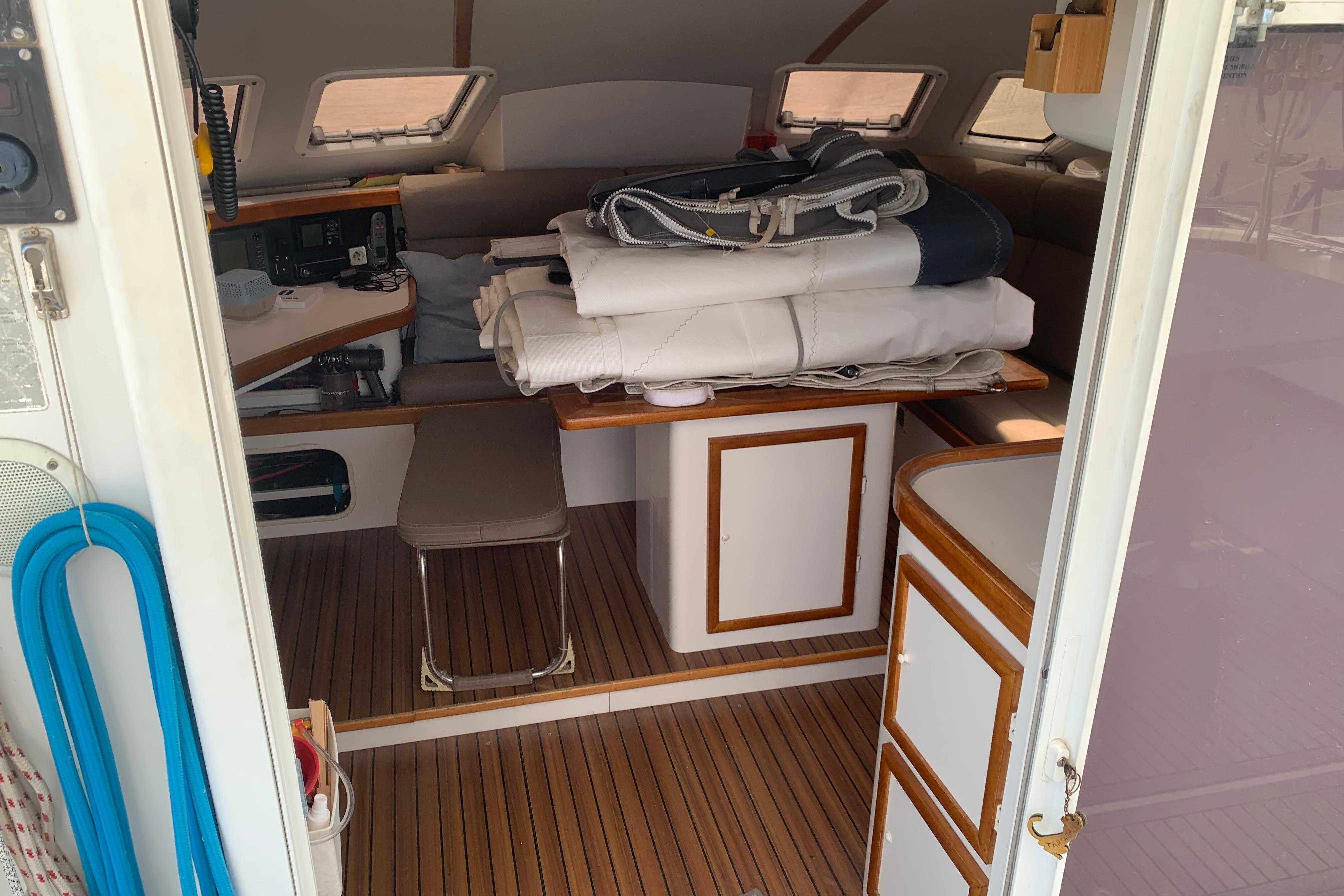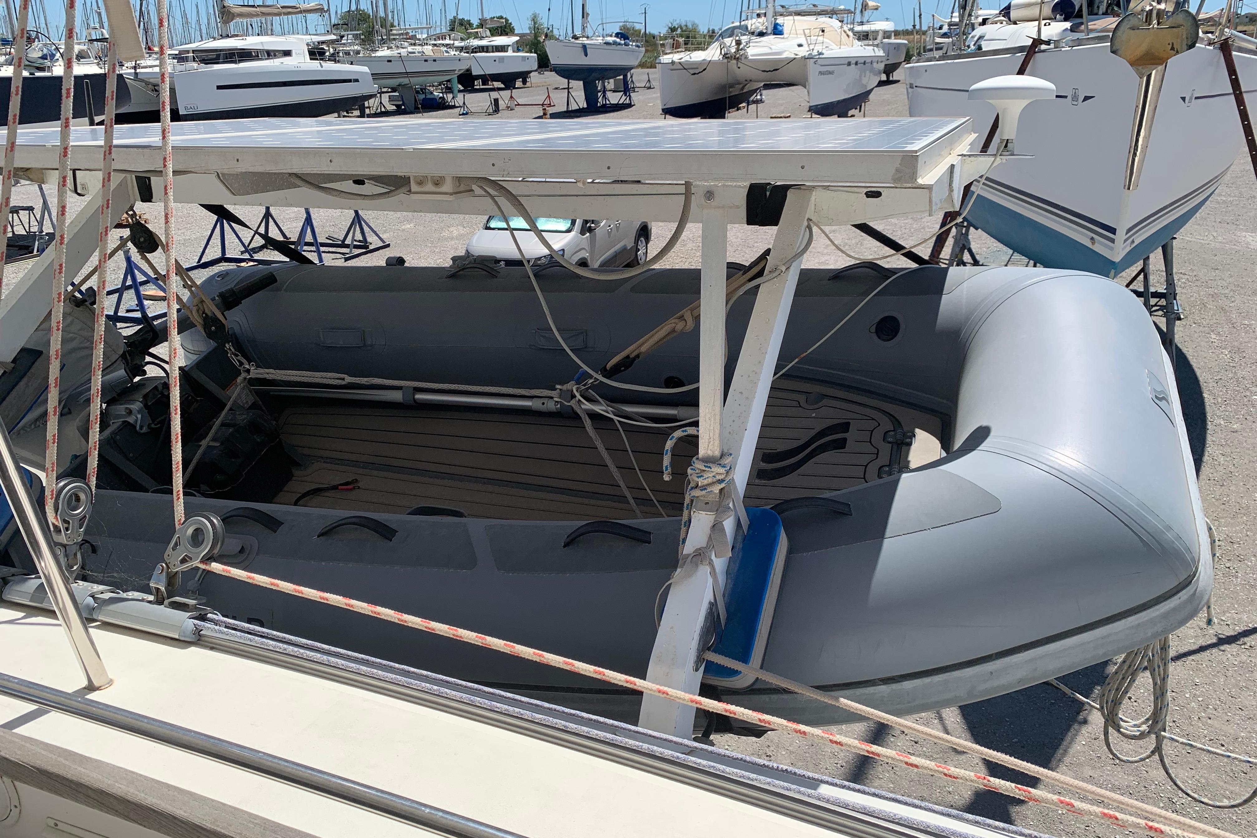 Sur le pont, on retrouve un bimini rigide avec récupérateur d’eau, un cockpit habillé en teck, un guindeau électrique récent, une annexe Highfield 340 avec moteur Honda 20 cv (2023) ainsi qu’un équipement de sécurité complet incluant un radeau de survie 8 places. L’électronique est fiable et fonctionnelle, comprenant radar Furuno, AIS, GPS, pilote automatique hydraulique et affichage Raymarine au poste de barre. L’énergie est assurée par 4 batteries lithium 100 Ah "neuves" (2023), trois panneaux solaires de 180 W, alternateurs et régulateurs neufs (2025), garantissant autonomie et tranquillité. Enfin, le confort à bord est renforcé par un dessalinisateur Dessalator D60 12V et de larges capacités d’eau douce.