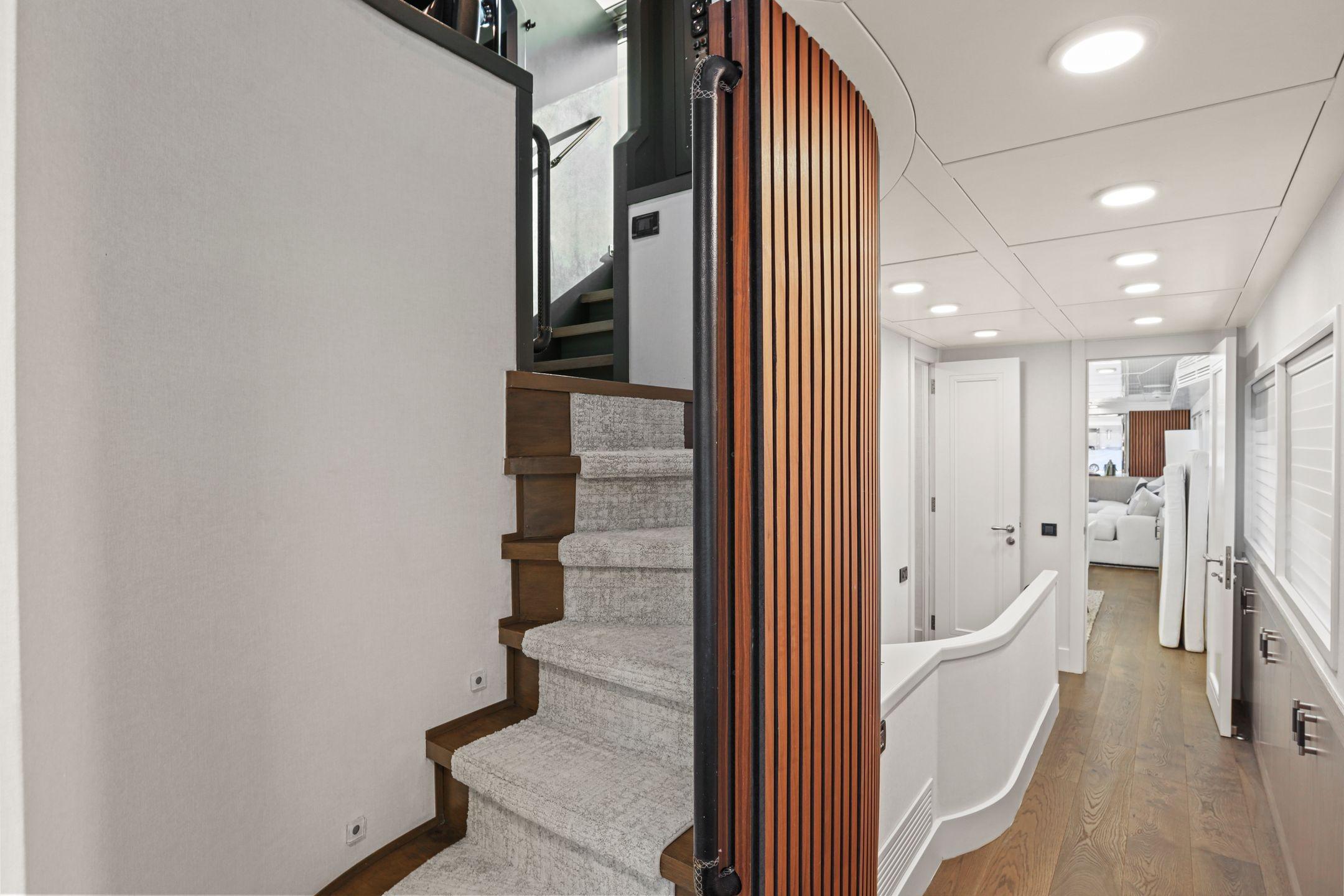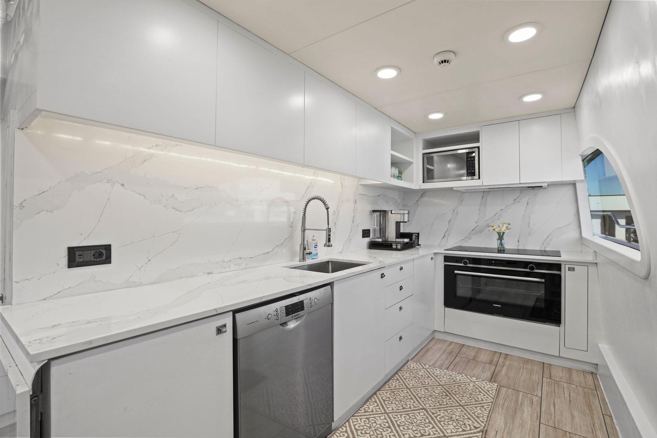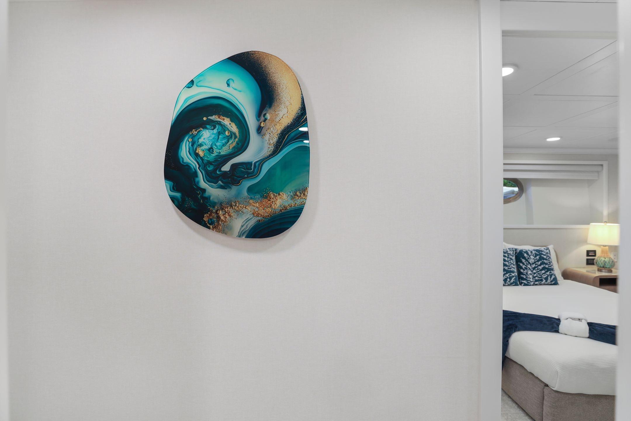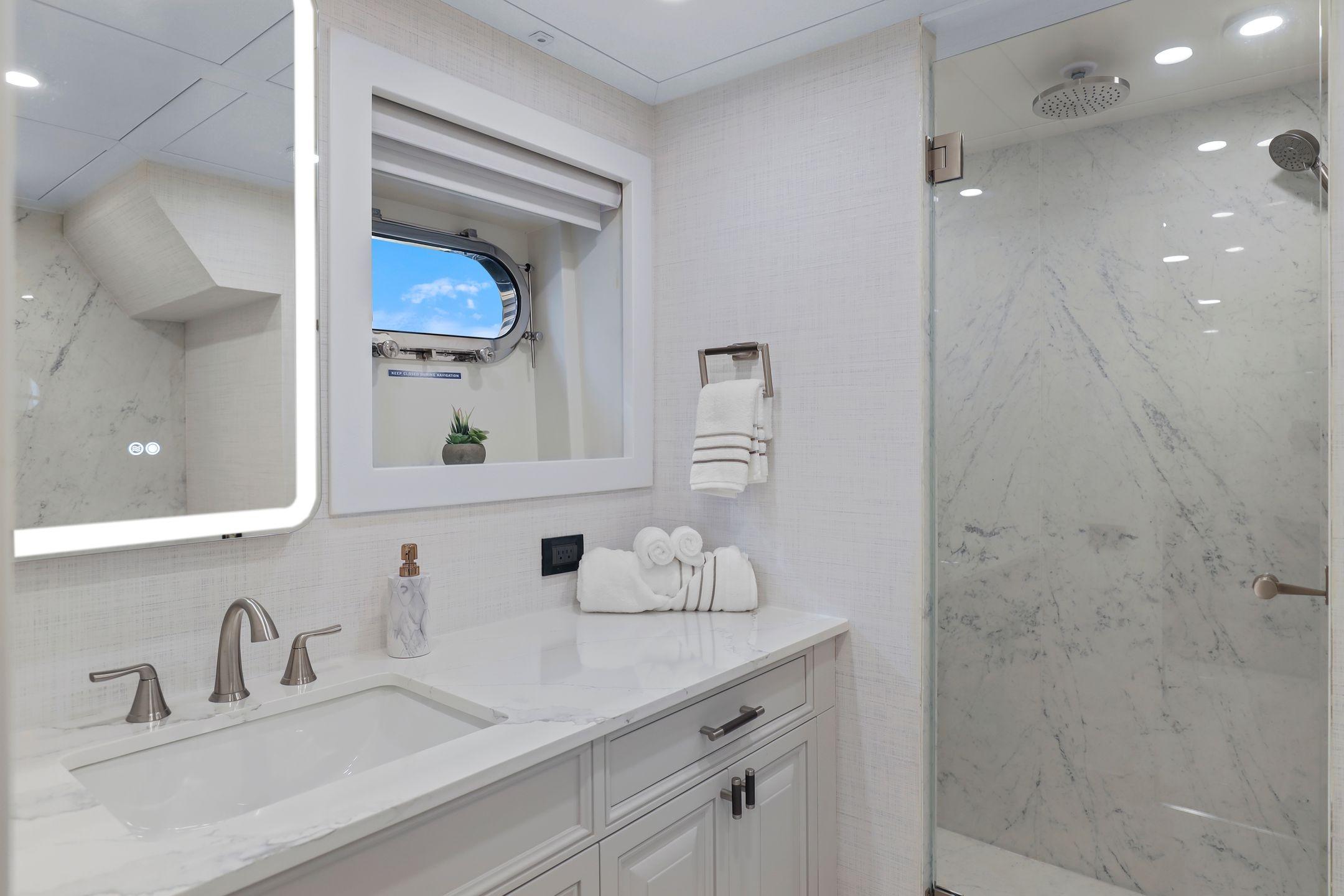 The refit just completed on PANACEA is noting short of amazing. Everything on the interior has been touched from every piece of interior wood & cabinetry, flooring, wall coverings, LED lighting retrofit, quartz counters in heads & galley, custom SkinRock Carrara marble in heads, fixtures, updated AV, AC system serviced, custom furniture, and the list goes on. Oh and that's just for the interior. The exterior also just received a huge upgrade with all new soft goods, deck furniture, rebuilt hot tub, refreshed teak & caulking, and also a complete paint job by Luu at LMC in 2022. The engine room also just received a makeover with complete services including heat exchangers and aftercoolers to the Cat C32 mains, generators and transmissions. The engine room floor and entry way was also freshly powdercoated.