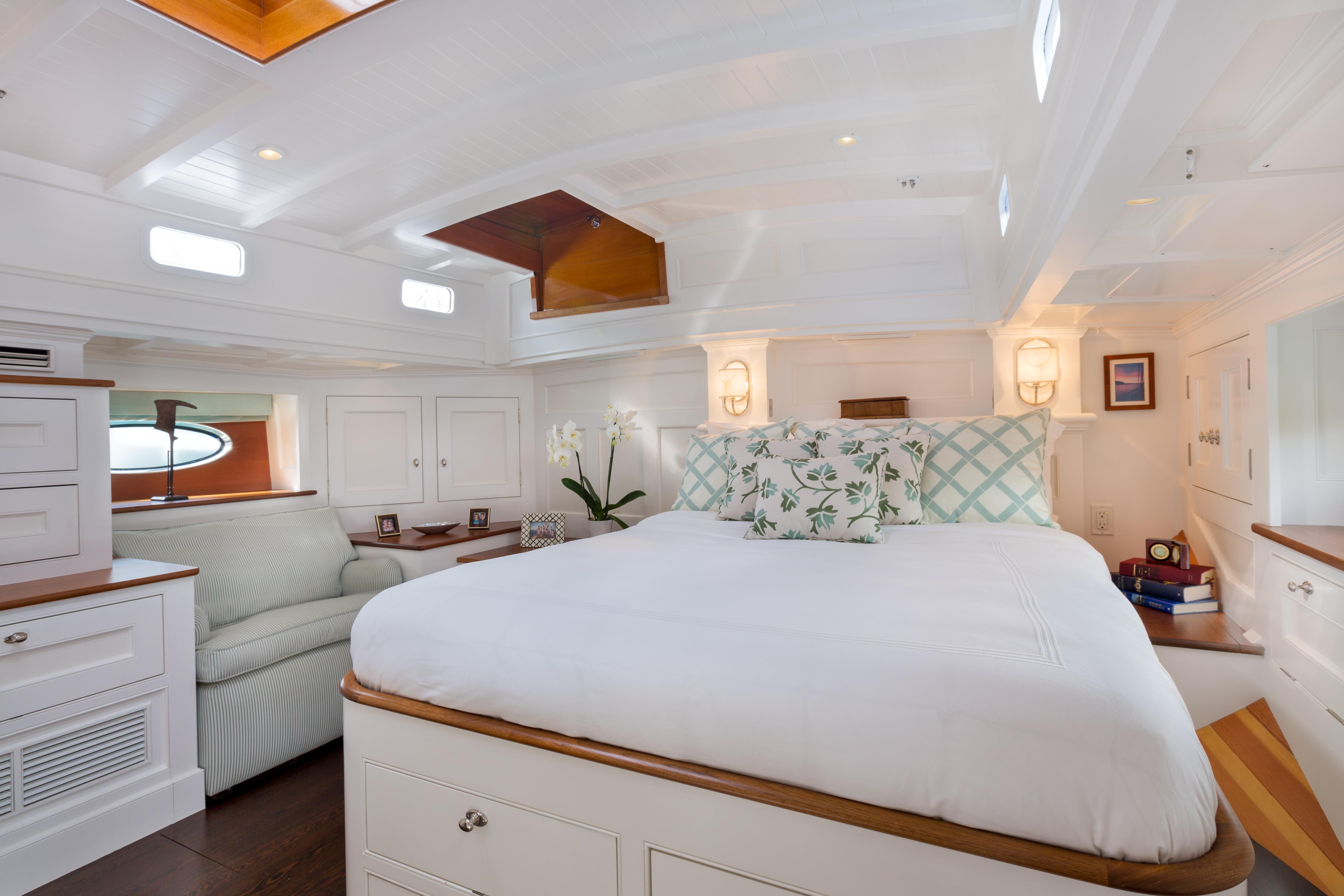 MASTER STATEROOM AND HEADThe aft, full-beam owner’s suite offers privacy and comfort with a queen berth, ample hanging lockers, and built-in storage for extended cruising. Traditional joinery and light finishes create a warm atmosphere, while large ports bring in natural light and ventilation. A private en suite includes a separate shower and generous counter space. Designed for functionality and elegance, this suite is a quiet retreat at sea or at anchor.