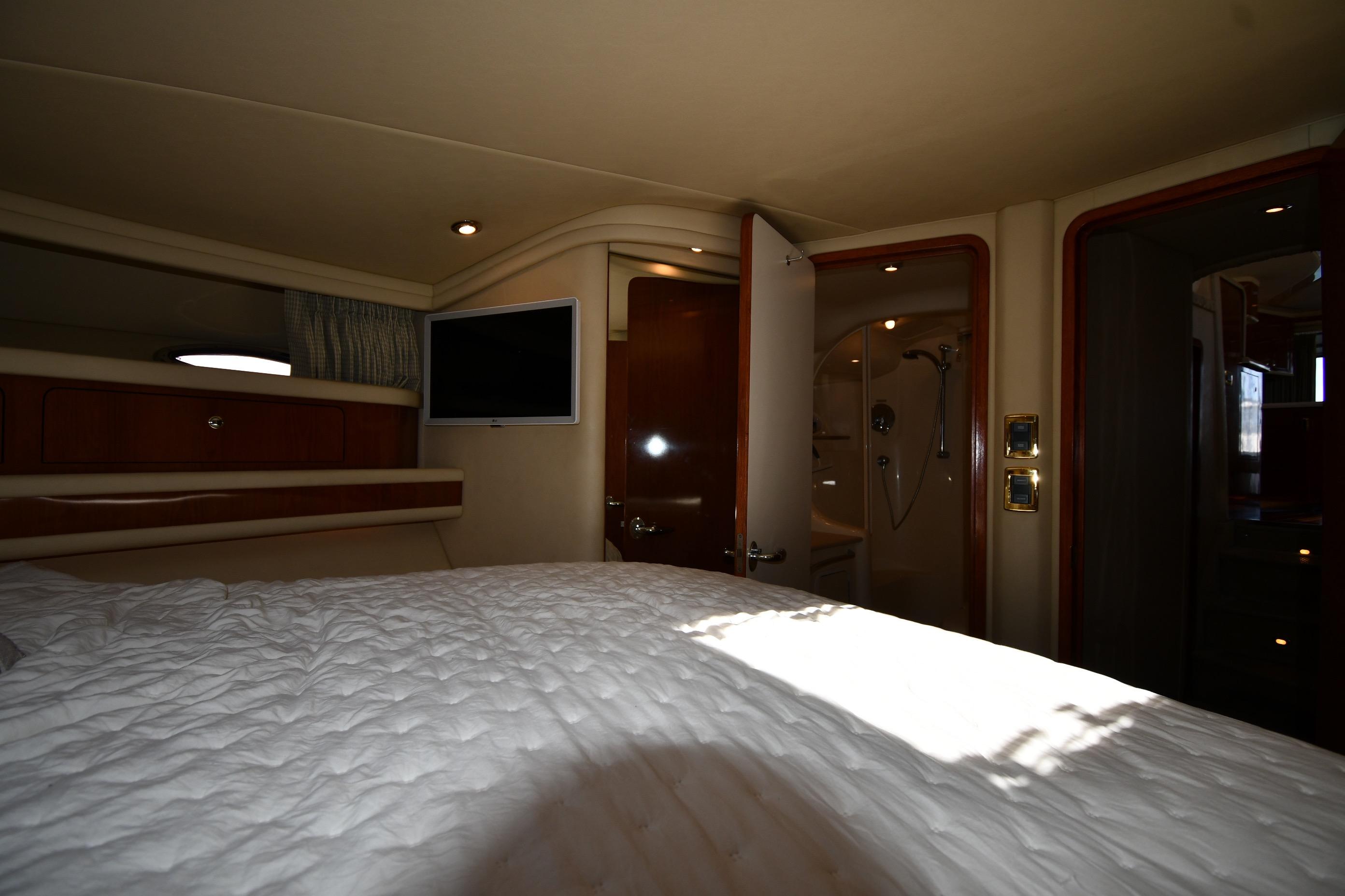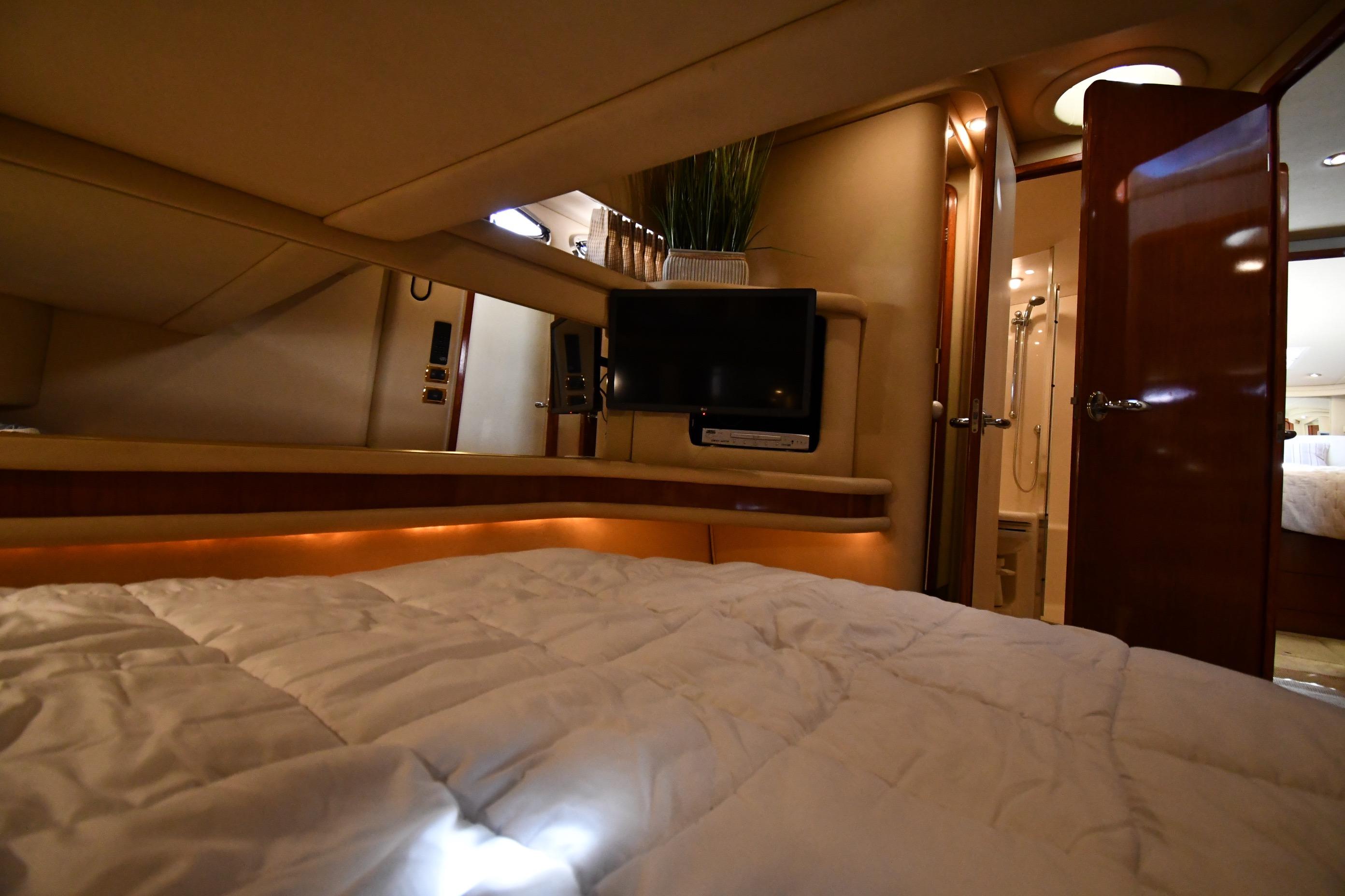 Forward Master Stateroom w/Privacy Door, Mirrored Forward Bulkhead, Mattress, Drawer Storage Underneath Berth, Port / Starboard Hanging Storage Lockers, Port / Starboard Gunwale Storage Cabinets, Television Aft to Port, Overhead Deck Hatch w/Built-In Screen & Sun-Shade