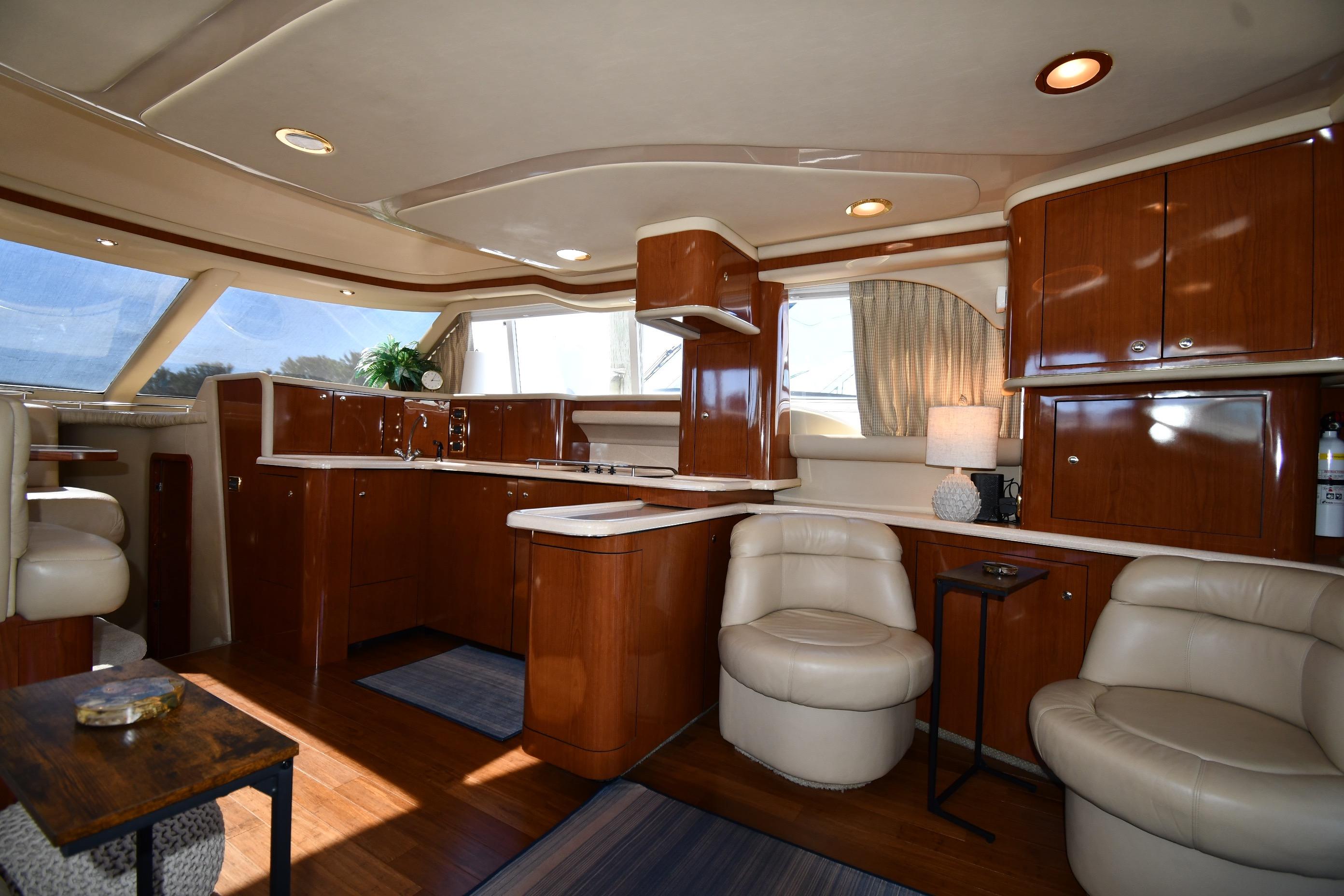 Salon w/Sofa to Port (Converts to Berth w/Electric Motor) w/Dining / Cocktail Table, Storage Underneath Sofa, (2) Barrel Chairs to Starboard (Note Storage Underneath Seat Bottoms), Entertainment Center to Starboard w/32" LCD-Television & DVD-Player w/Sound System