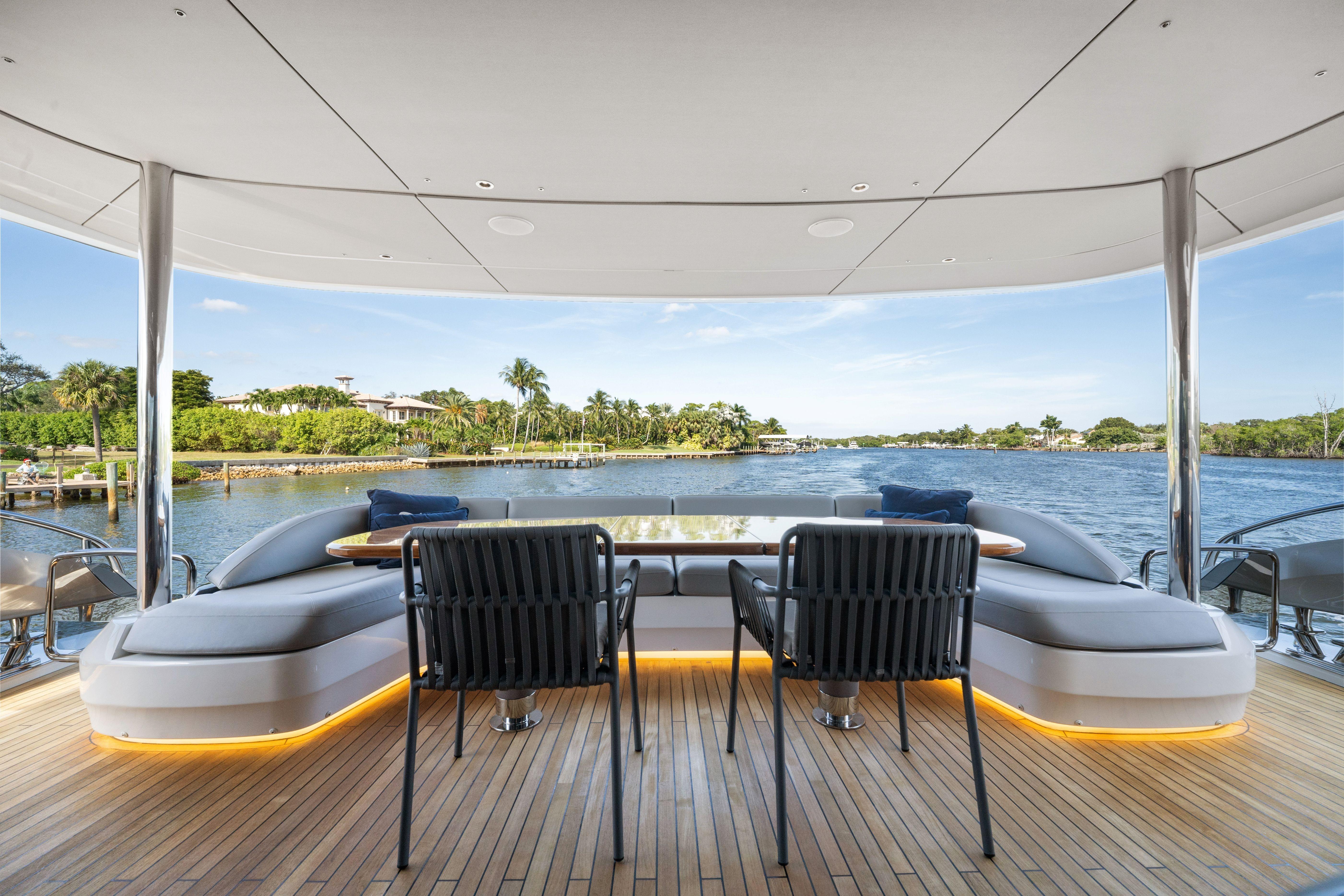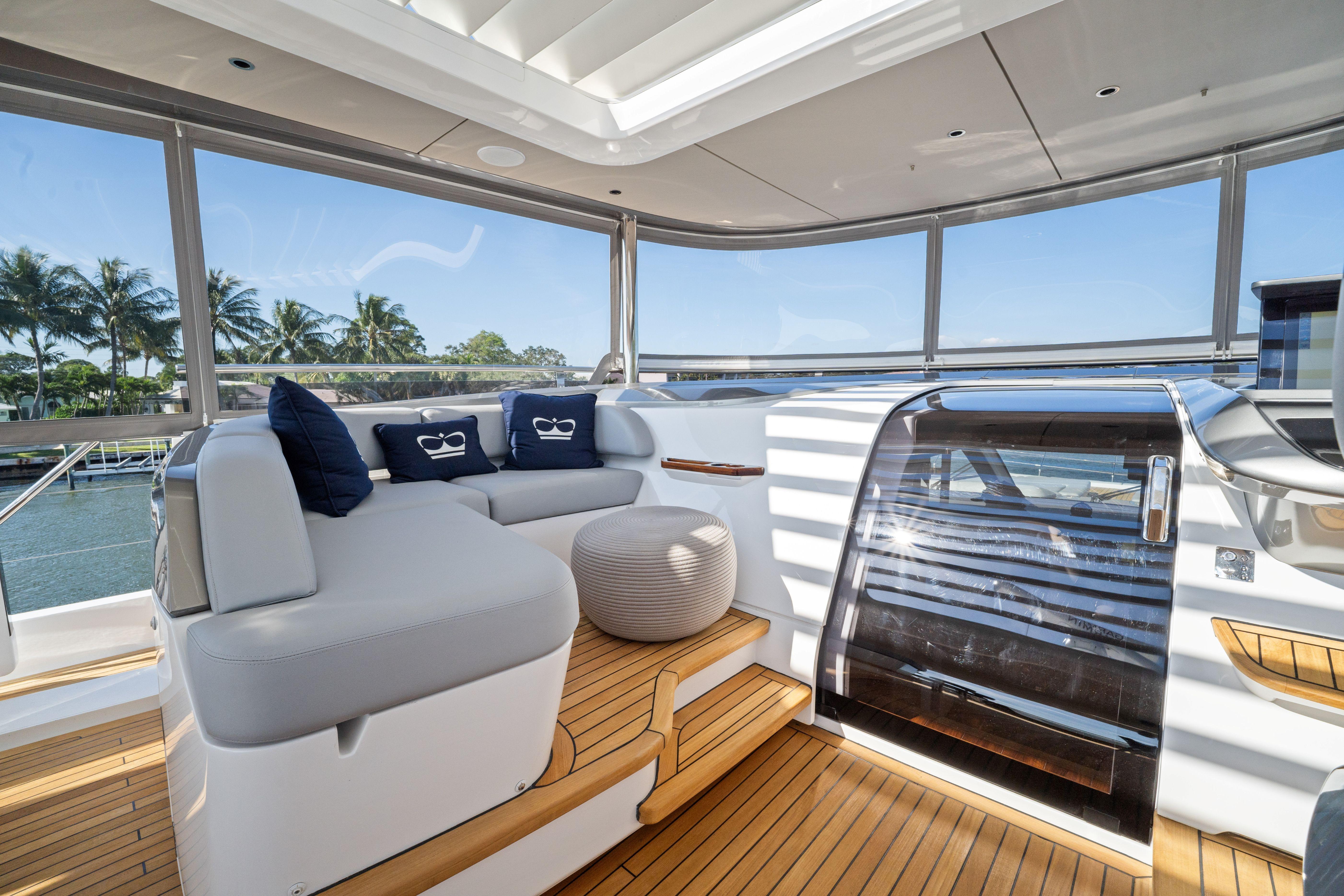 Standard flybridge layout encompasses port bar unit (with twin BBQ, sink and cooktop, drawer refrigerator, bin & storage), dining table with chairs (10), L-shaped sofa, 2x sun loungers, 1x coffee table and 1x pouff.