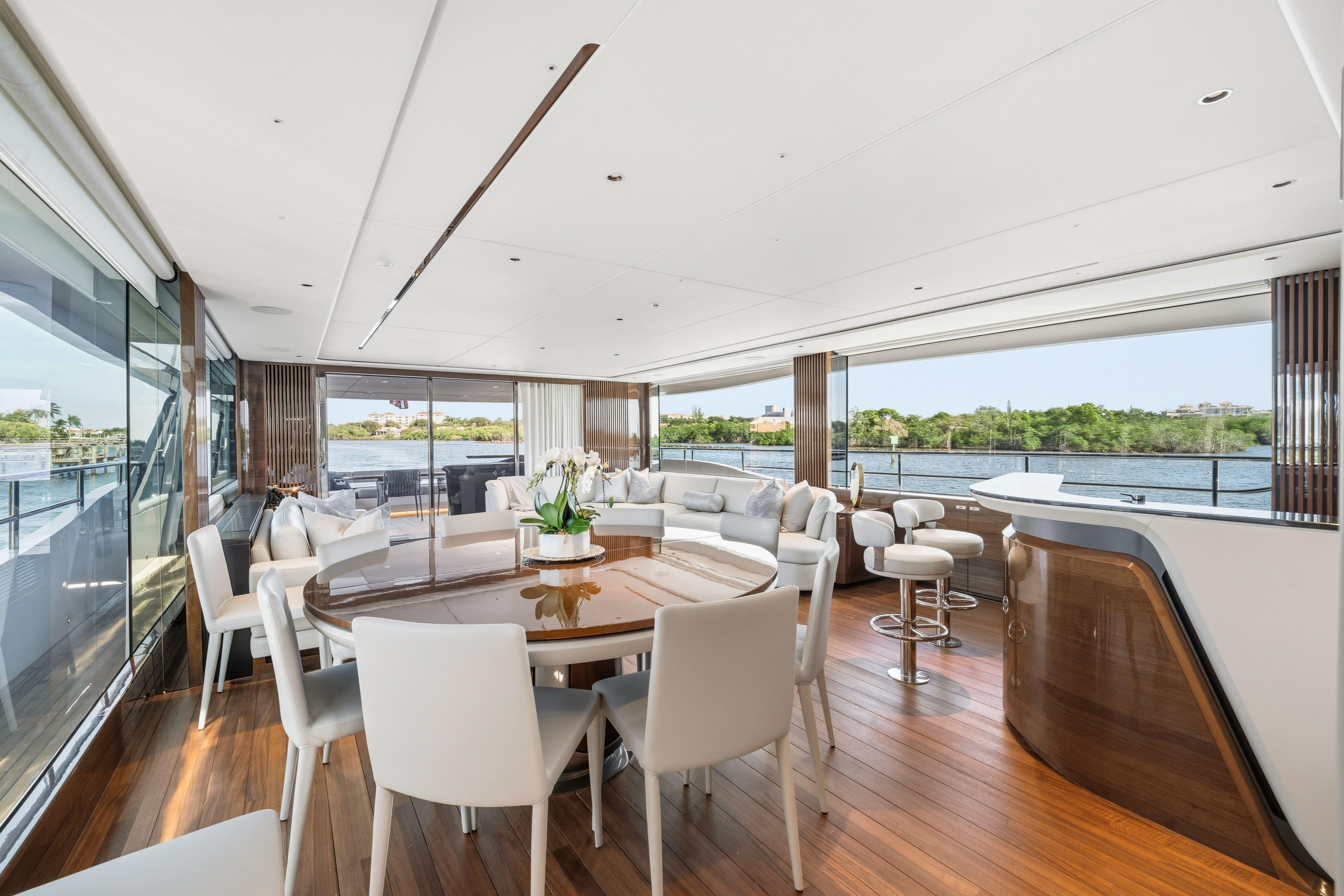 Standard Layout five (5) staterooms, incorporates main deck master, aft stateroom and forward stateroom, port and starboard side twin berth staterooms, all en-suite. Crew accommodation in two cabins for 3-4 with 2x crew bathrooms, mess and dinette. Standard salon layout comprises of a large curved forward-facing L-shaped sofa to port and curved sofa to starboard. Oval dining table with 10 Frag Bella low back dining chairs. Servery unit to port with integrated drinks refrigerator, bottle storage and icemaker.