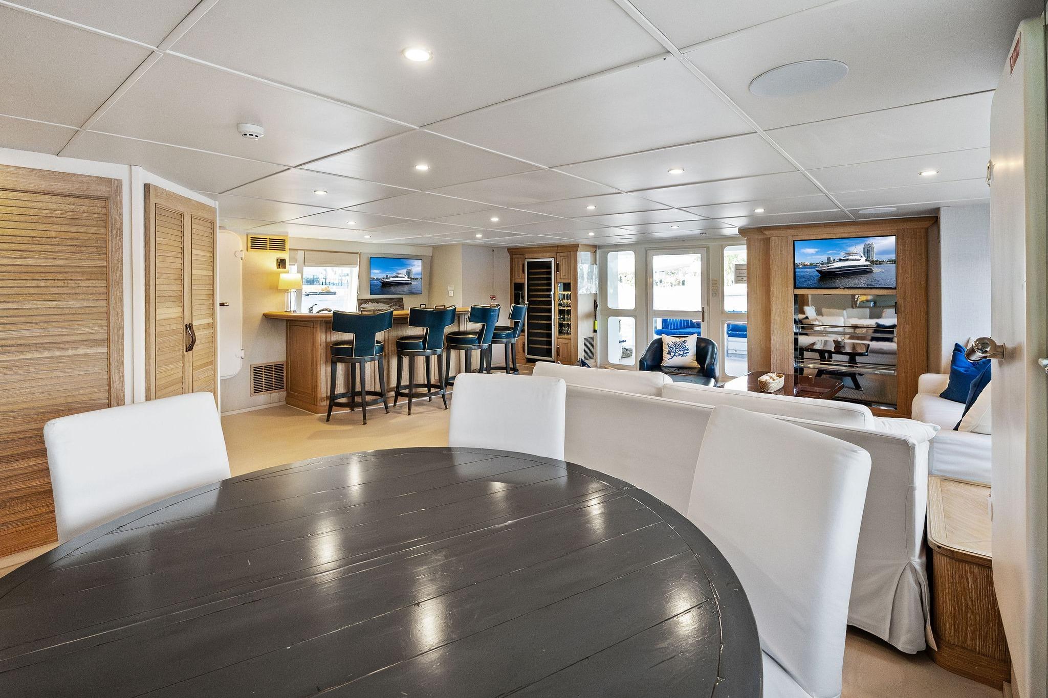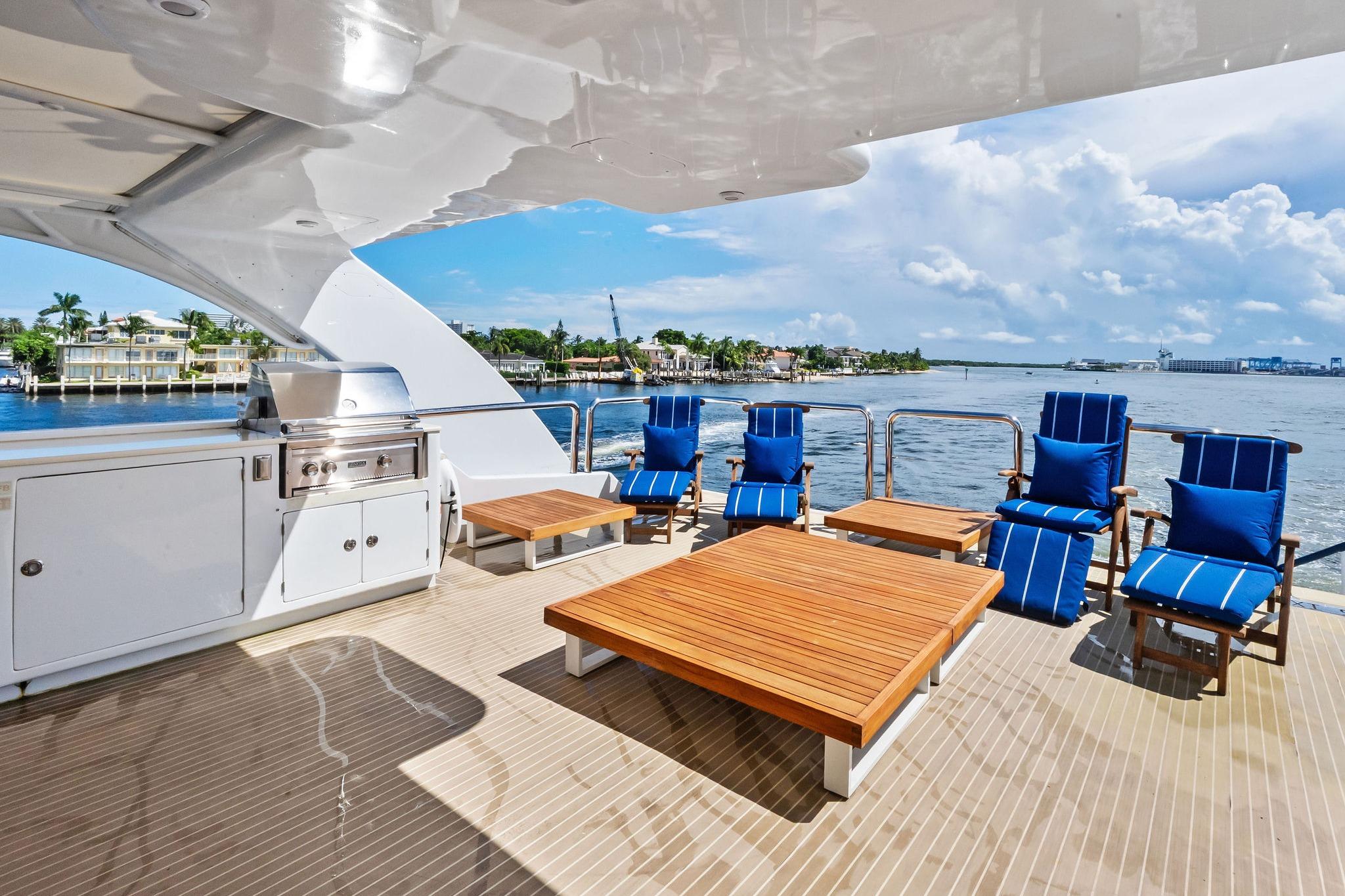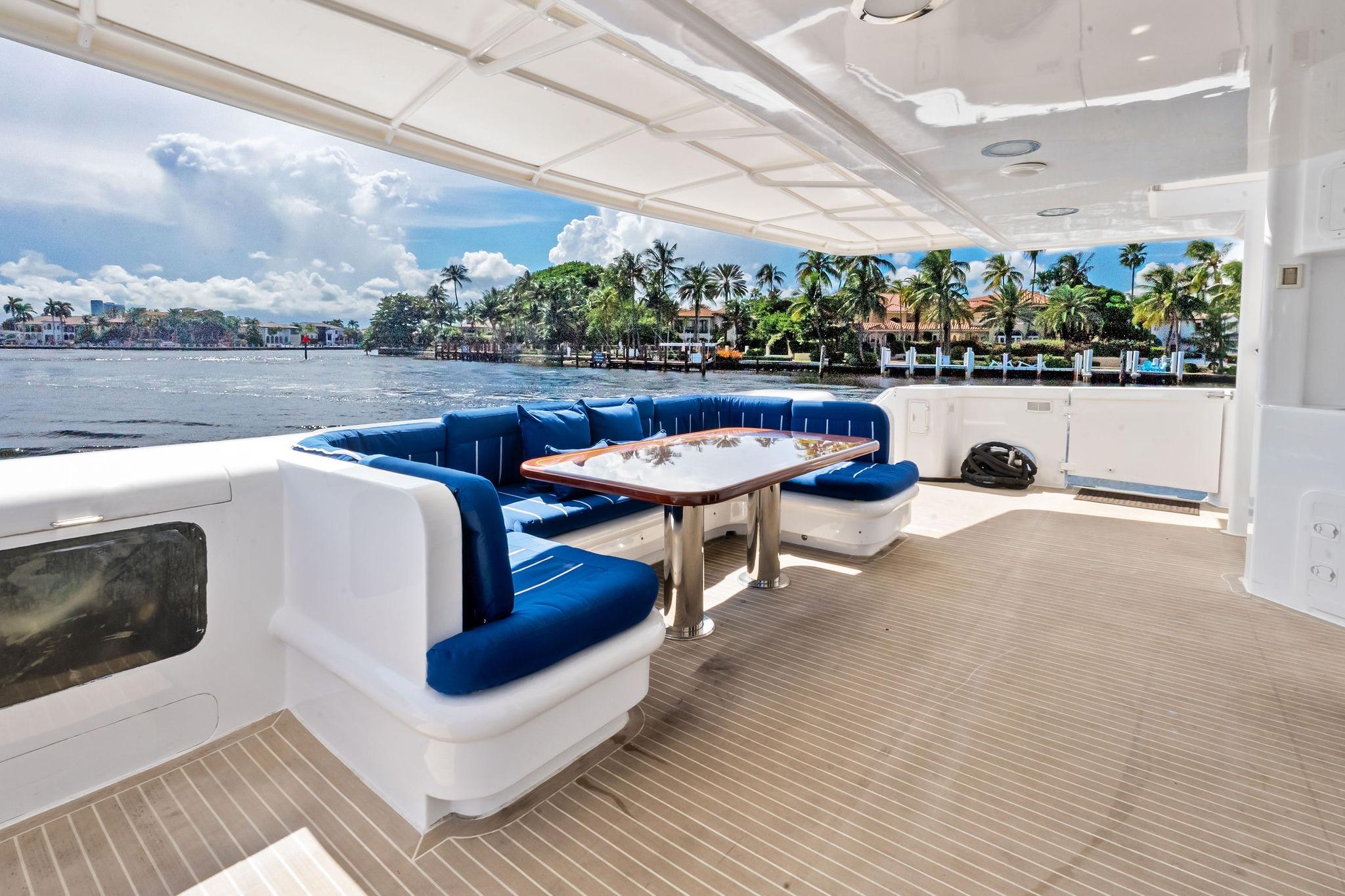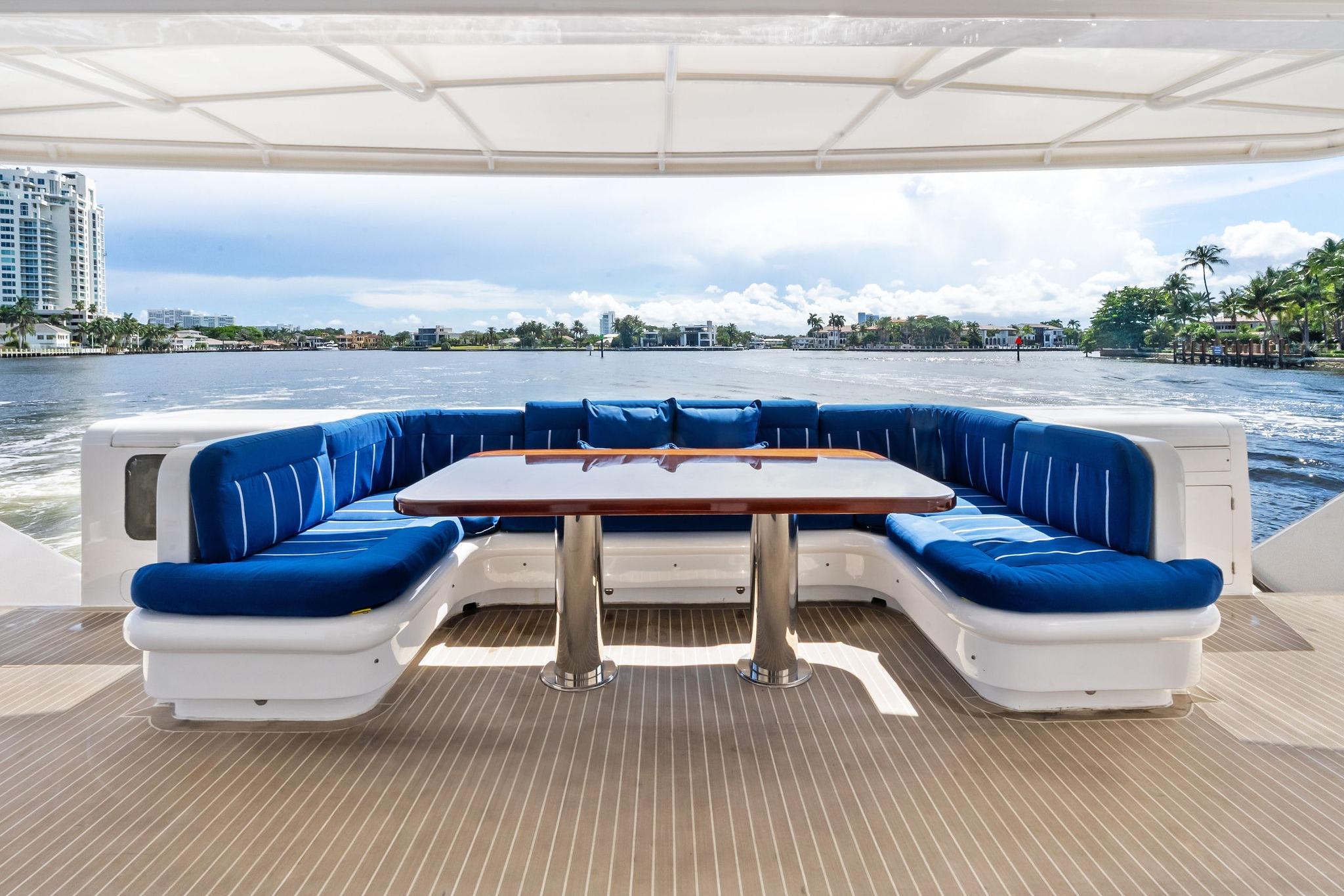 Just aft of the Master Stateroom, the private owner's deck offers seamless access to the flybridge. This outdoor haven features custom L-shaped seating and a chic cocktail/dining table, perfect for soaking in the views or entertaining in style.