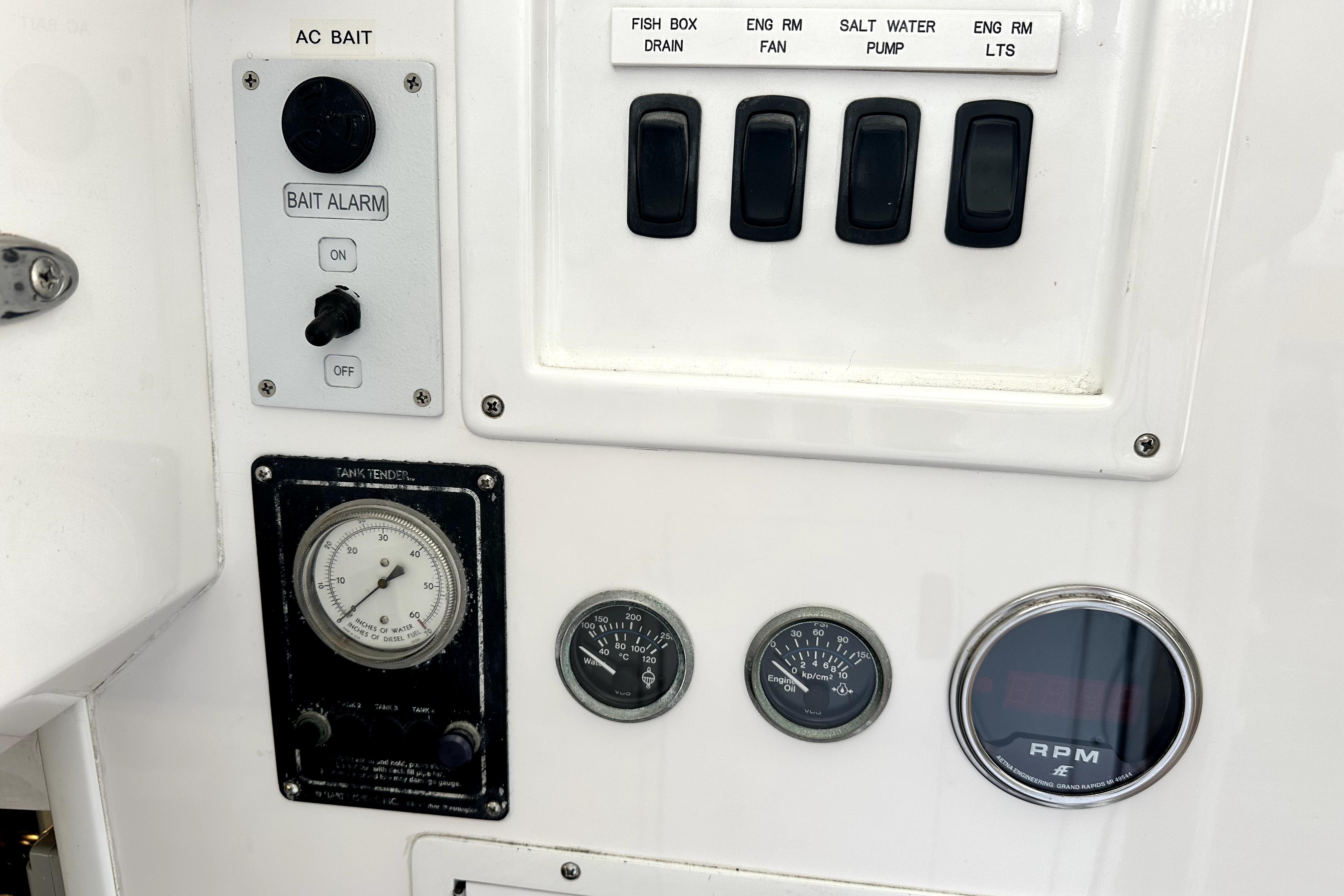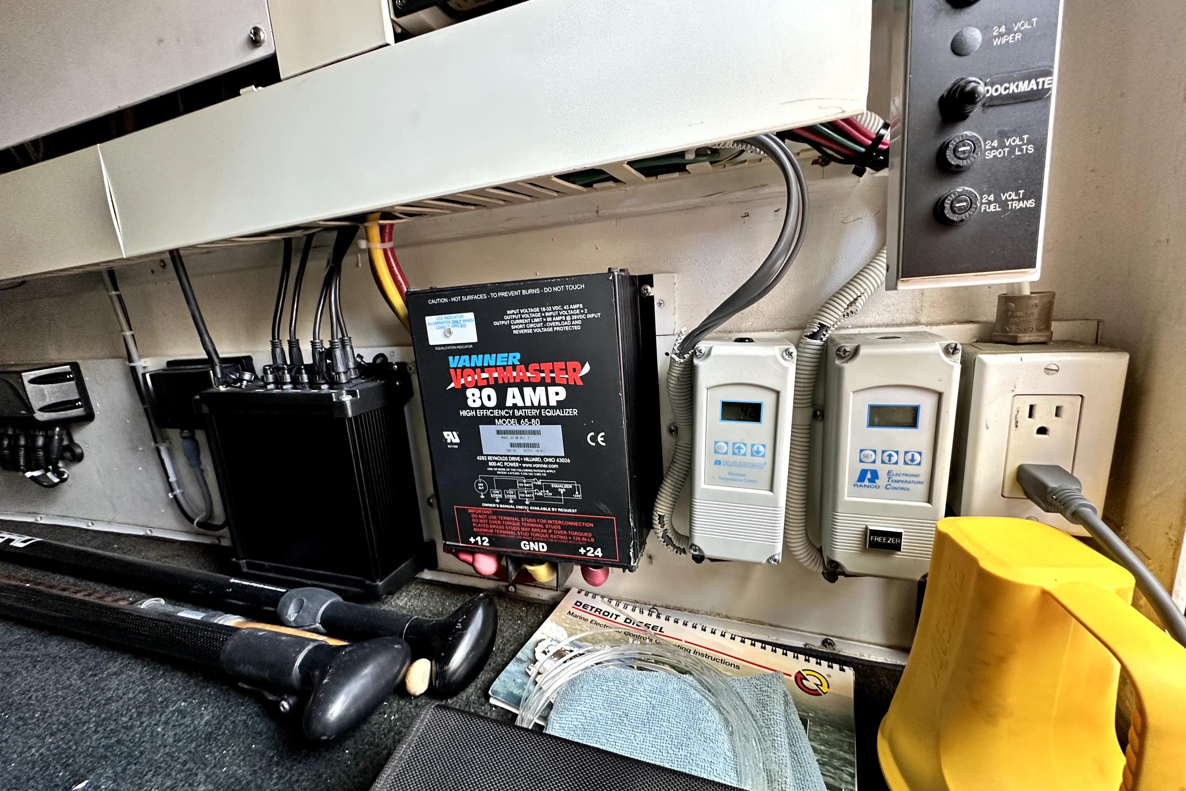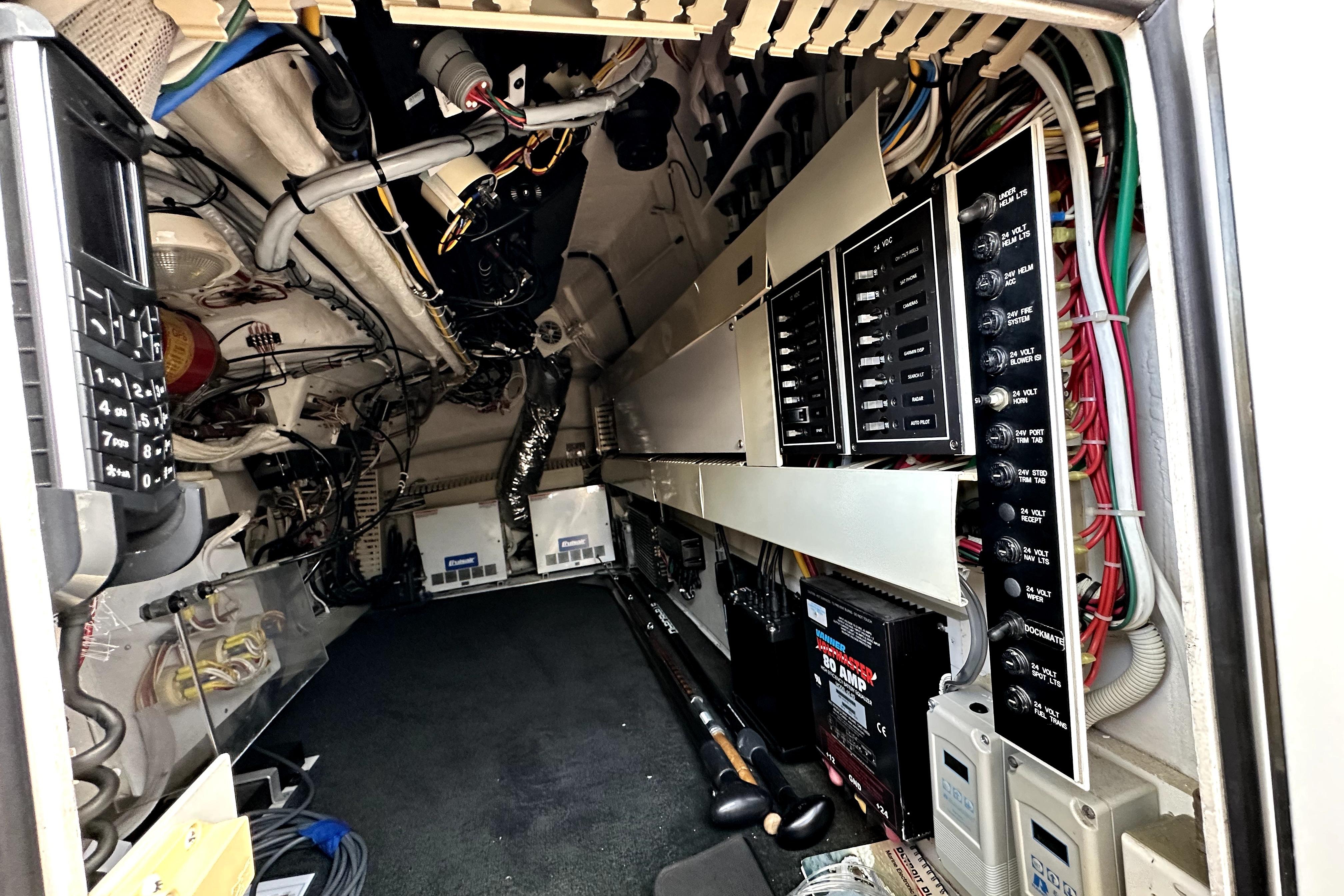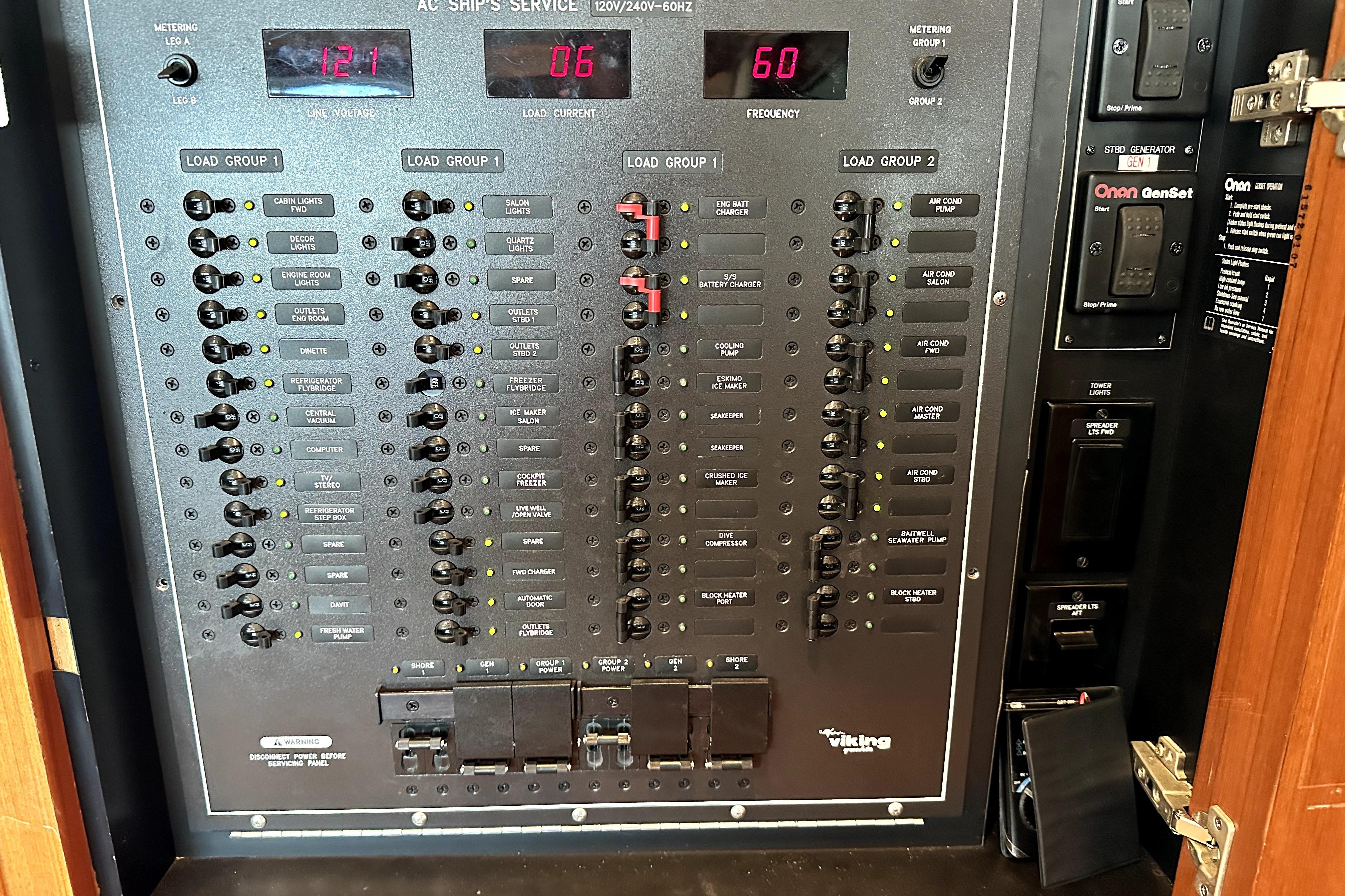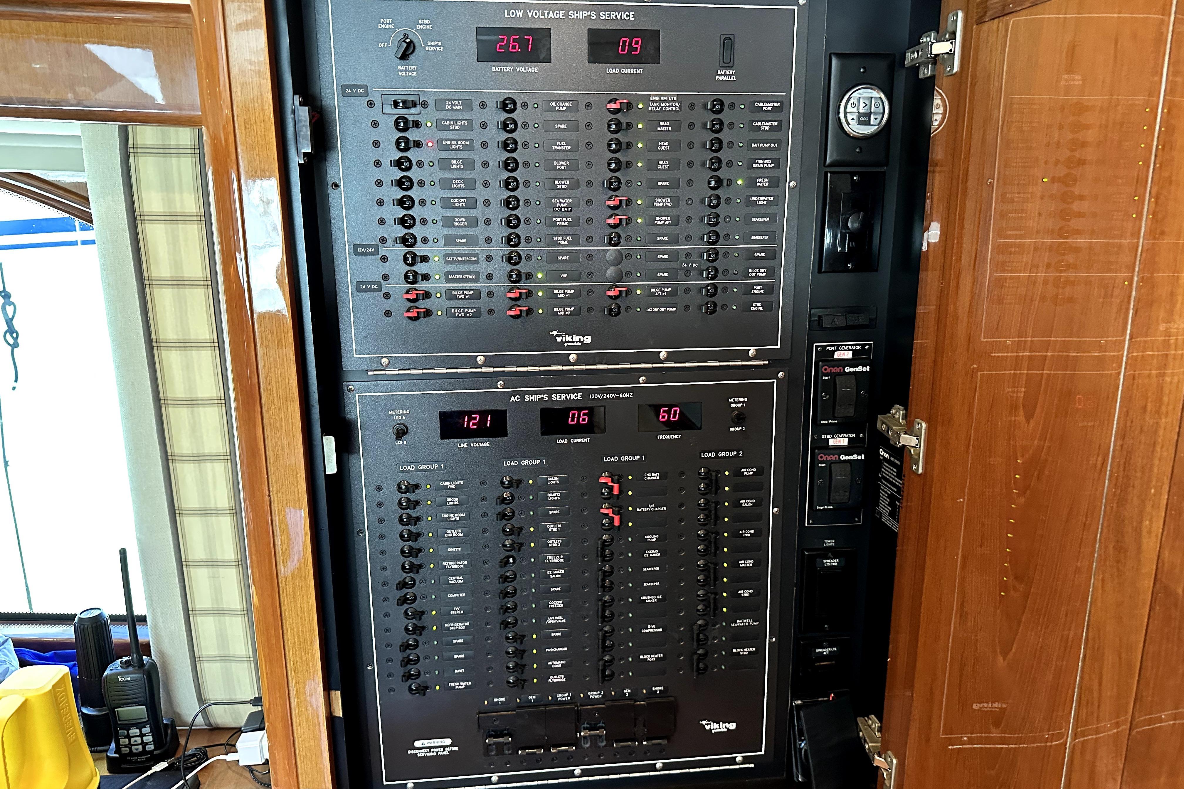 - Ship’s Main AC/DC Breaker Panel Cabinet w/ Remote Generator Start/Stops for the port and starboard gensets, Underwater lights controller,Tuna tower Quartz lights switches, stereo volume control and more