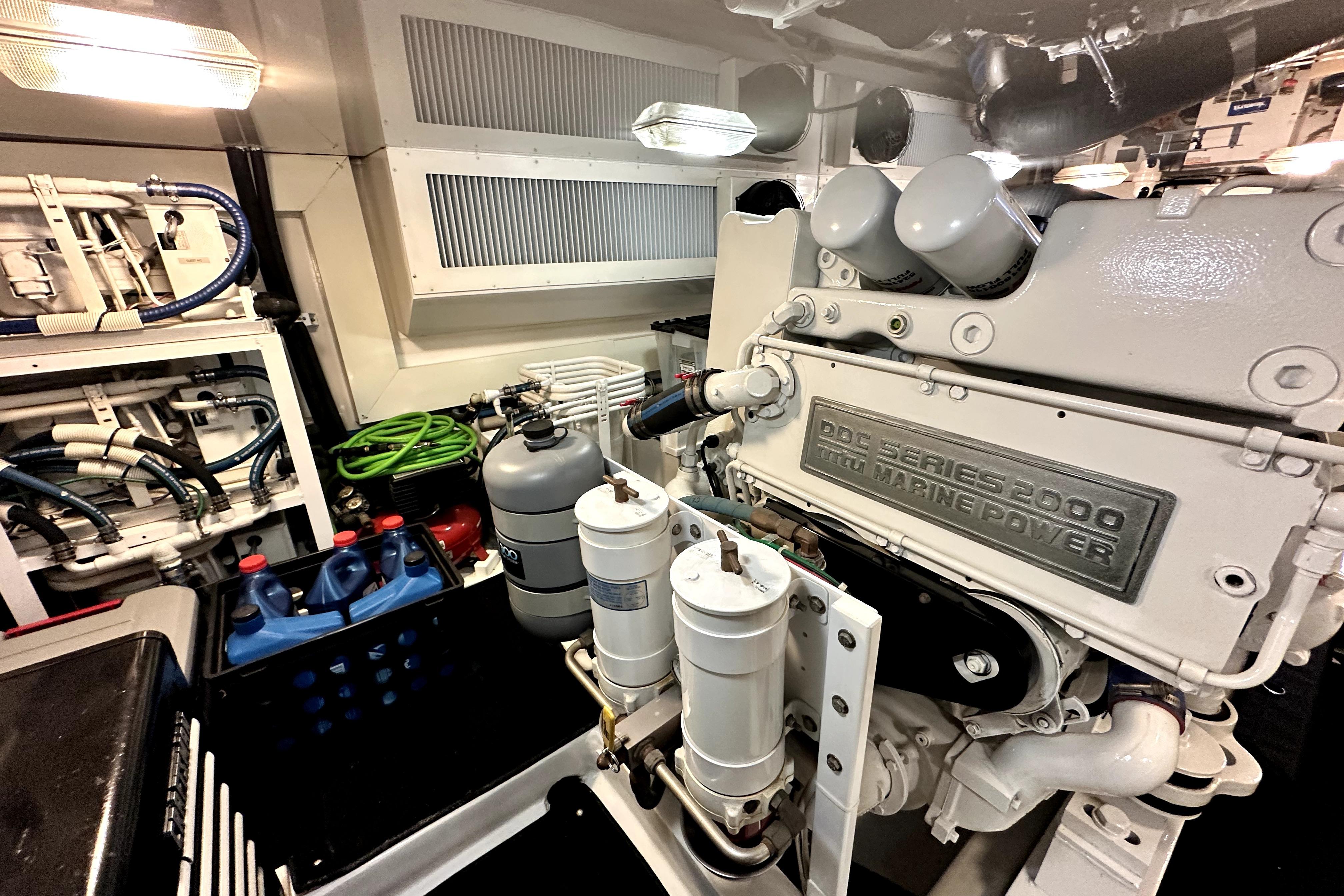 Fire safety is ensured with FireBoy automatic Halon discharge systems in the engine room and under the helm console, tied into the ship’s fire alarm bell. Each of the vessel’s seven zones is further protected with handheld Halon fire extinguishers.