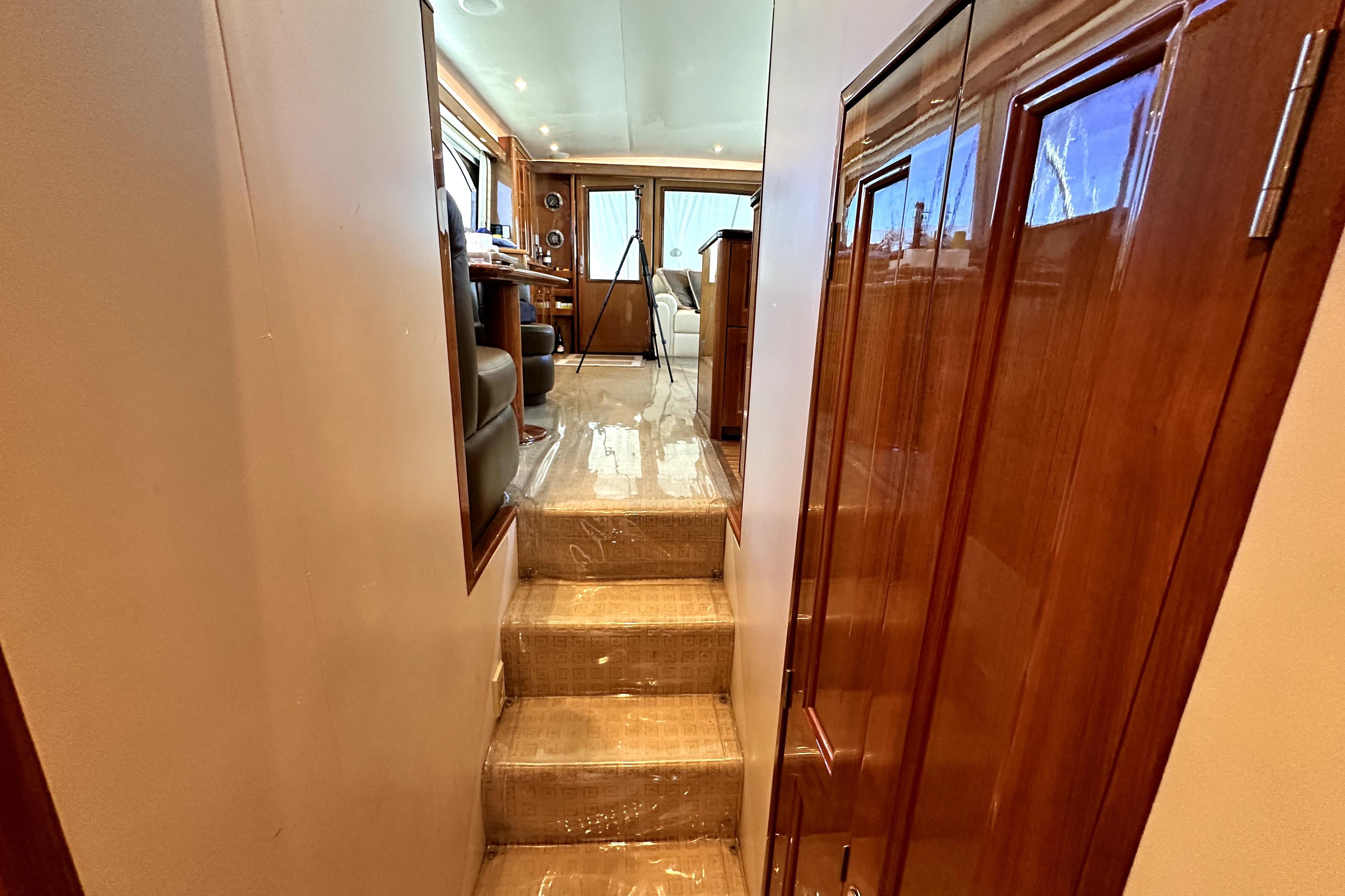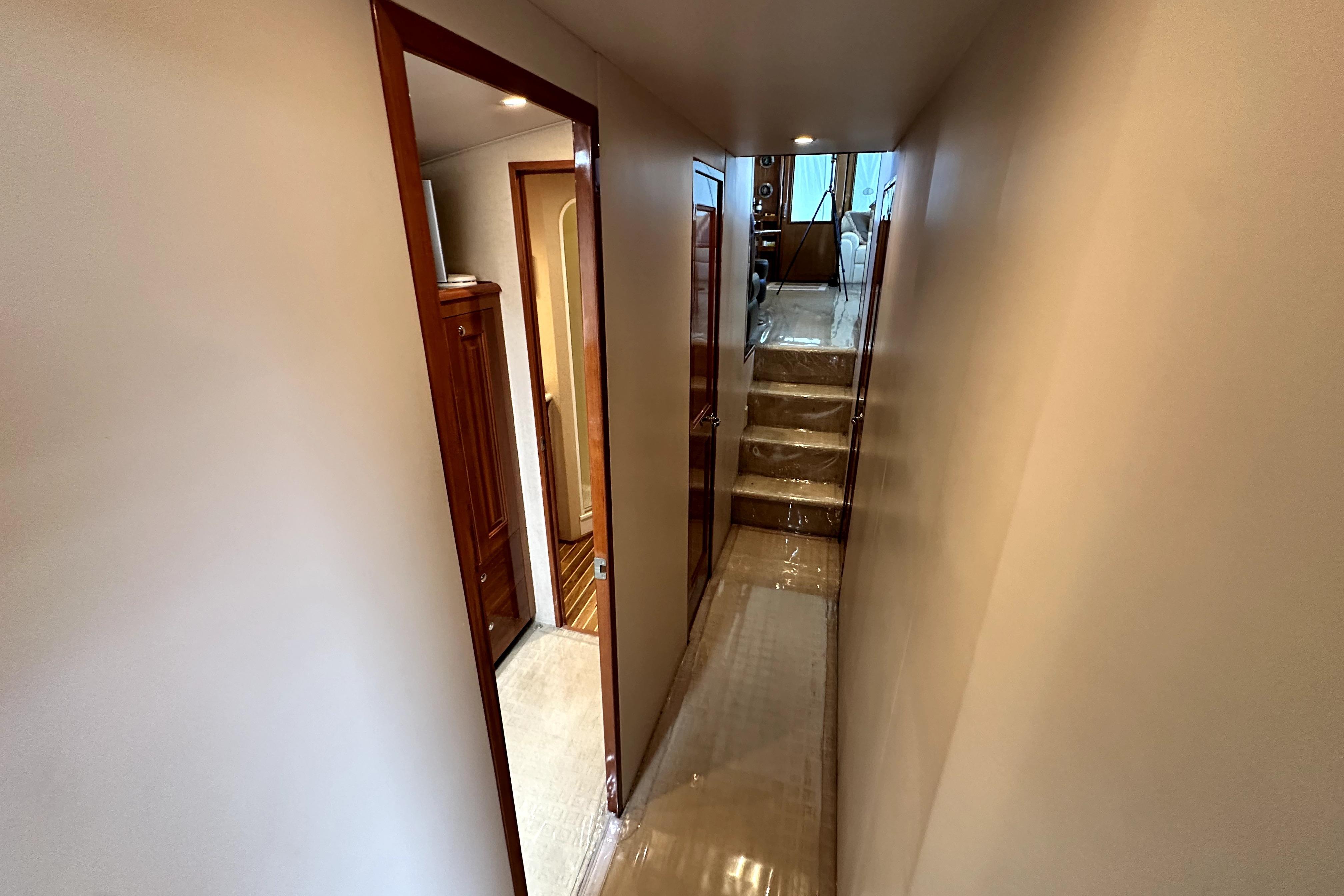 Accommodations CompanionwayExiting the salon down the centerline of the yacht, you descend the accommodations companionway steps, and pass a closet to port with a Whirlpool stackable washer and dryer. Below the hallway sole is access to the centerline bilge compartments. Further forward is the starboard guest accommodations with access to the "day head" shared by the starboard accommodations. To port is the master suite complete with ensuite head. Forward is the VIP guest accommodation and ensuite head.
