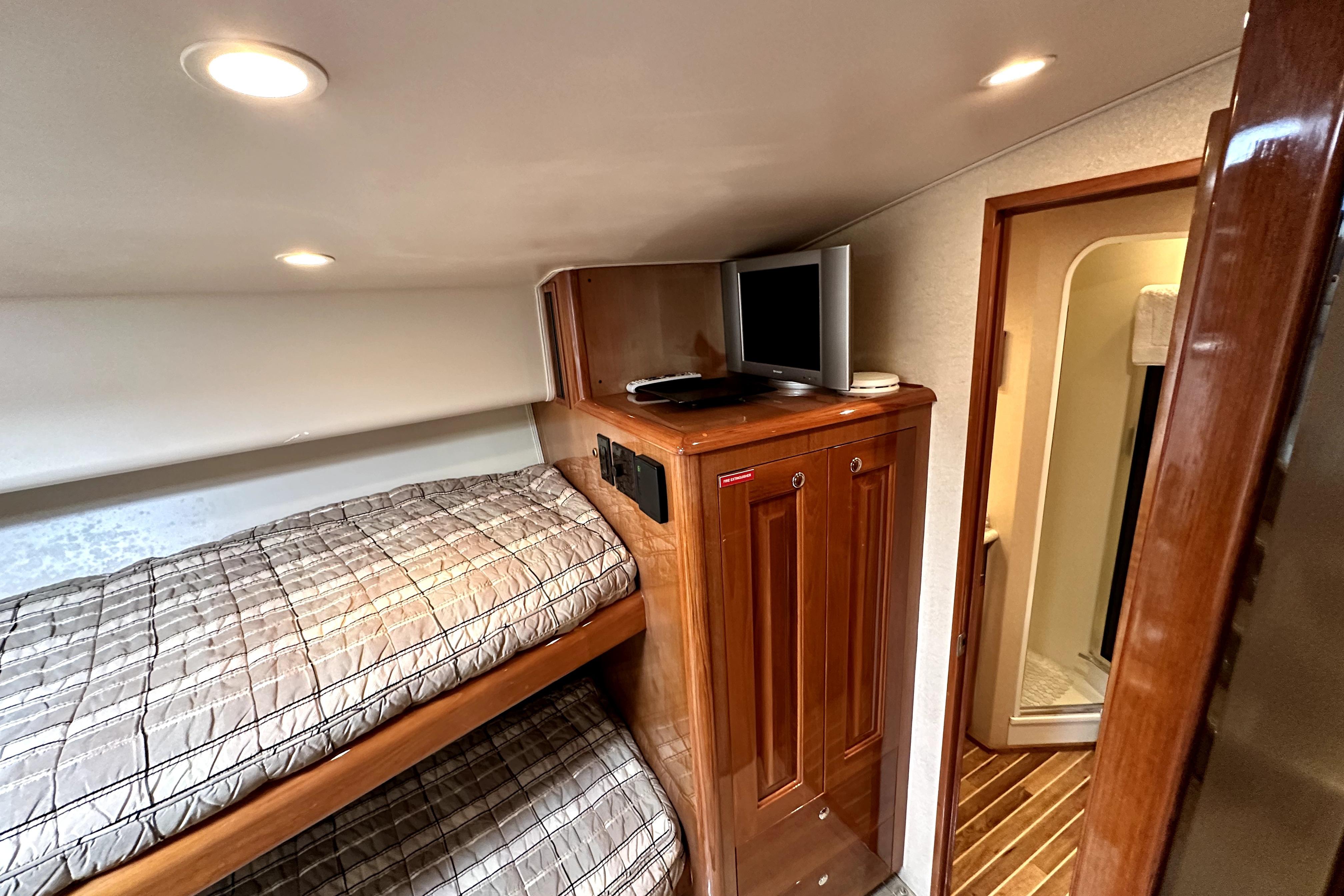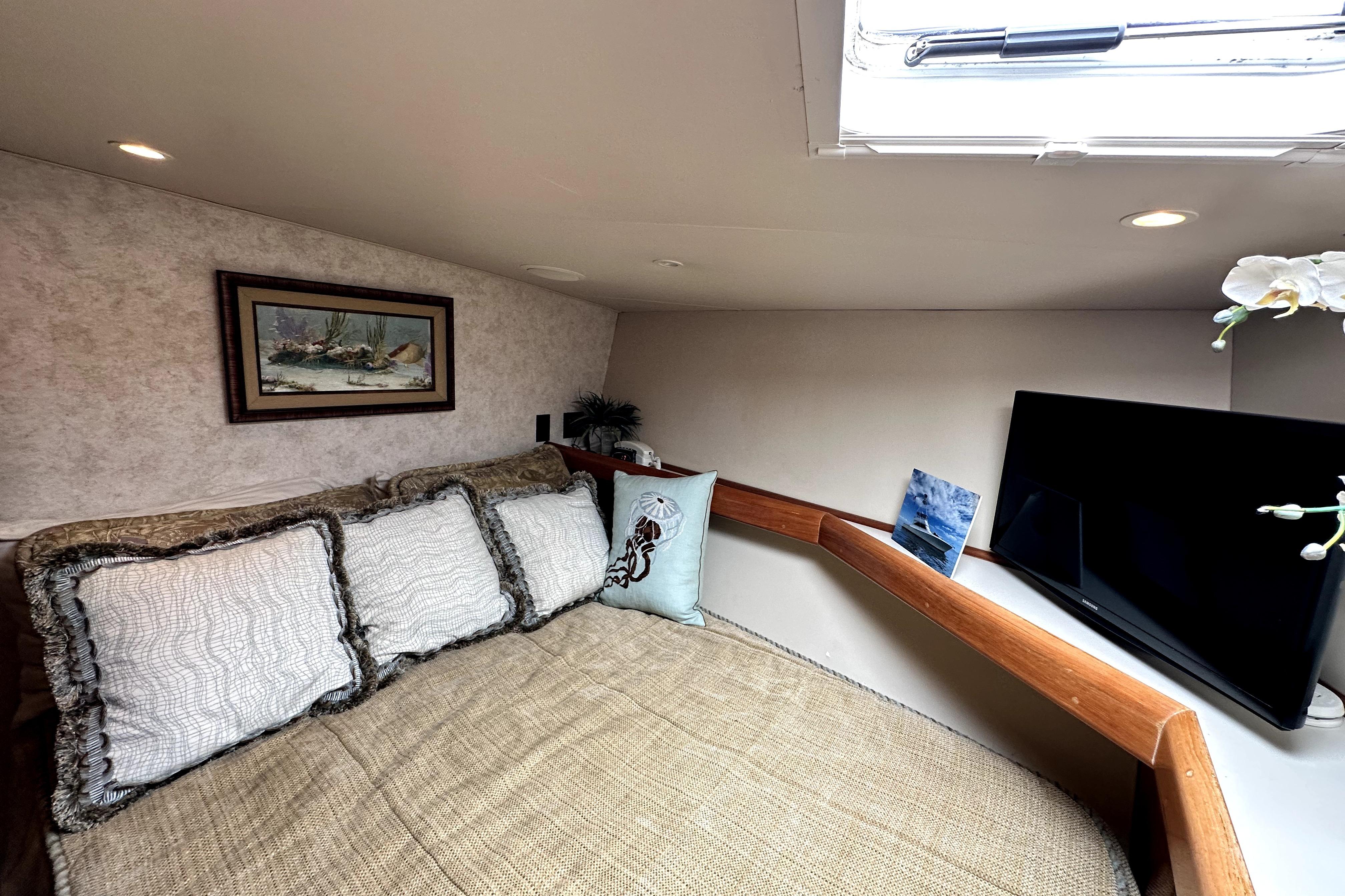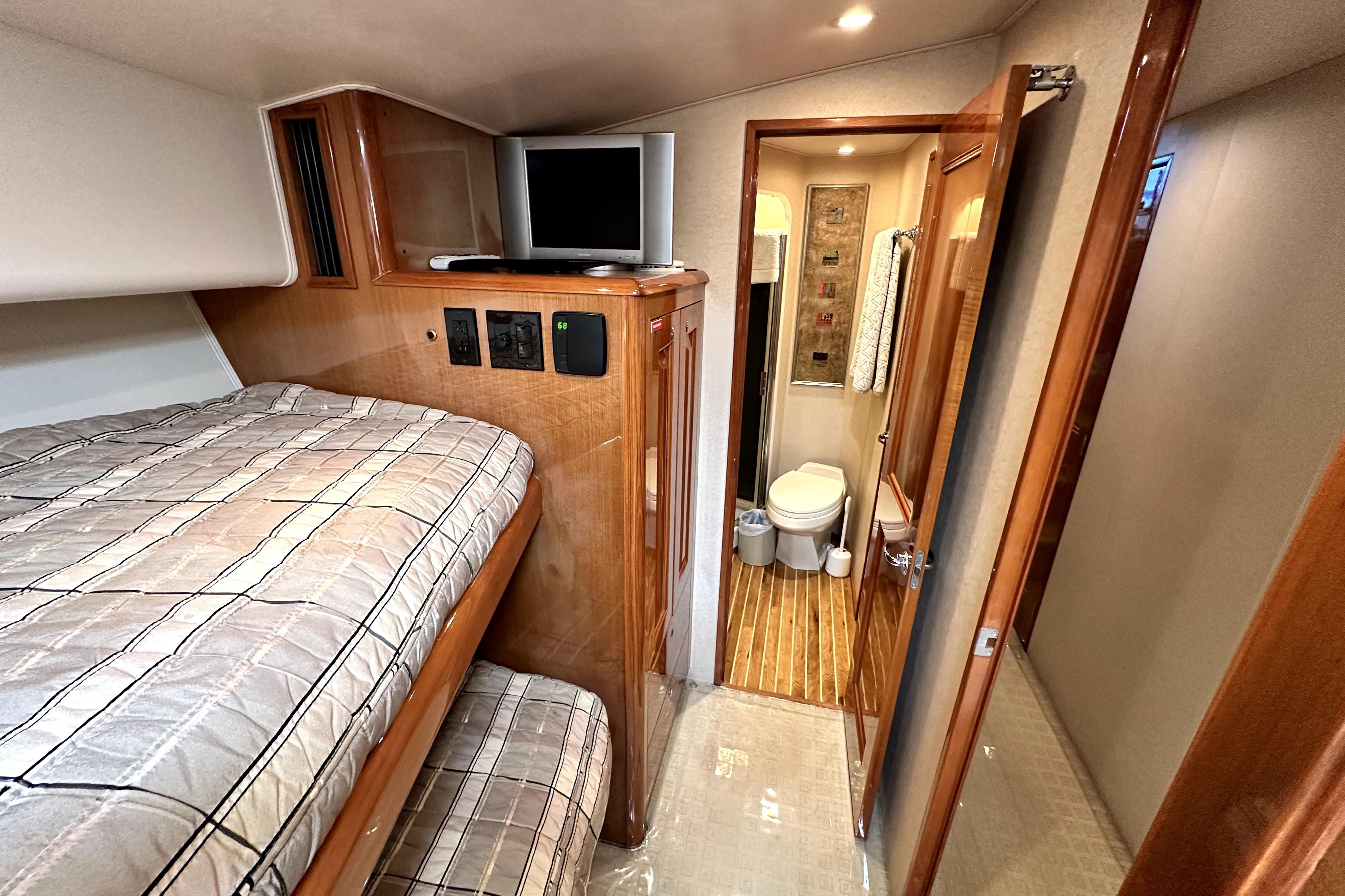 The sumptuous owner’s quarters are located to port, featuring a master queen bed set athwartship. Jack and Jill nightstand cabinets with drawers and table lamps flank the bed, alongside a cedar-lined hanging locker and custom rod and reel storage. A chest of drawers, additional cabinetry, and lower bed drawers provide ample space for clothing and personal items.