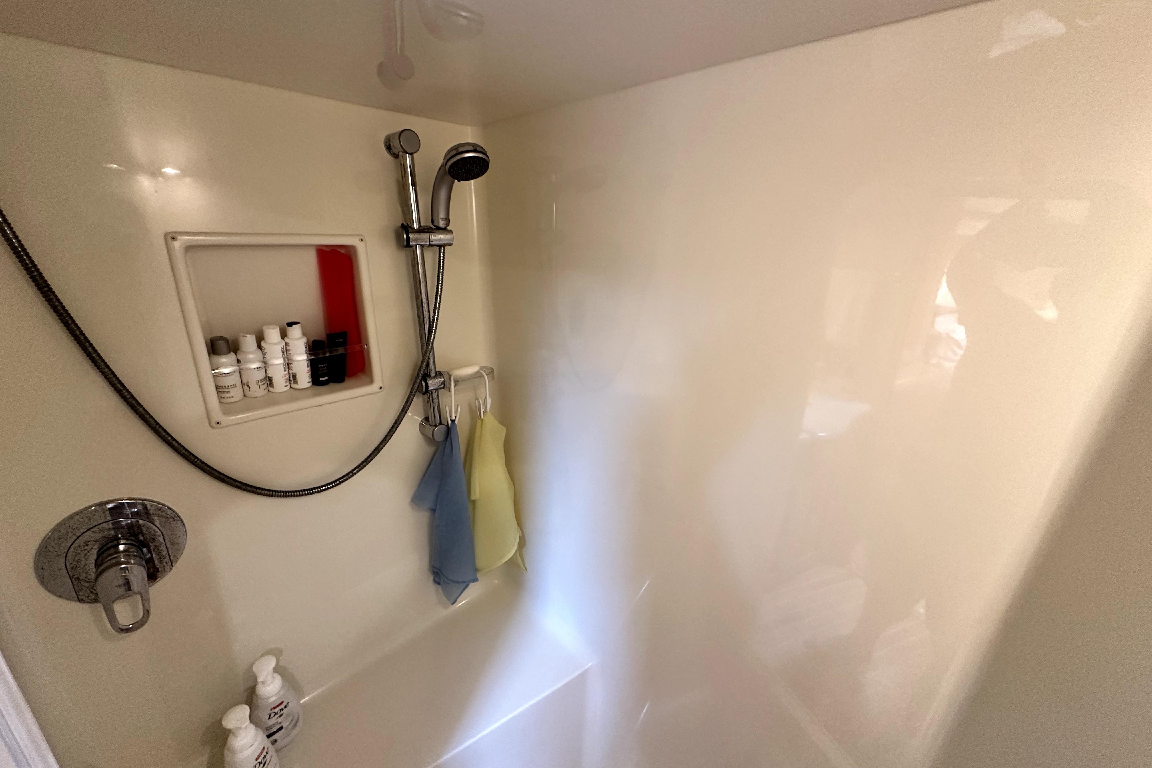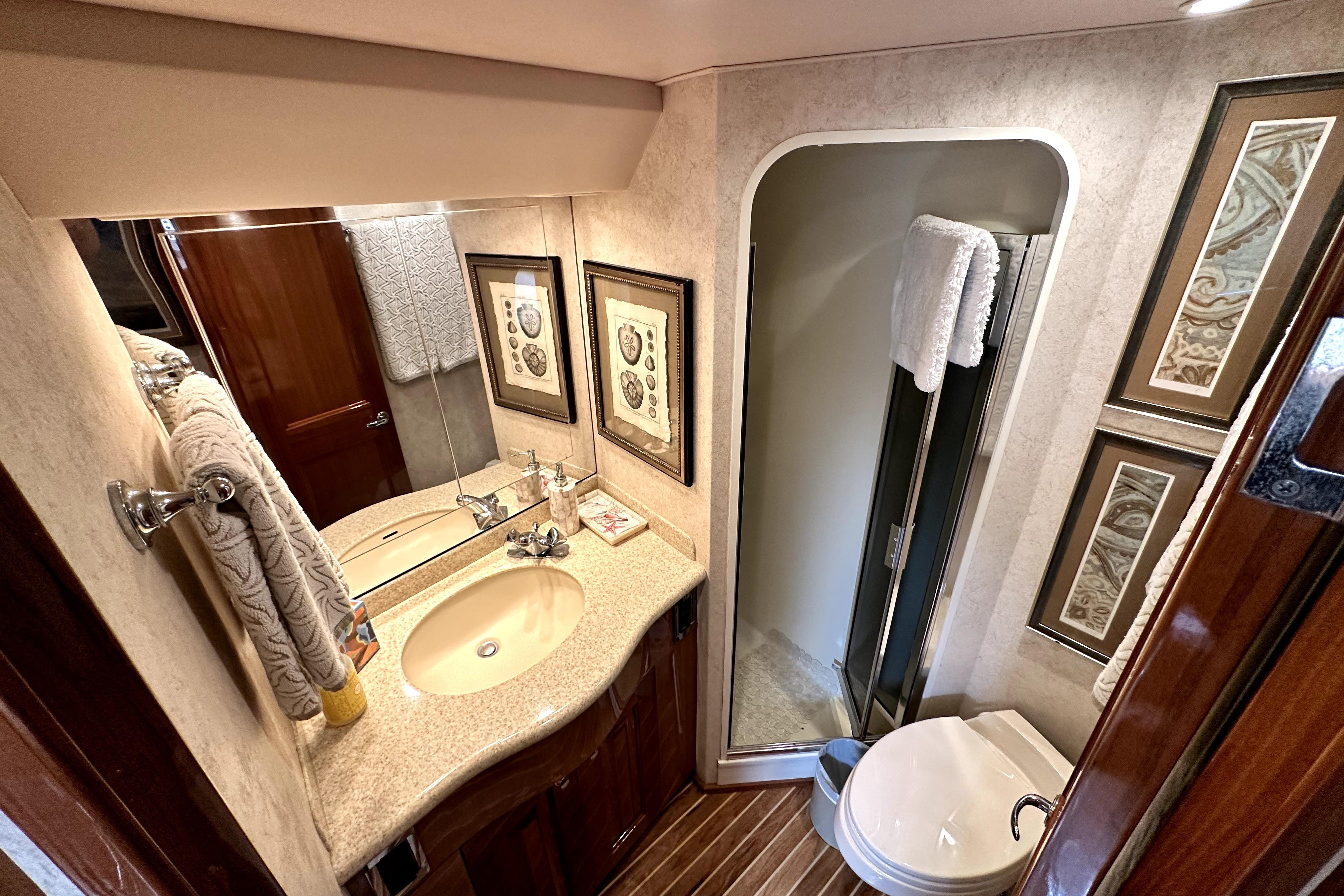 The ensuite guest head is well finished with a high-gloss teak cabinet, Grohe faucet and sink, mirrored vanity, stall shower with Grohe shower wand, Headmaster freshwater toilet, and Amtico vinyl teak-and-holly flooring.