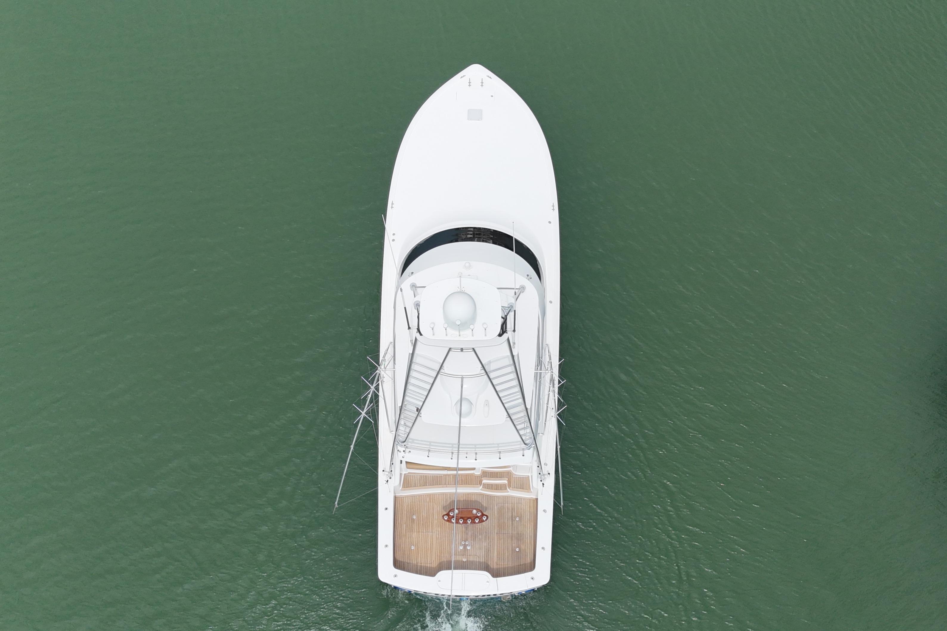SHE'S ONE SEXY 55' VIKING, THANKS TO HER MIRRORED FINISHED ALL-WHITE GELCOAT, INCLUDING THE HULL SIDES, WHICH IS AN EYE CATCHER, COMPARED TO COLORED HULL OF THE PAST GENERATION. HER NO-BOW RAIL ADDS TO HER CUSTOM BOAT GOOD LOOKS.