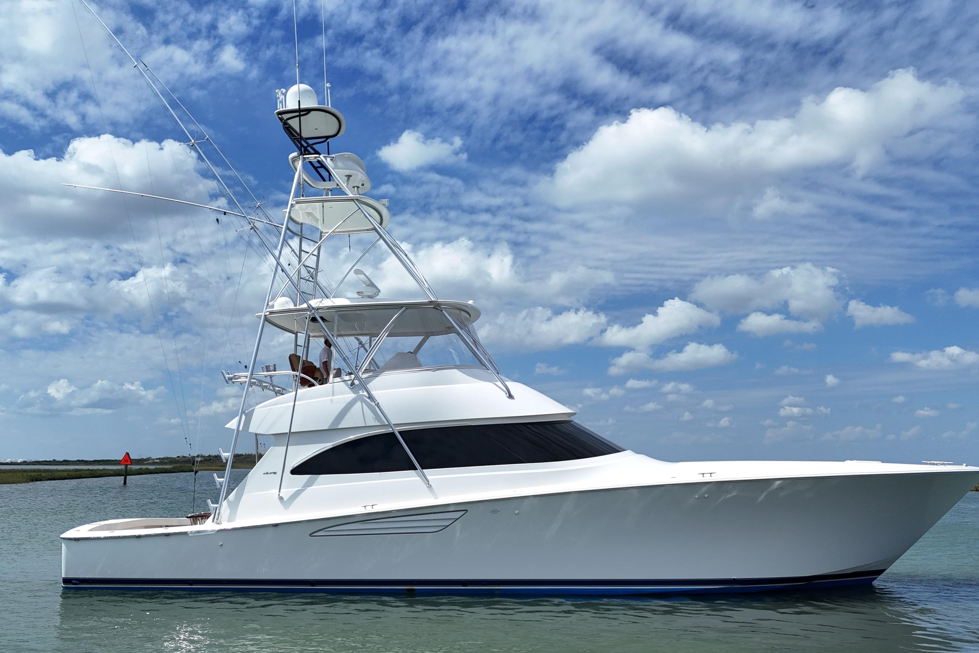 One of the most dominant sportfishing yachts in her class for several years, the Viking 55 Convertible followed in the acclaimed footsteps of the original Viking 55 Convertible built in 1998–2004. Sleek and sporty with a huge cockpit and luxurious accommodations, the 55C is a competitive fishing machine and an ideal family cruiser. Entering from the cockpit, an electric sliding door opens to an expansive main salon with an L-shaped leather sofa to port and the dinette just forward. The starboard-side galley with Amtico flooring and two barstools at the counter in a peninsula configuration. Below, the three-stateroom layout has the master suite to starboard and a twin-berth guest cabin to port. The forward VIP stateroom was offered with a walkaround island berth or angled over/under berths. A laundry center is accessed from a companionway door. A mezzanine deck with lounge seating overlooks the vast 151 square-foot cockpit complete with two in-deck fish boxes (or live-wells), two freezers, a drink box and copious amounts of storage. An extended flybridge overhang provides shade on sunny days. "Wildcatter is powered with the upgraded optional Twin 1,550hp MAN V12 diesels and easily cruises at 35–36 knots (40+ top).