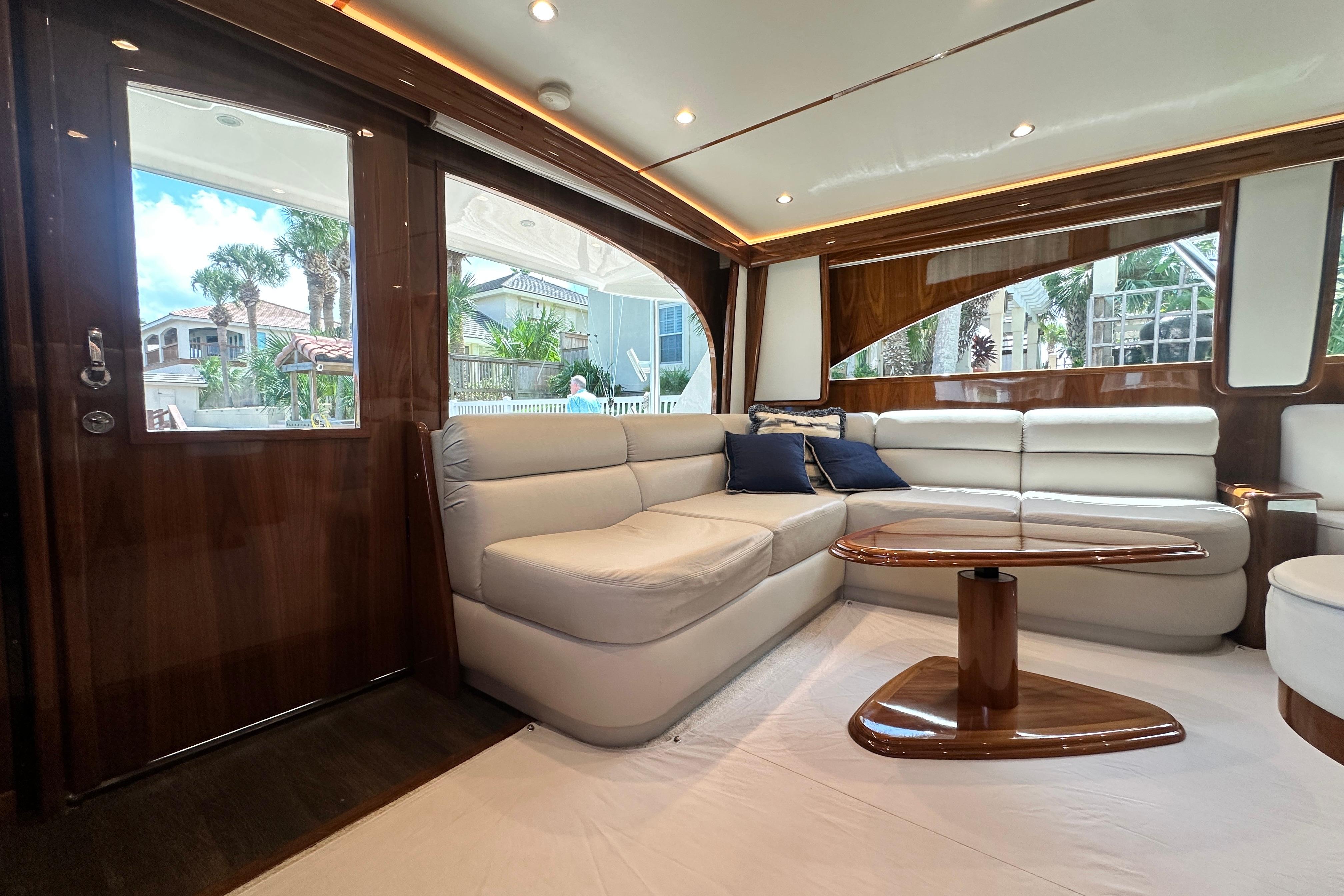 As You Enter the Main Salon from the Cockpit, One will Find the Salon is Both Bright and Spacious, which Features Beautiful High-Glossed Teak Finished Cabinetry and Woodwork that Contrasts Perfectly with the Light Neutral Colored Upholstery, Soft Goods and Carpet.