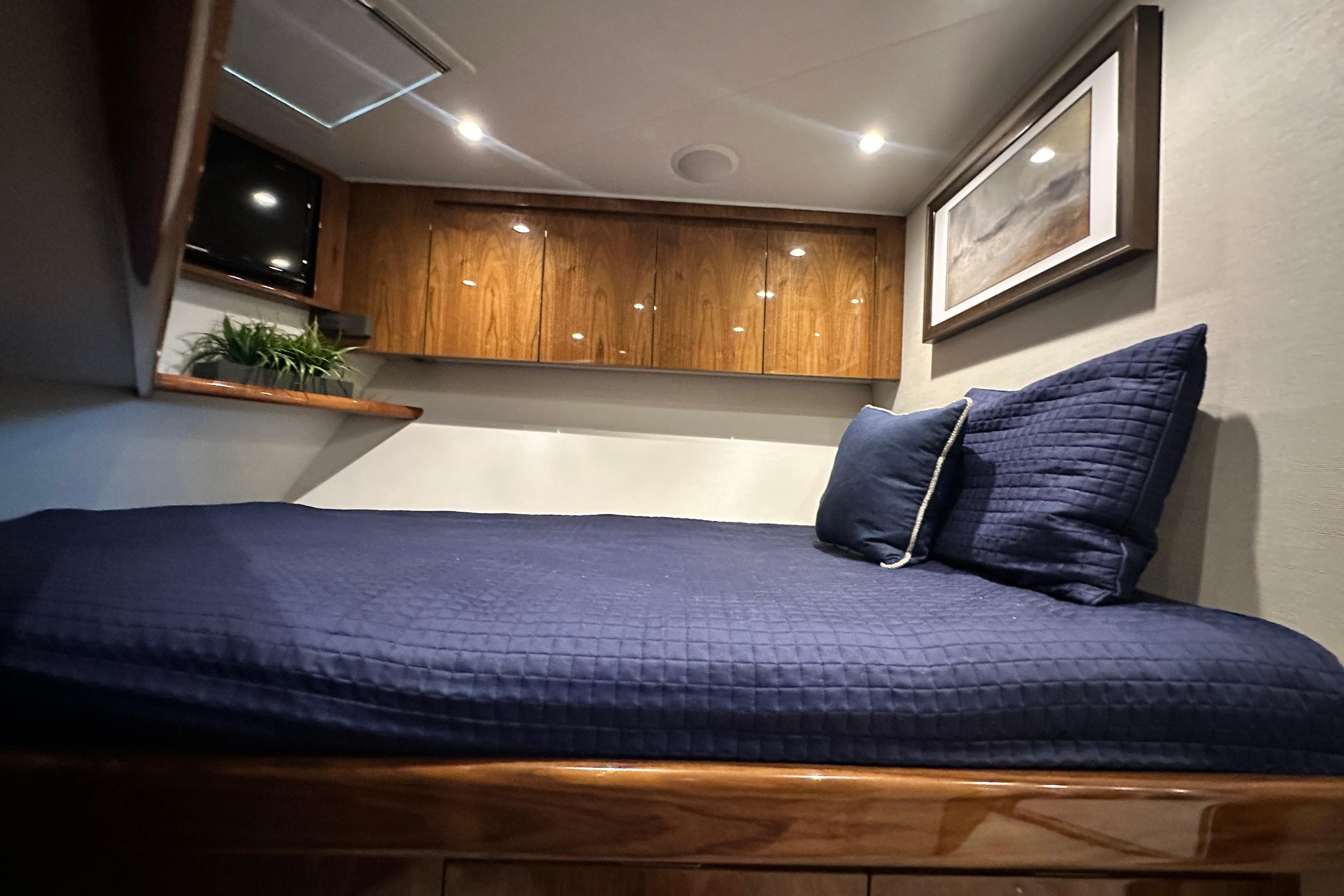 Step into the Salon to find a spacious cabin with beautiful high gloss walnut cabinetry and warm relaxing fabrics. Her spacious L-shaped sofa is to port and her dinette is just forward. Her Galley is forward in the Main Cabin to starboard. A large island counter top with stools make for comfortable entertaining.