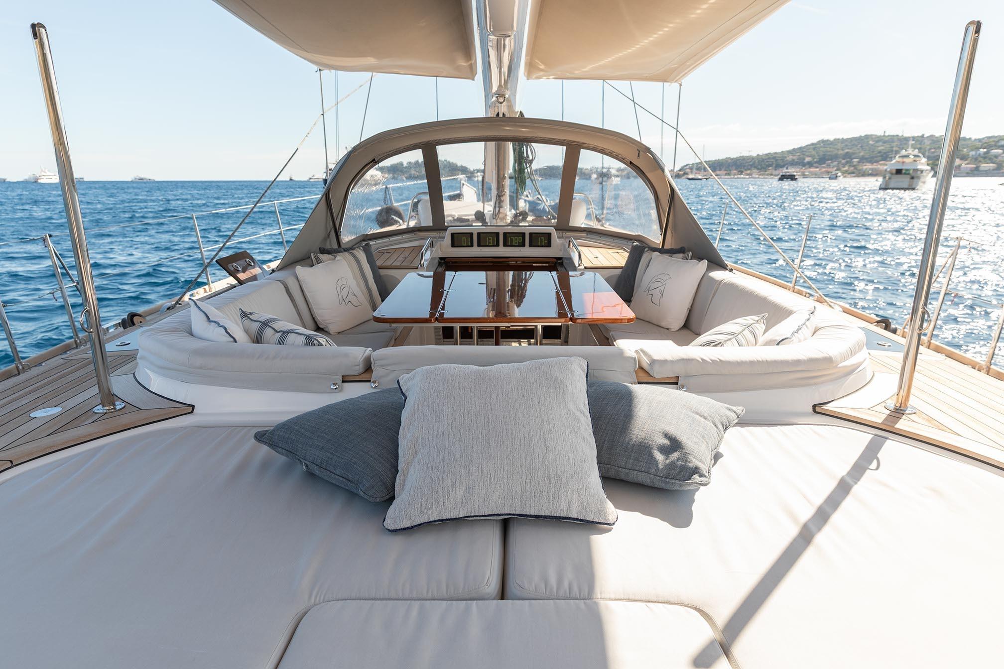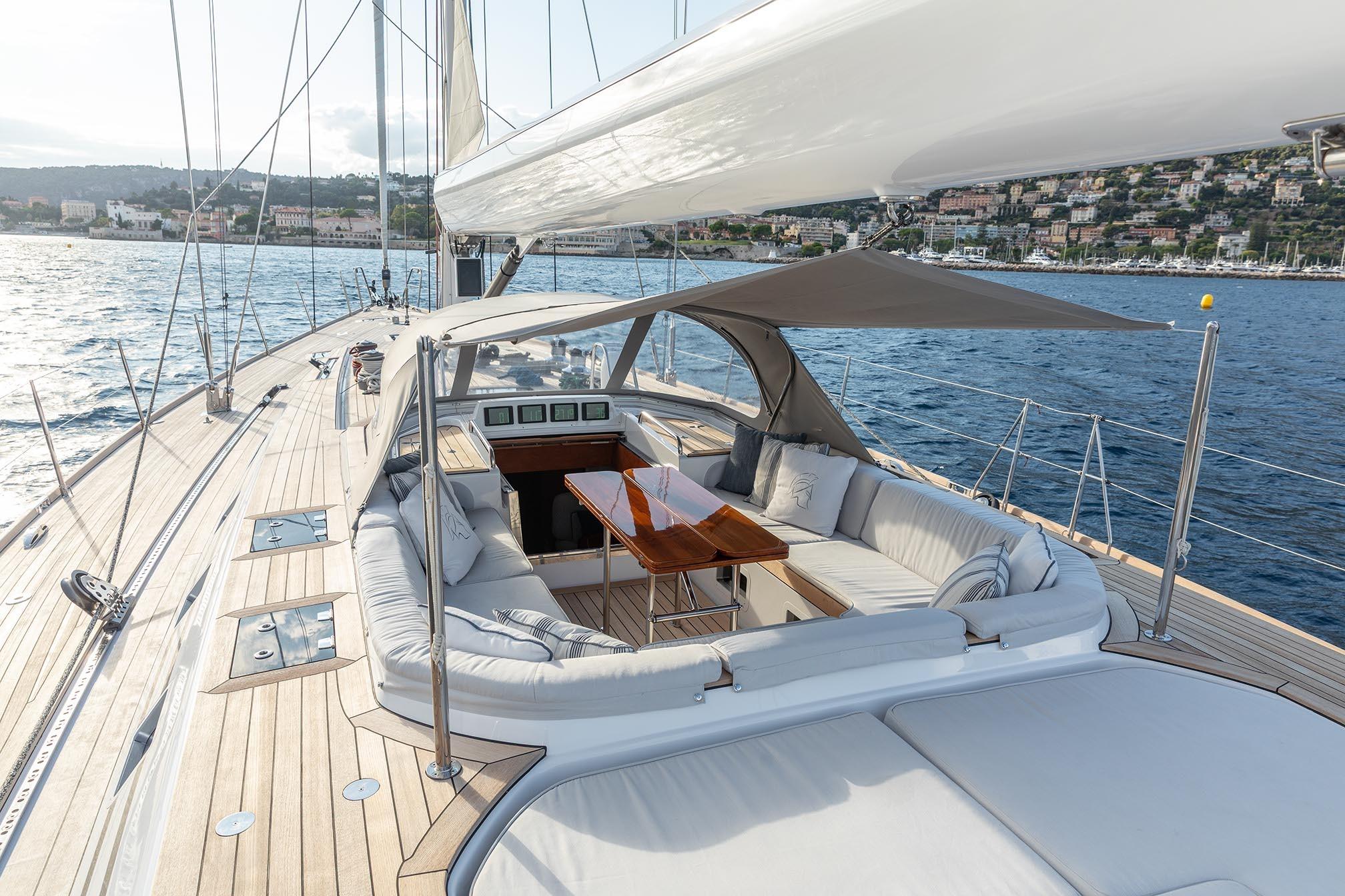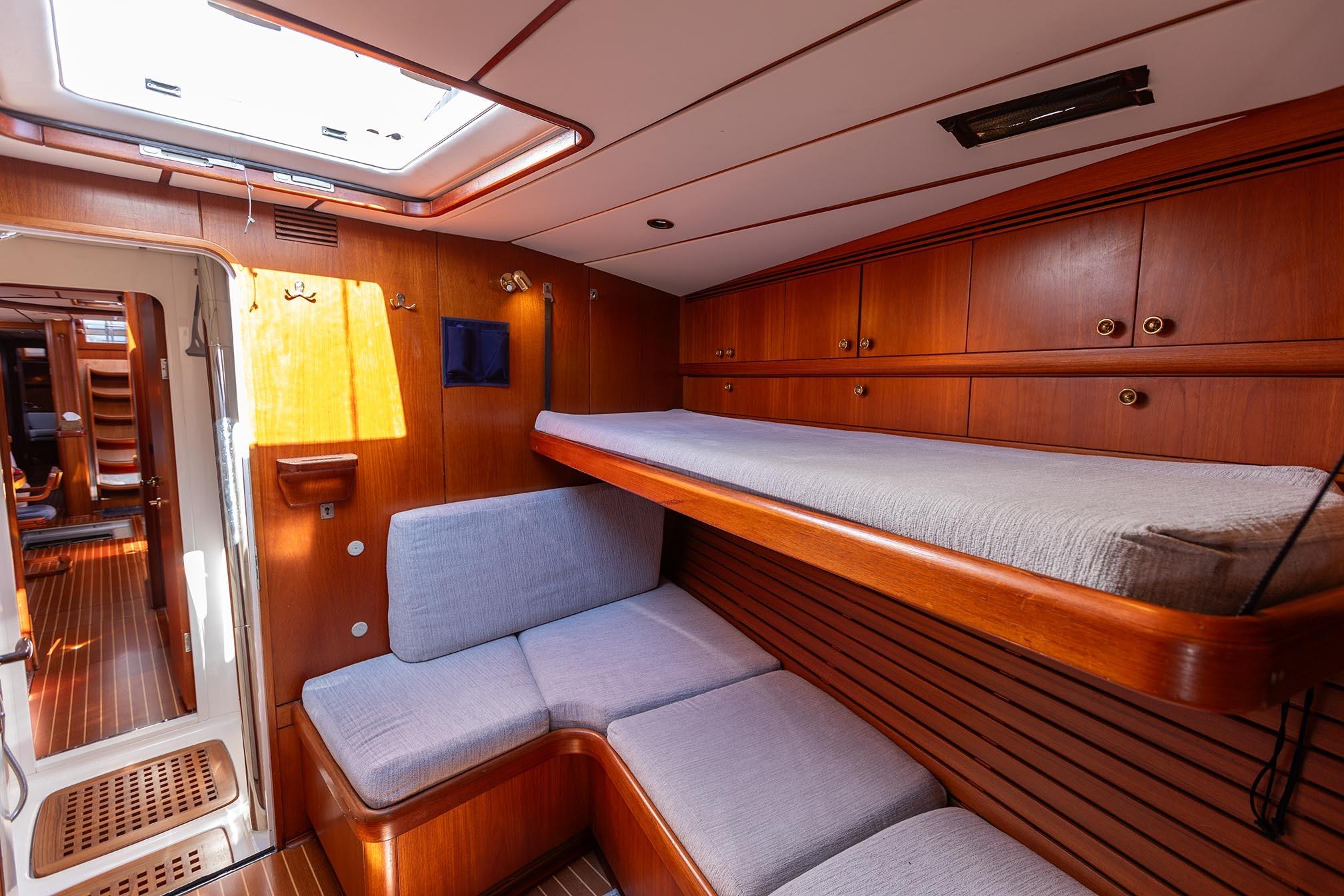 The four guest cabins offer exceptional versatility and comfort. They are complemented by a custom bar and a raised salon ceiling that enhances natural light and a sense of space throughout. Outdoor living is equally considered. The cockpit and deck areas provide multiple zones for dining, lounging, and entertaining, while the cockpit layout allows easy sail handling from the helm with hydraulic Lewmar winches and modern running rigging, ensuring effortless trimming and tacking.