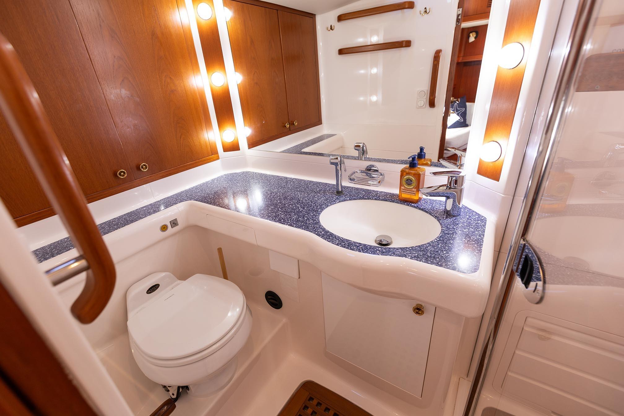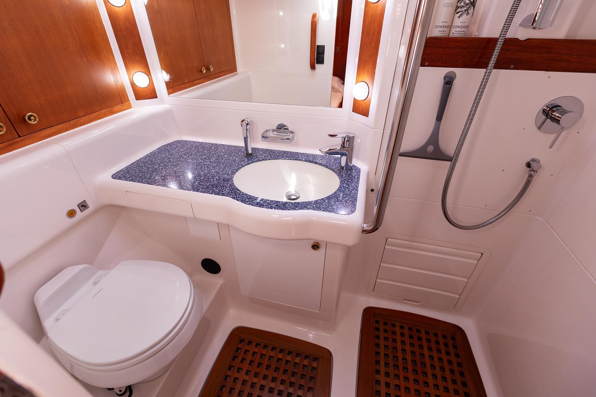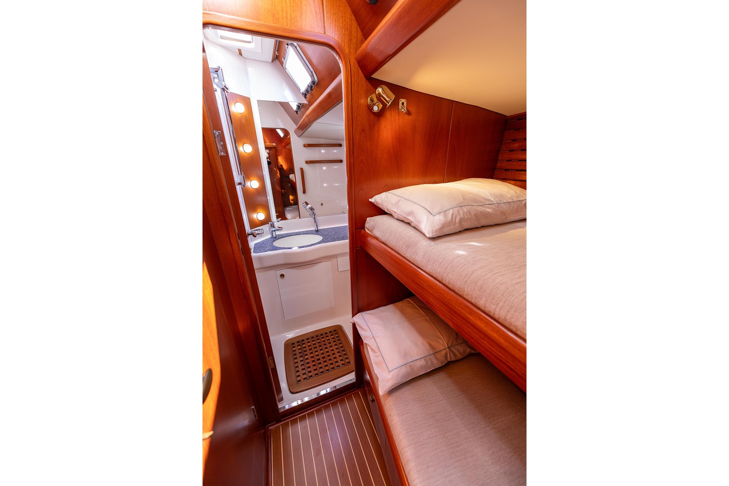 The four guest cabins offer exceptional versatility and comfort. They are complemented by a custom bar and a raised salon ceiling that enhances natural light and a sense of space throughout. Outdoor living is equally considered. The cockpit and deck areas provide multiple zones for dining, lounging, and entertaining, while the cockpit layout allows easy sail handling from the helm with hydraulic Lewmar winches and modern running rigging, ensuring effortless trimming and tacking.