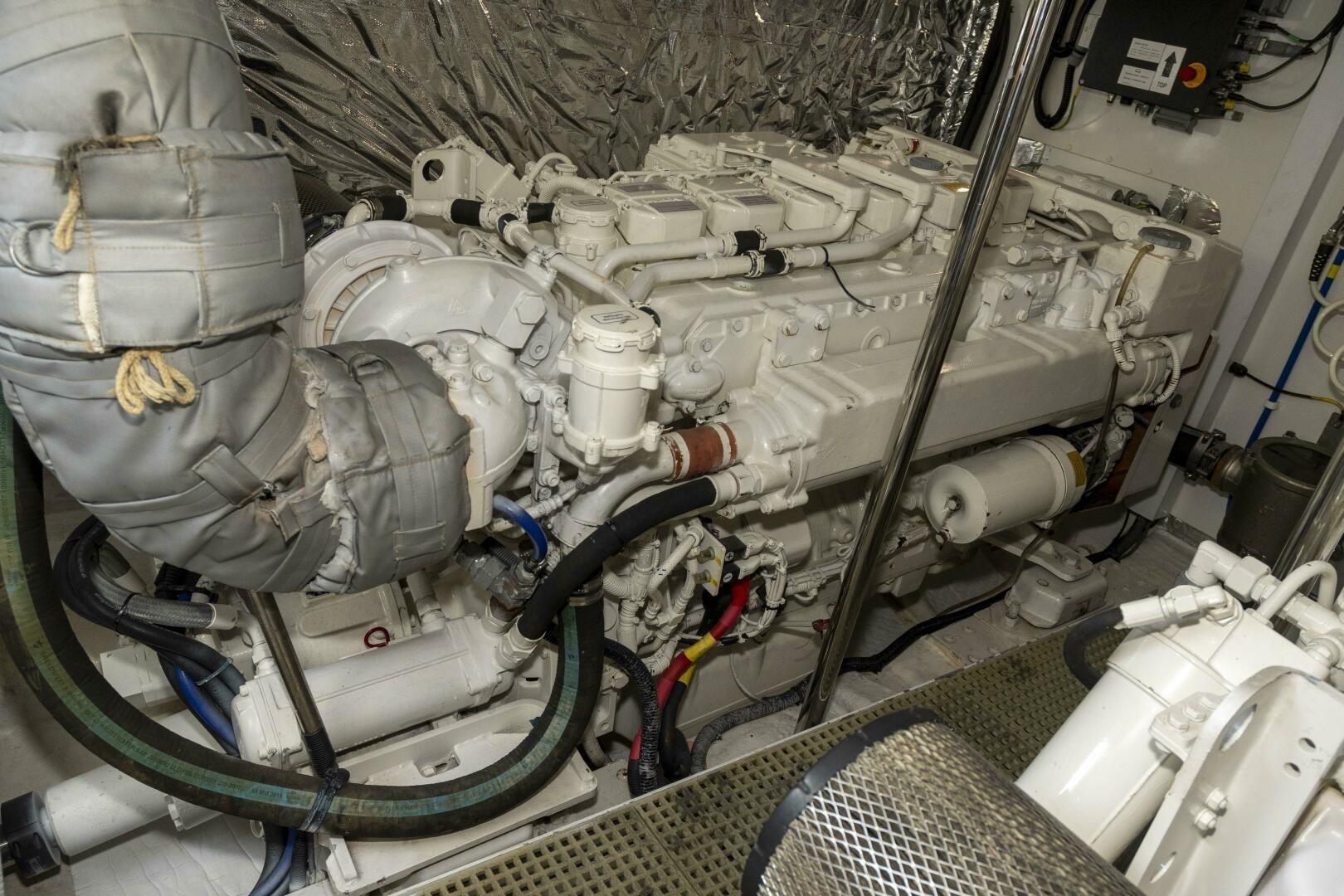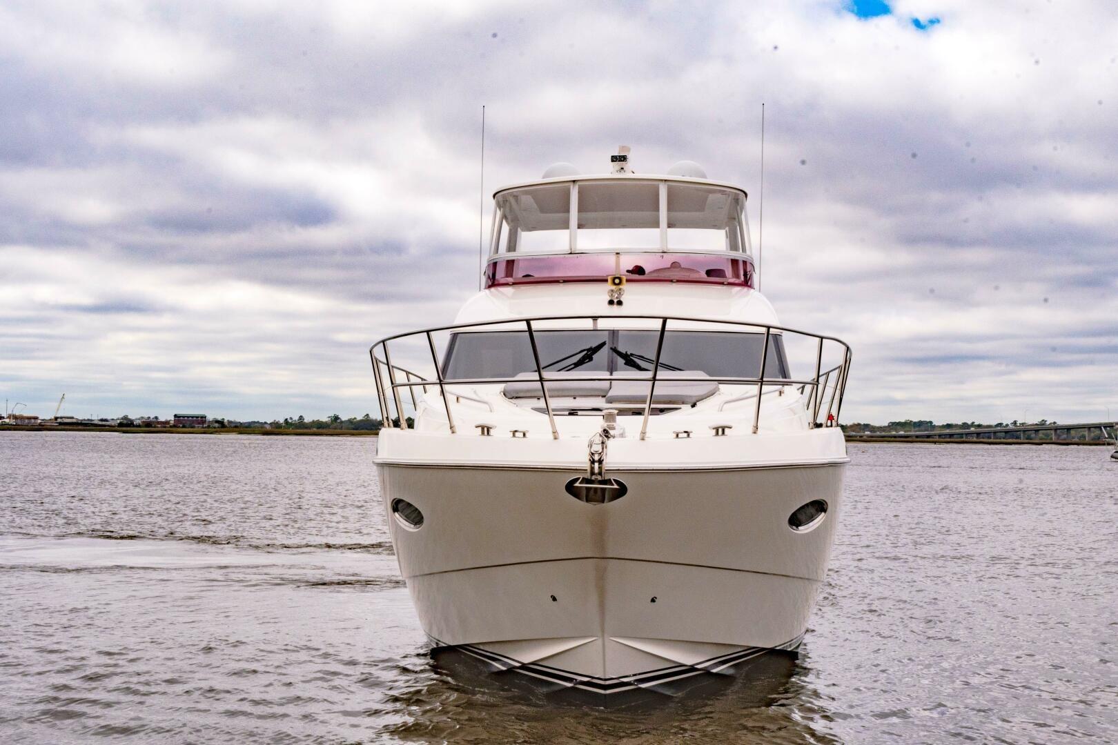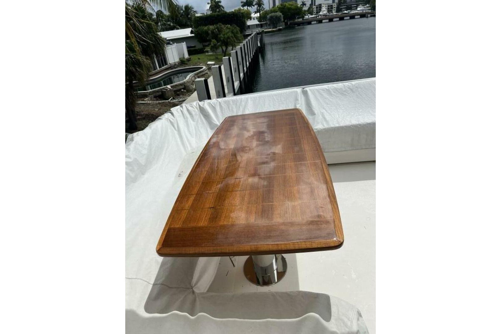 She has a 3-cabin floor plan with a full beam master and ensuite heads. The cockpit has teak decks and varnish teak table and shape seating with access to the crew cabin. There are stairs on either side to access the teak dive platform. The flybridge is very spacious with a hardtop and Strata glass enclosure. The Flybridge also has a full helm, multiple seat areas and wet bar with a grill.