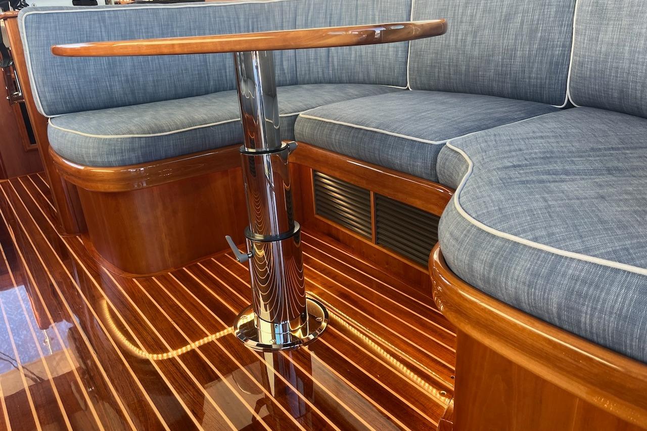 - Two removable gloss varnished teak tables in cockpit for “Al Fresco” dining. Tables include additional shorter stainless steel pedestals and cushions to convert the “L” shaped settee into a lounge.