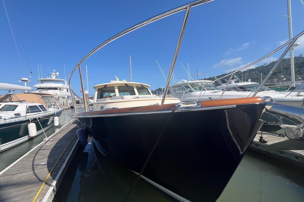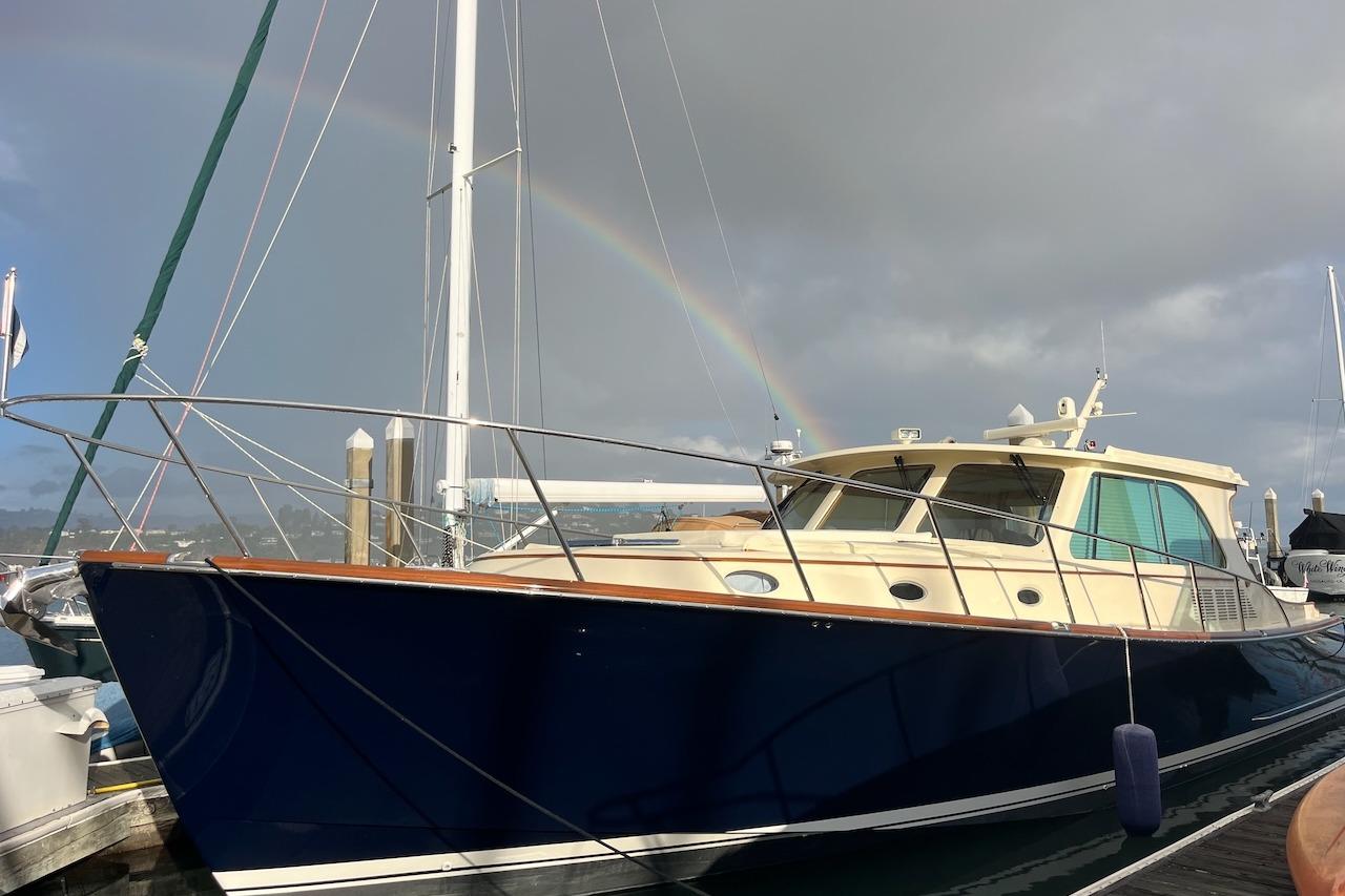 - Mast: Hinckley aluminum mast atop pilothouse roof, powder coated to match deck.