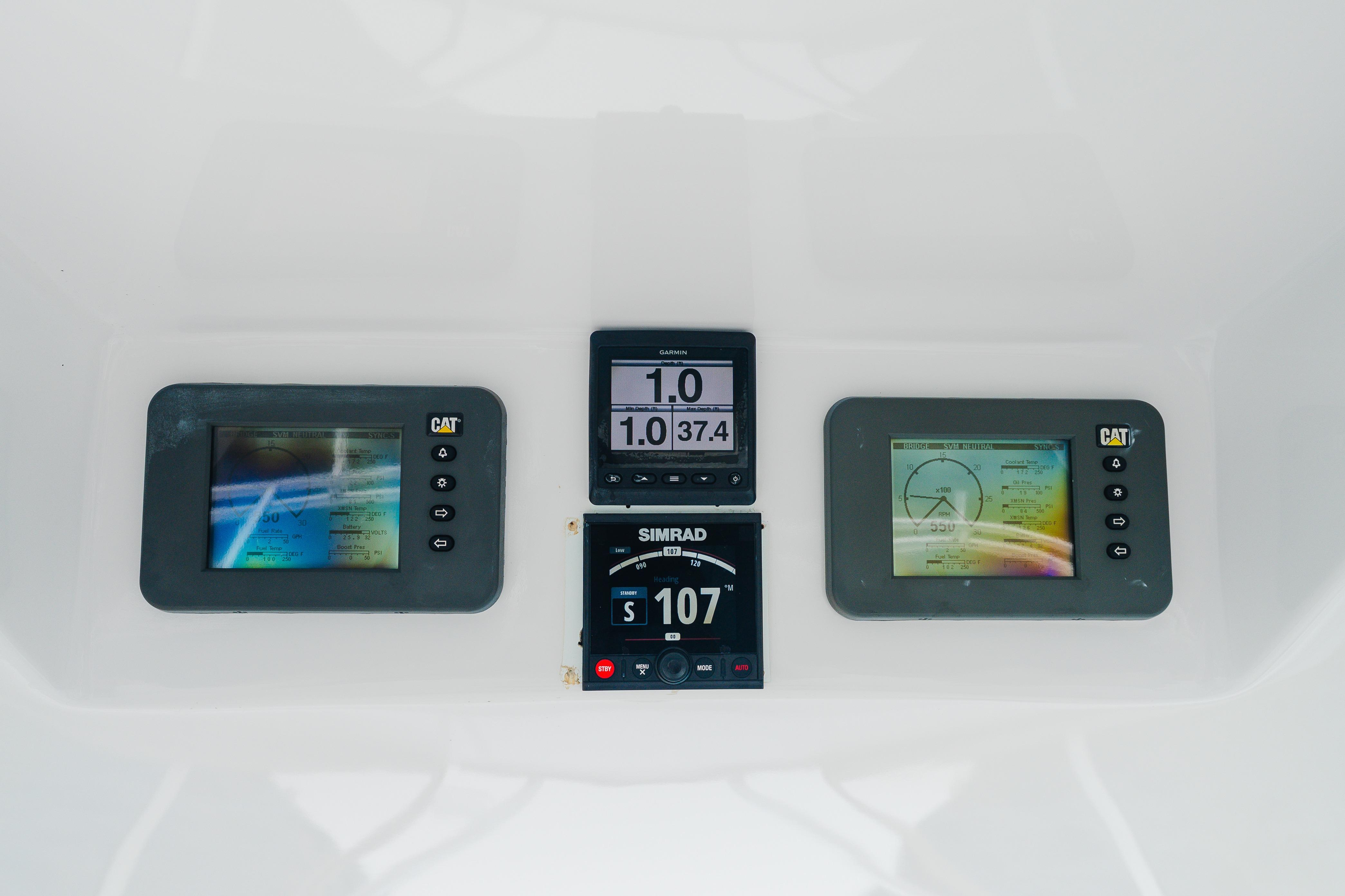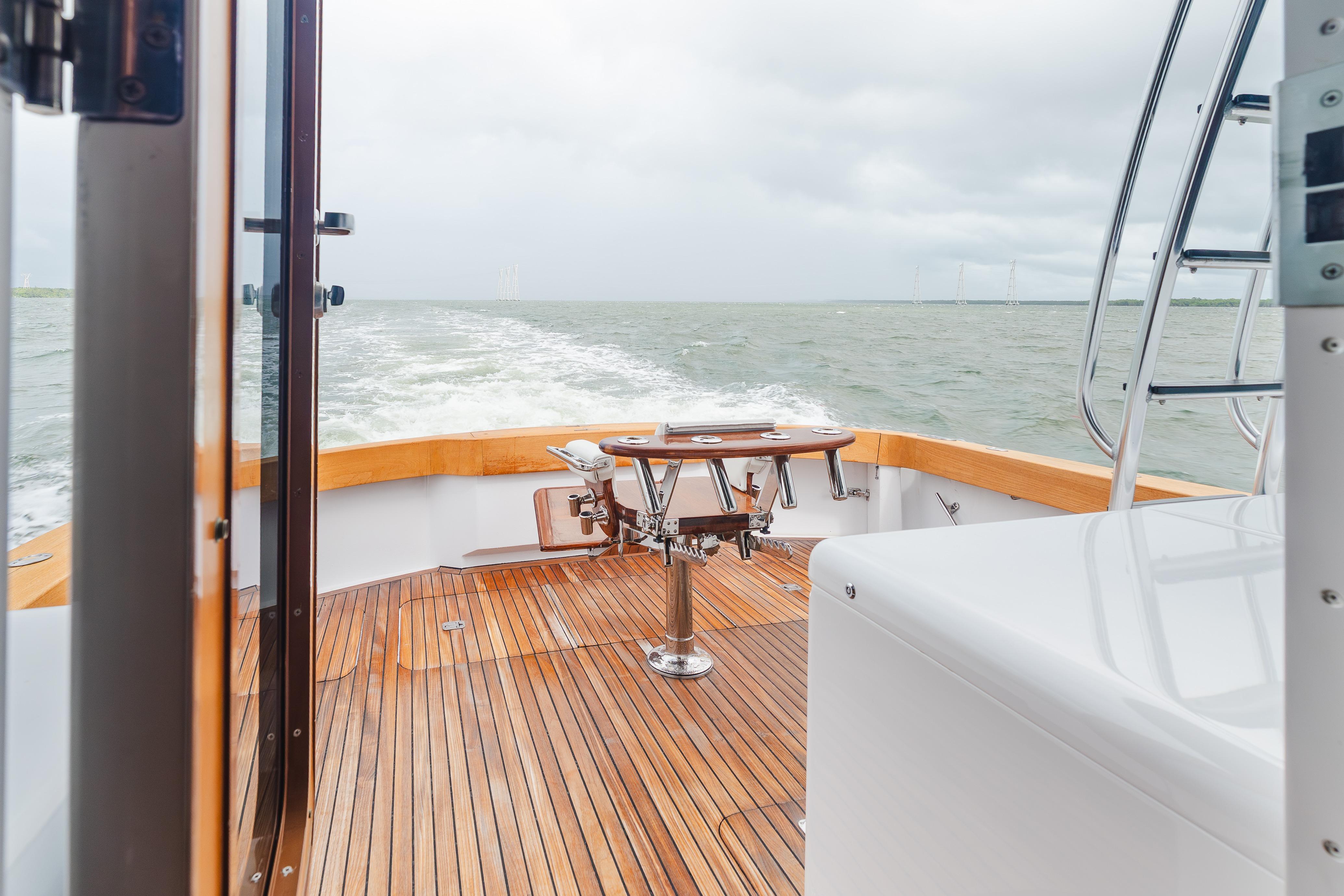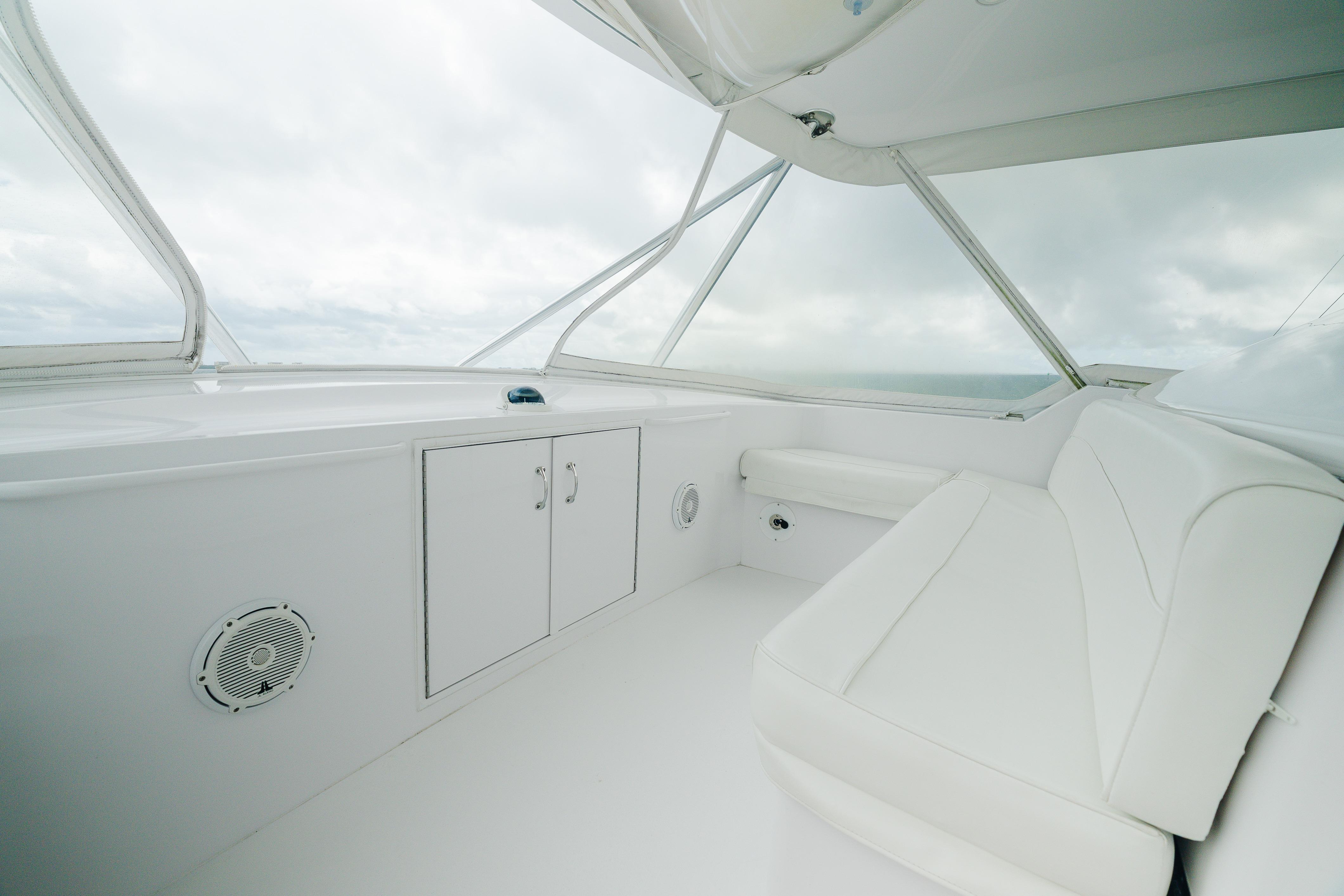 This custom half tower features a drop-down compartment above the helm for CAT gauges, the pilot, digital depth, and teaser reels.