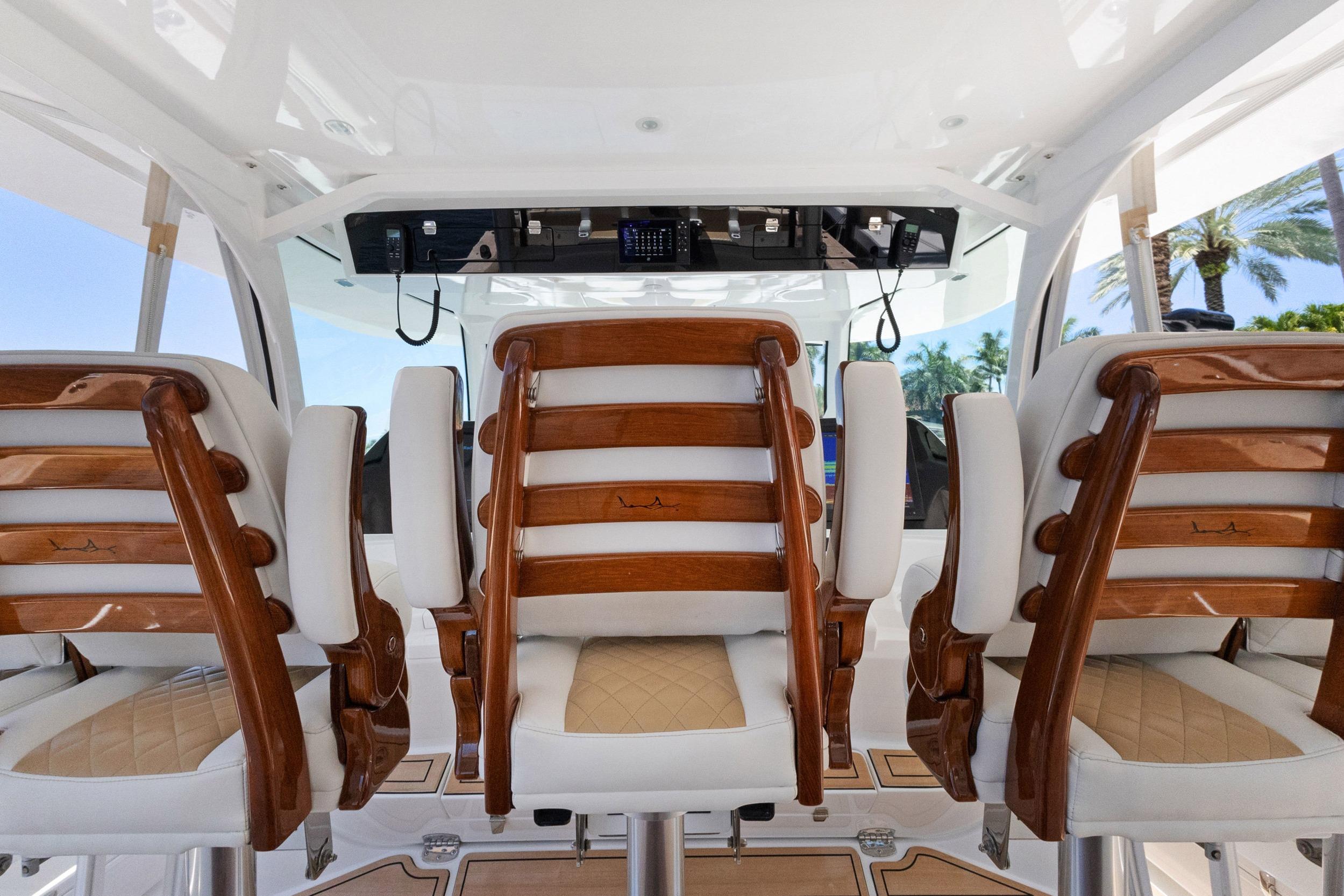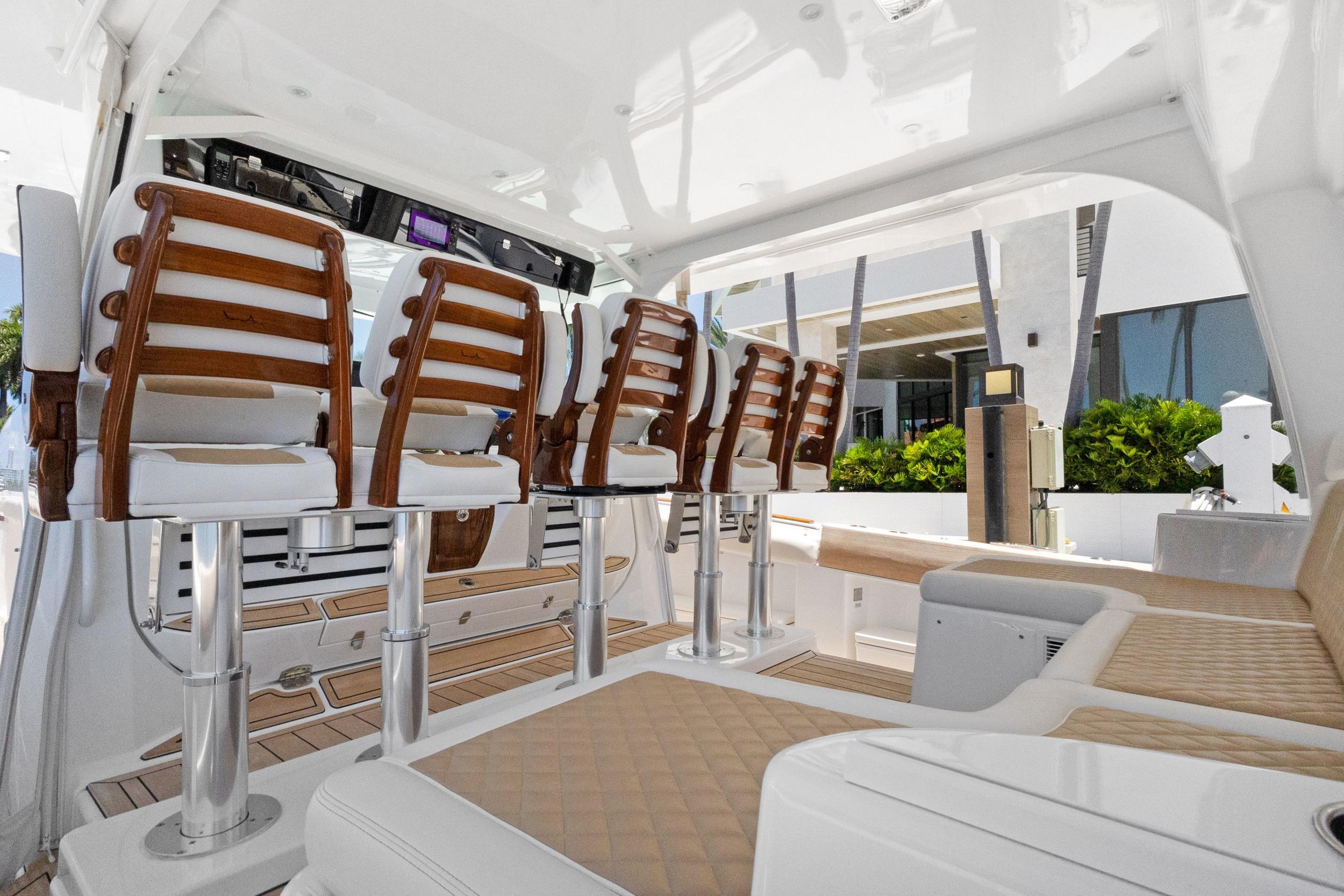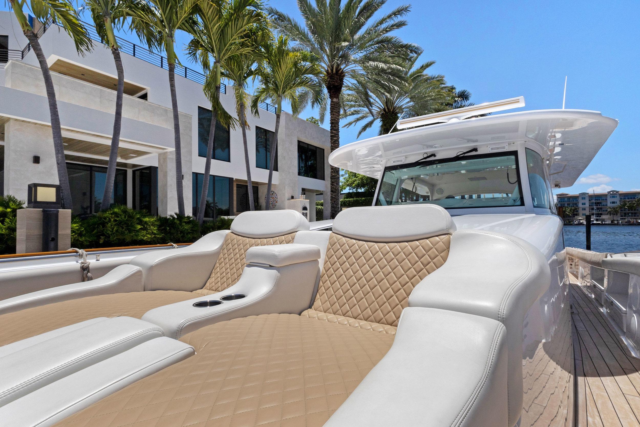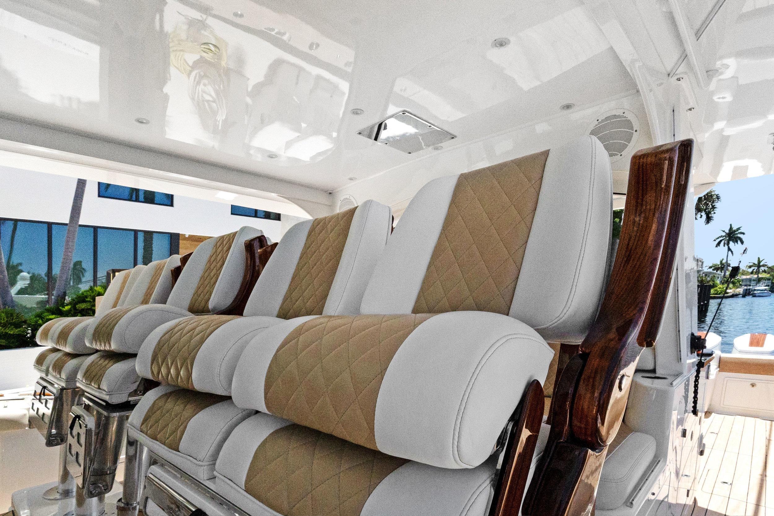 Luxury Appointments: Release Marine quint helm seats, custom Bentley-style diamond stitching, teak decking, JL Audio Luxe marine sound, upgraded underwater lighting