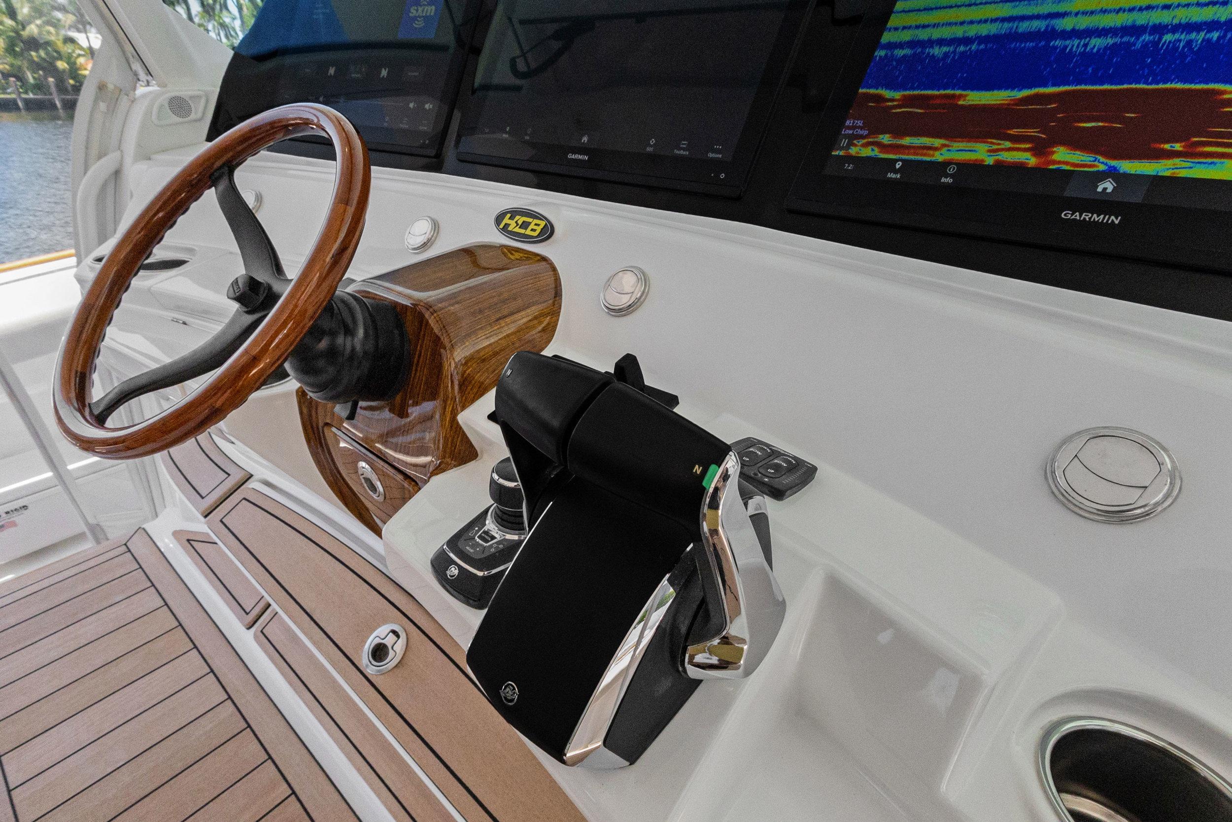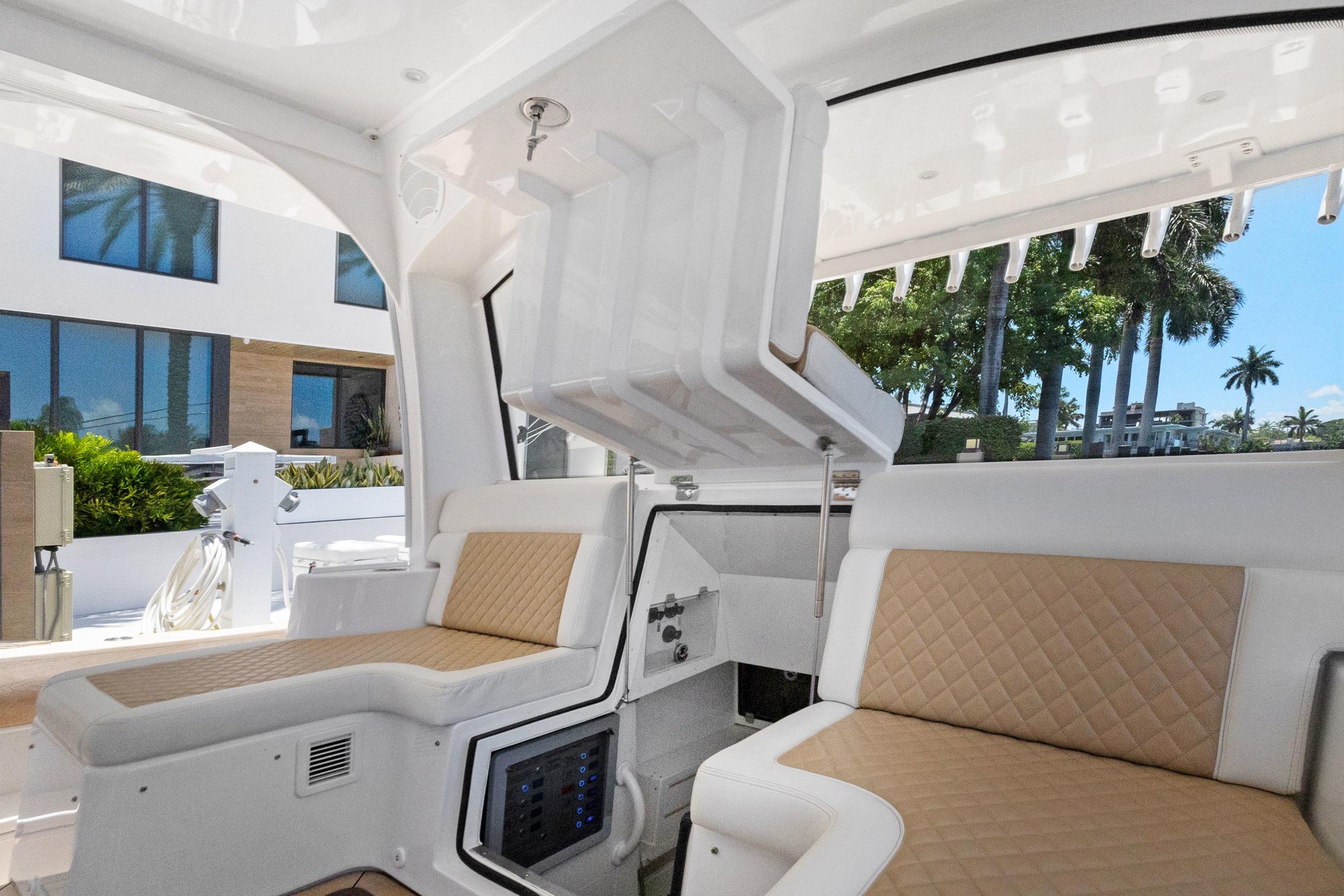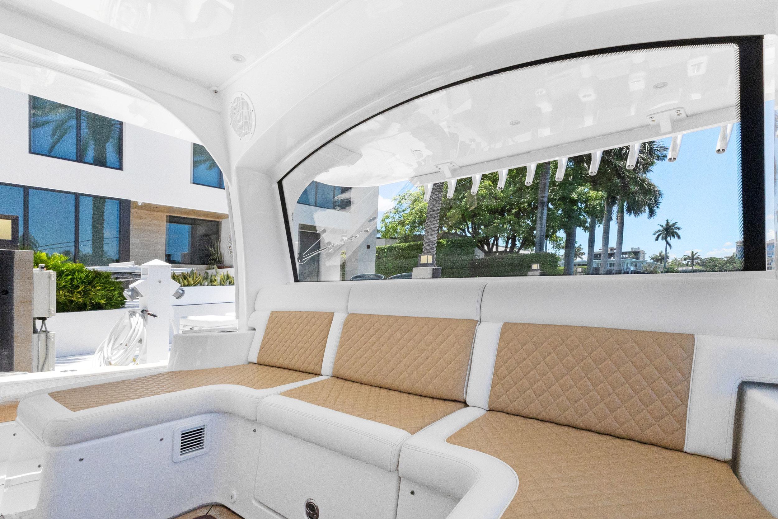 Luxury Appointments: Release Marine quint helm seats, custom Bentley-style diamond stitching, teak decking, JL Audio Luxe marine sound, upgraded underwater lighting