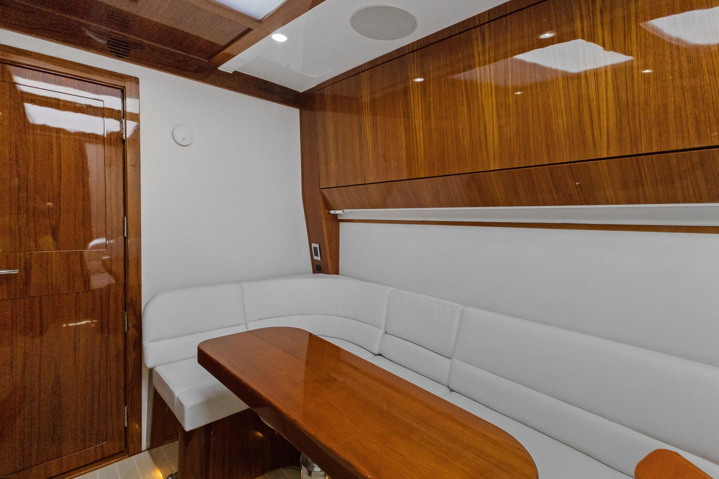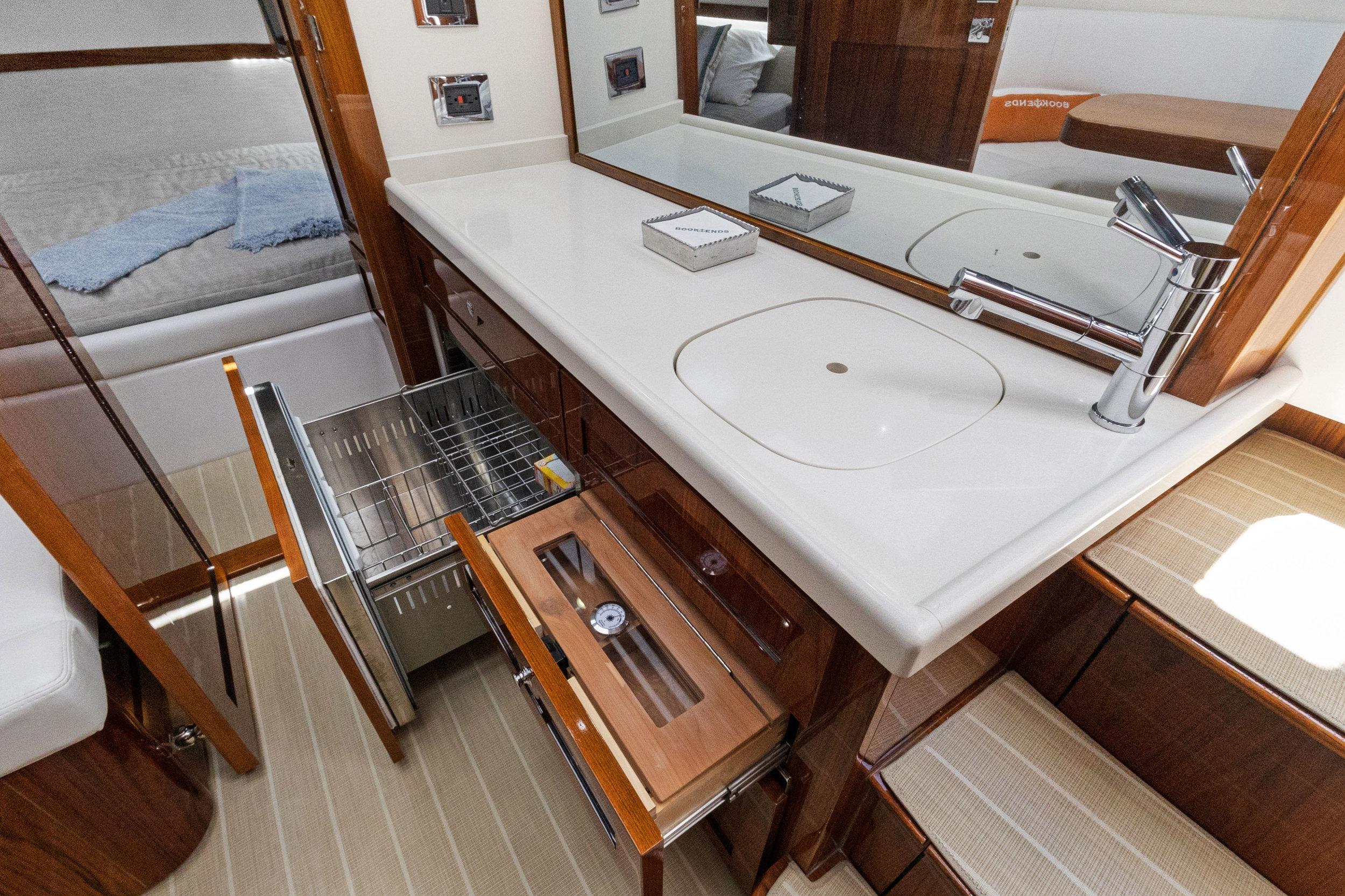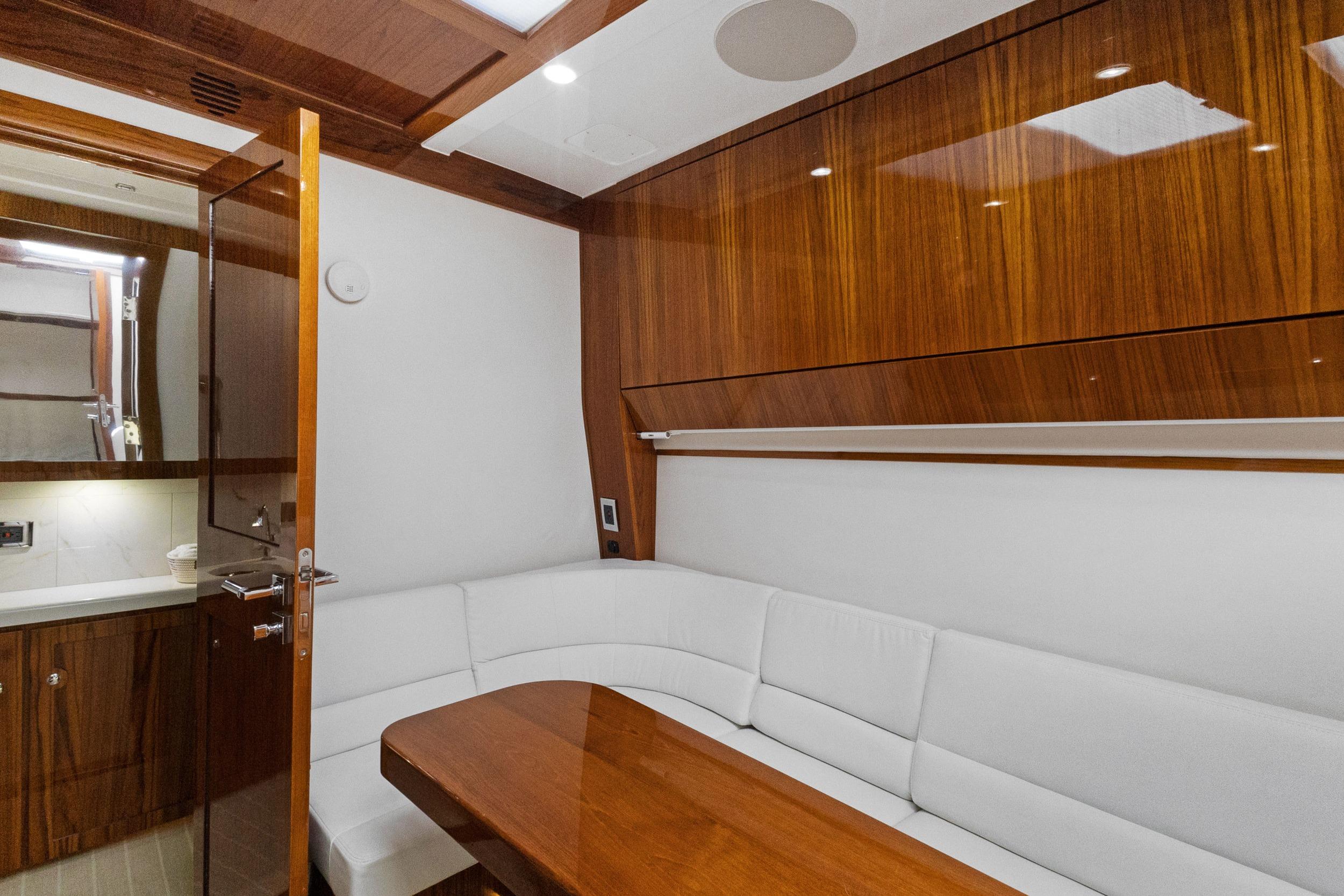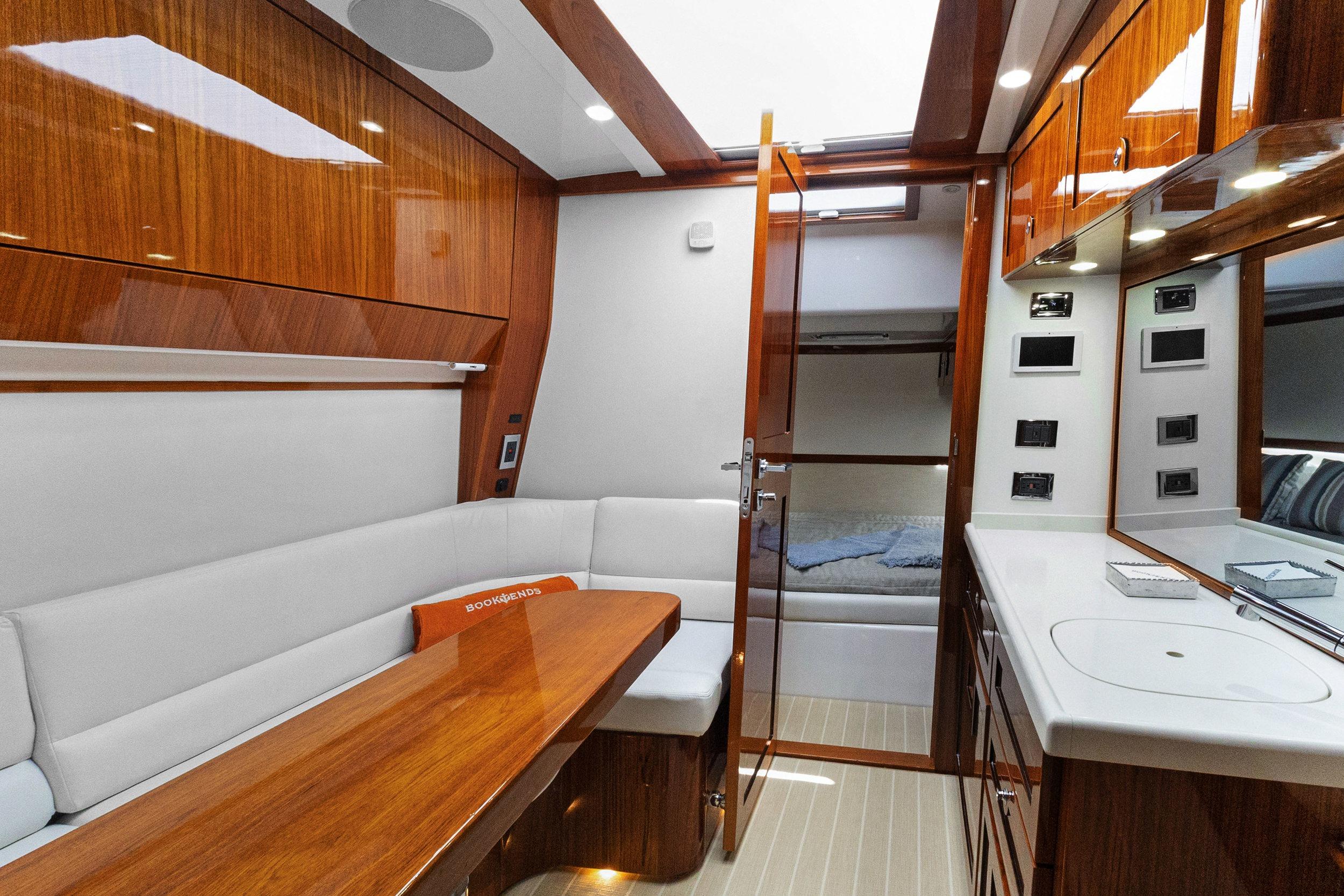 Luxury Appointments: Release Marine quint helm seats, custom Bentley-style diamond stitching, teak decking, JL Audio Luxe marine sound, upgraded underwater lighting