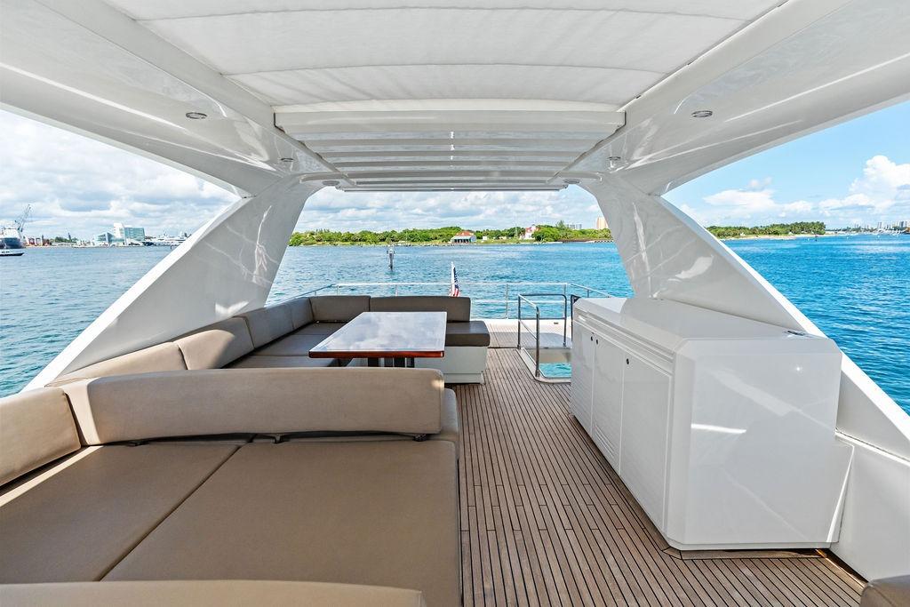 The flybridge features a hardtop with retractable sunroof, wet bar, dining area, and sun loungers, while the foredeck offers a private retreat with seating and a sunpad. Aft, the cockpit provides shaded alfresco dining, and the hydraulic swim platform allows effortless access to the water for tenders and toys.
