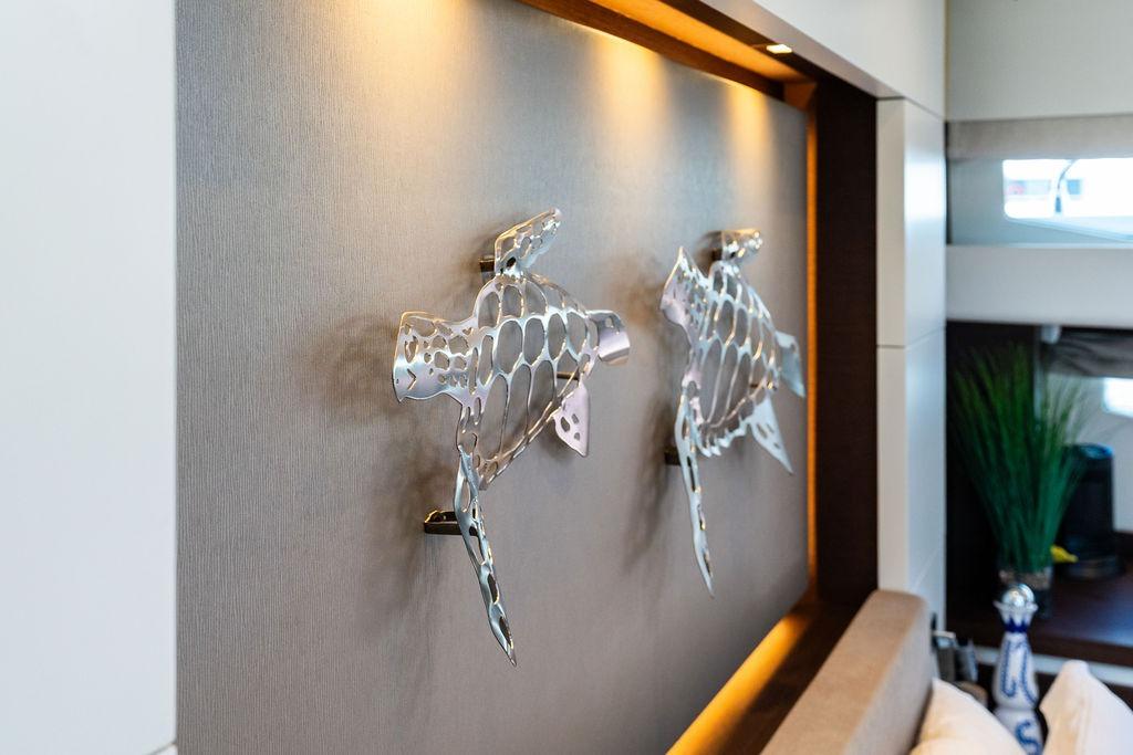 Her layout includes four staterooms, highlighted by a private master, plus separate crew quarters aft, comfortably accommodating eight guests. Expansive salon and dining areas with panoramic windows create a bright, inviting interior, while outdoor living is maximized with multiple lounge and dining spaces across the flybridge, foredeck, and aft deck.