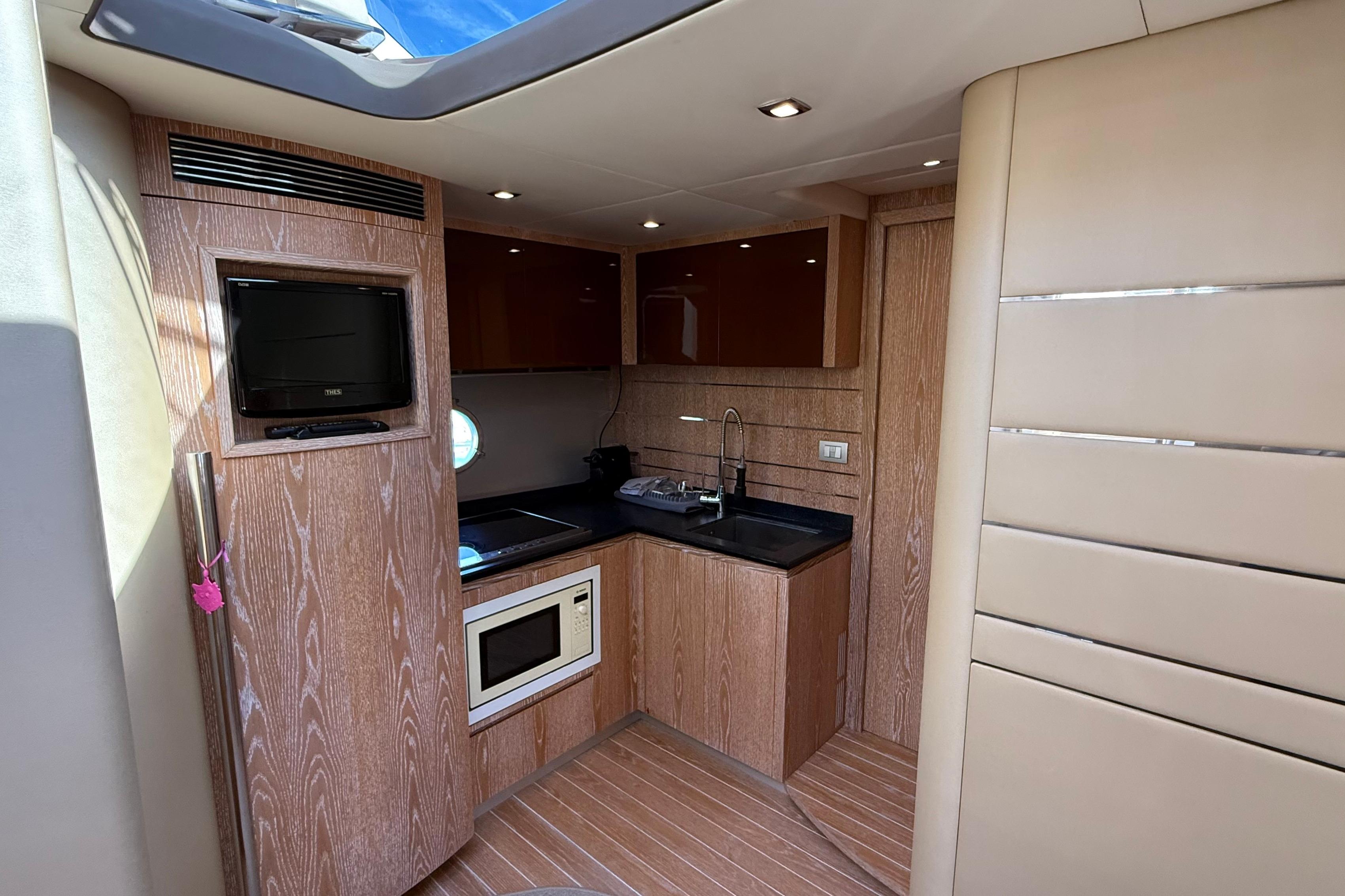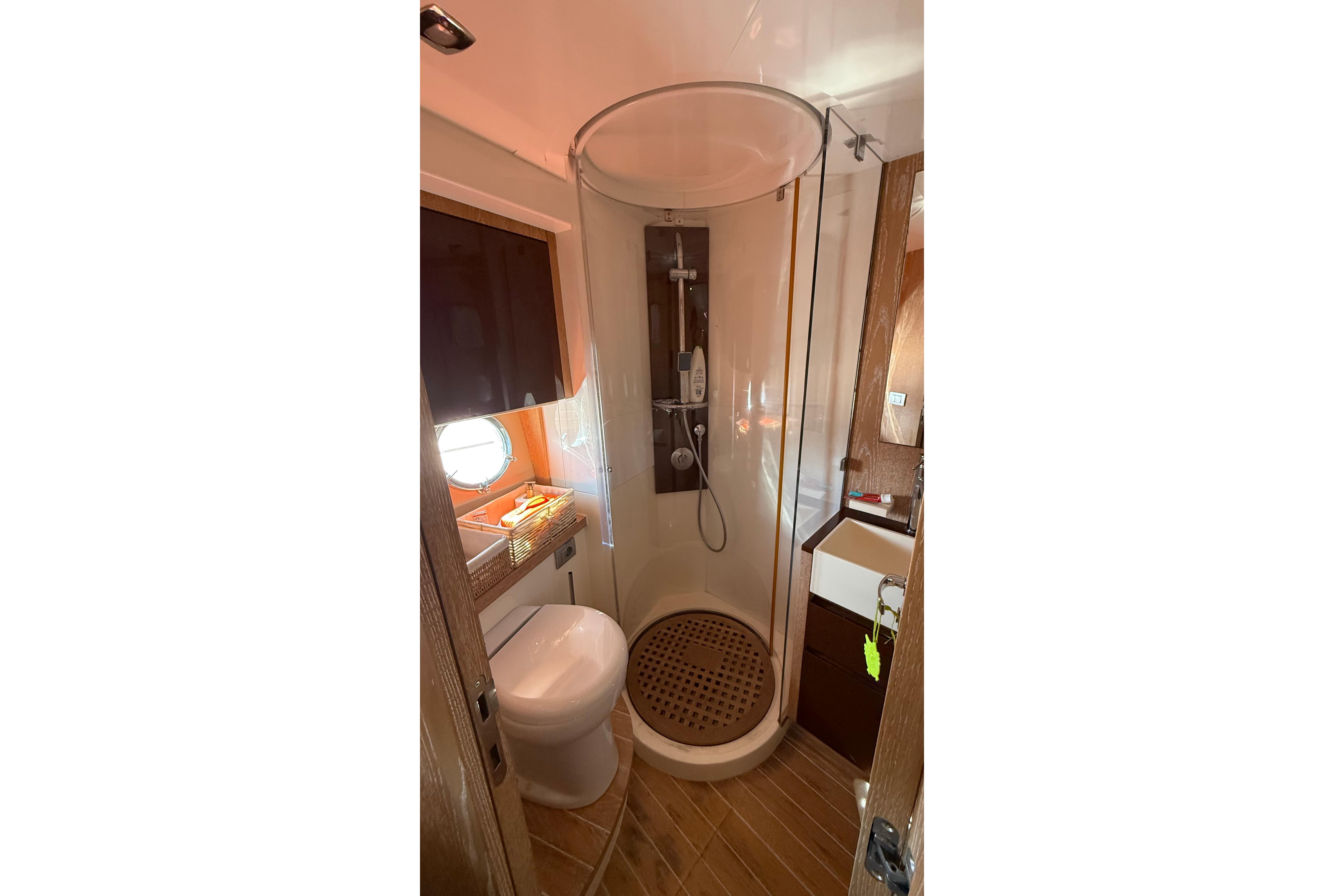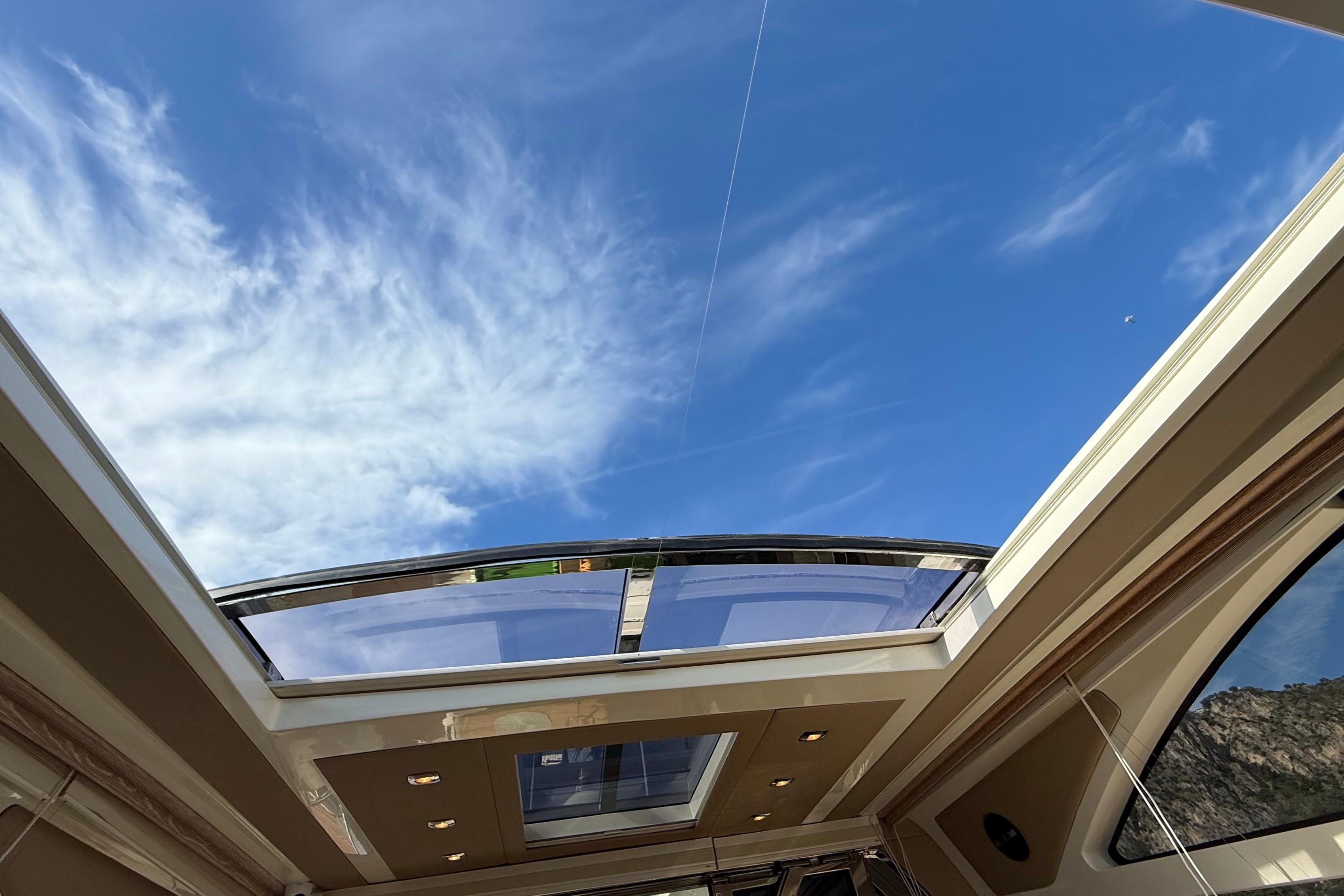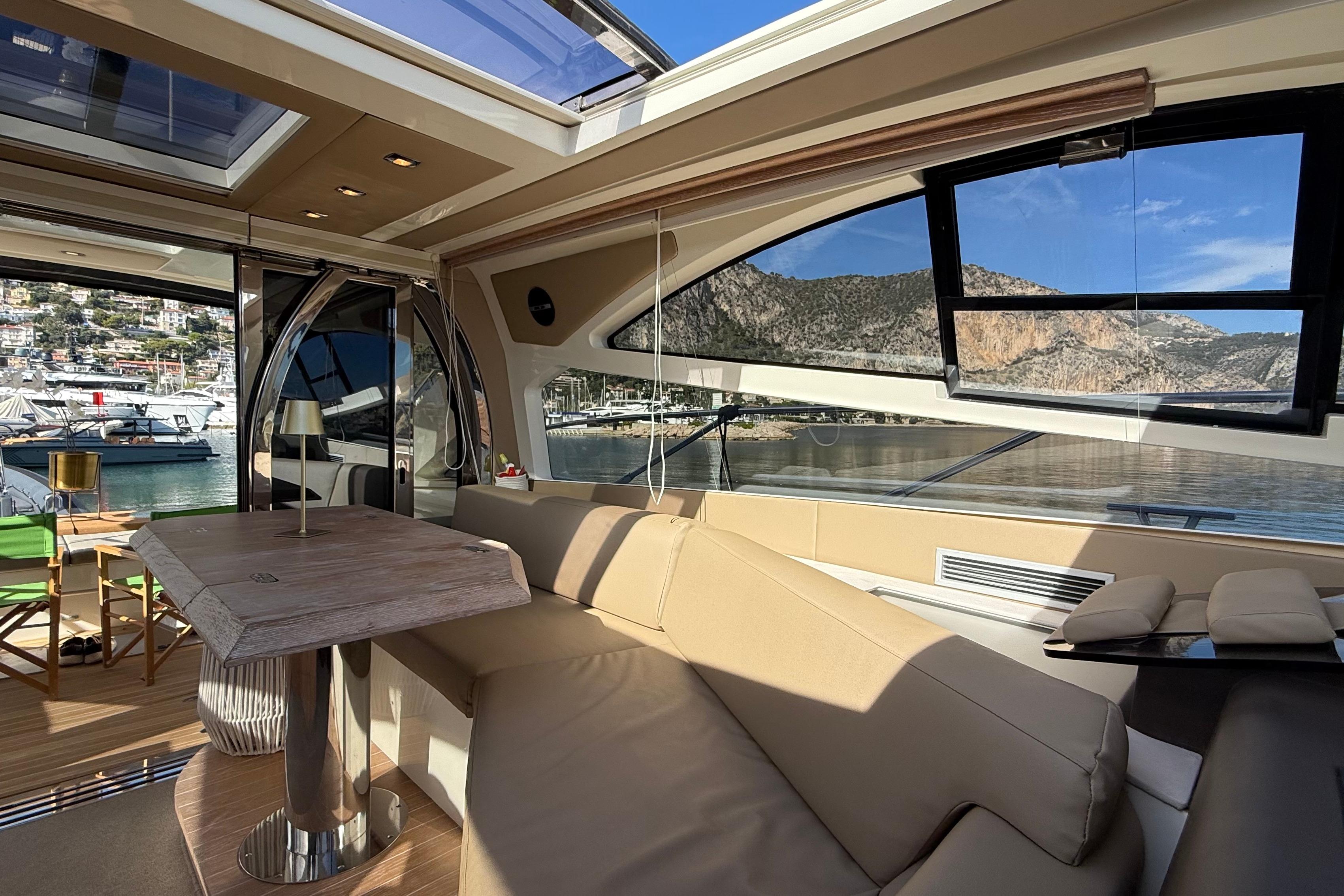 Her elegant interior layout includes two cabins with ensuite bathrooms, a convertible saloon, air conditioning and a generator, offering all the comfort needed for longer stays on board. The hydraulic bathing platform and tender garage — complete with an electric-powered tender — enhance both usability and leisure at anchor.