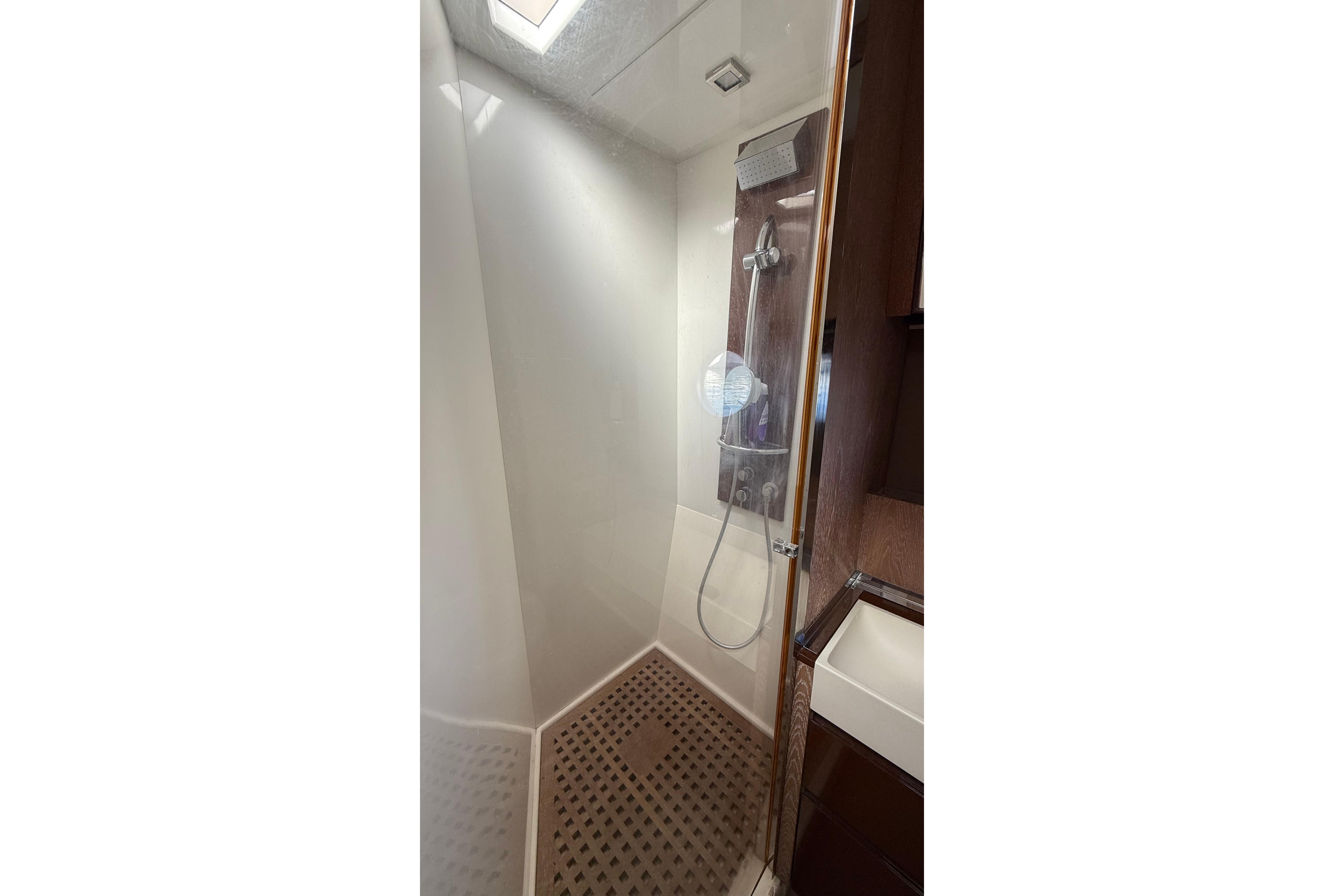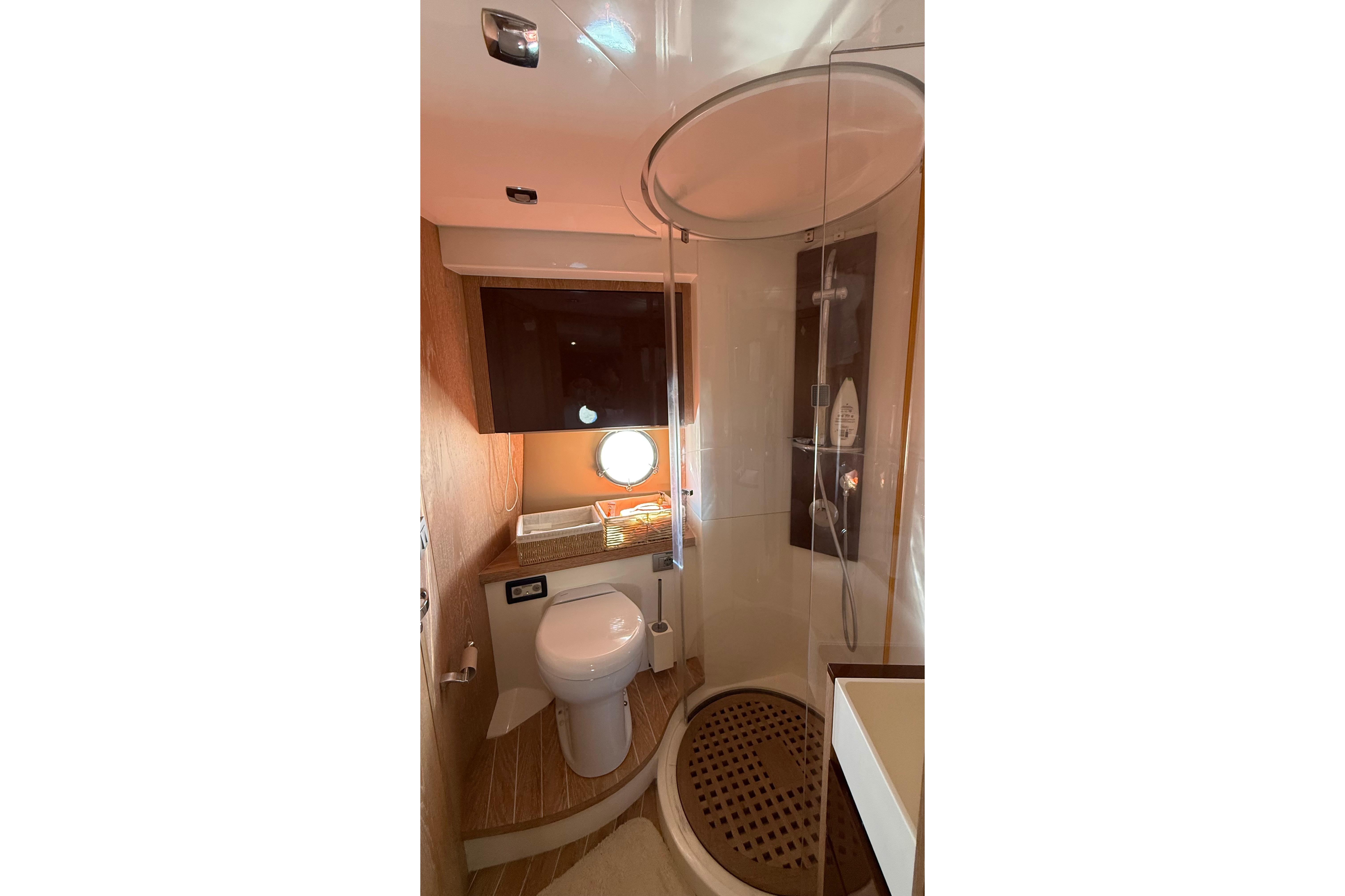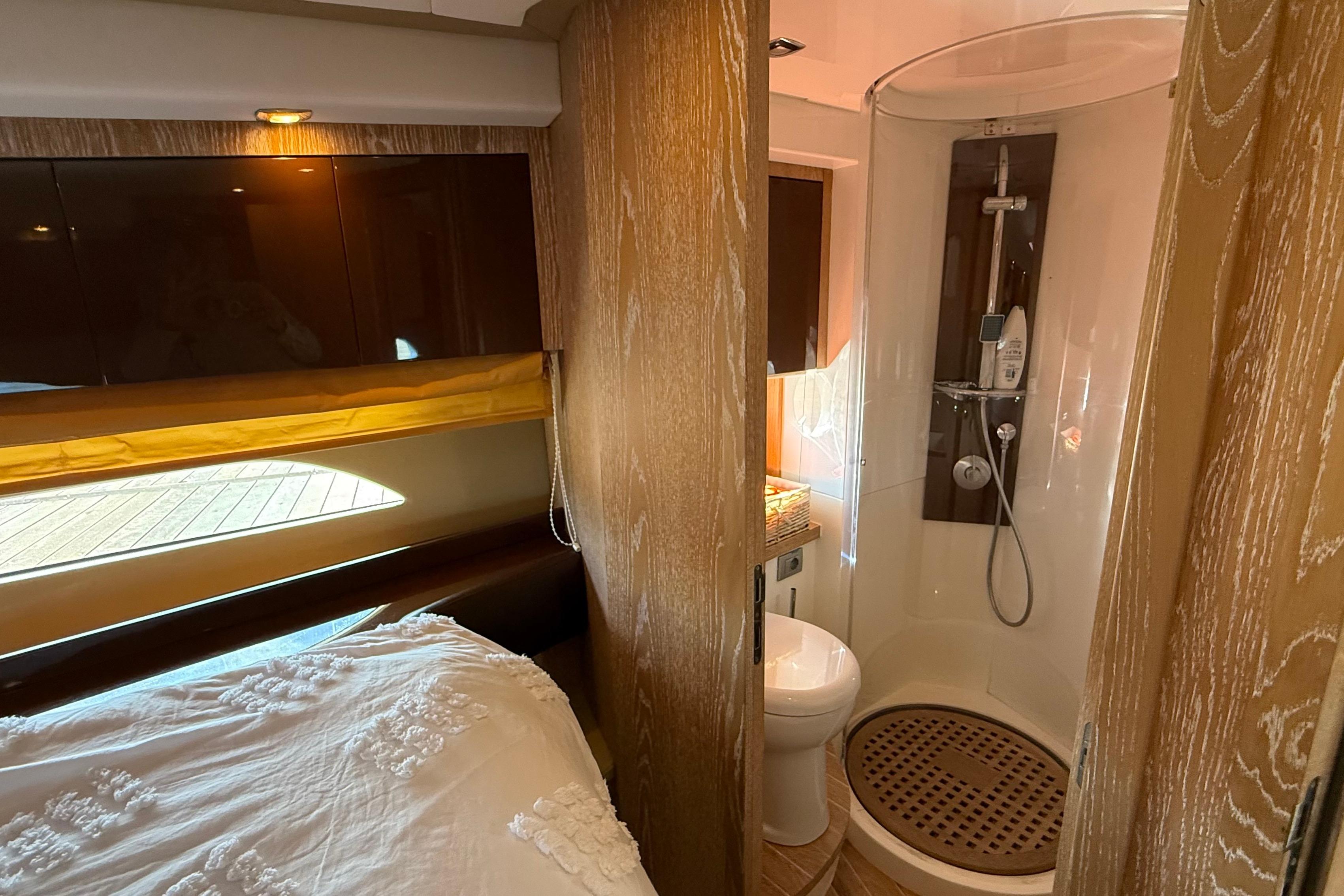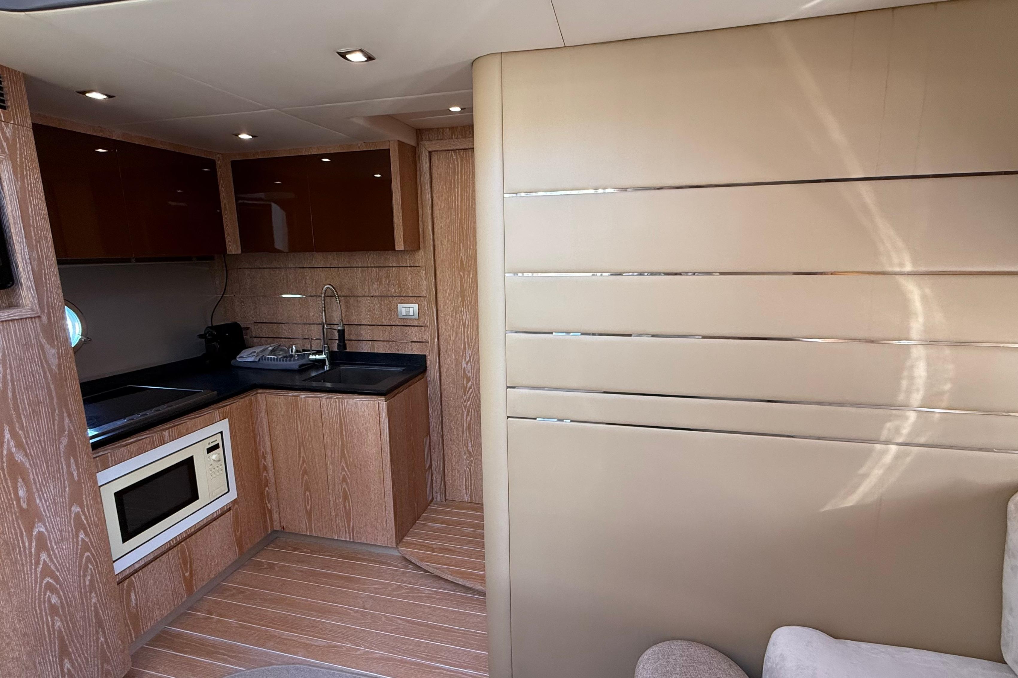 Her elegant interior layout includes two cabins with ensuite bathrooms, a convertible saloon, air conditioning and a generator, offering all the comfort needed for longer stays on board. The hydraulic bathing platform and tender garage — complete with an electric-powered tender — enhance both usability and leisure at anchor.