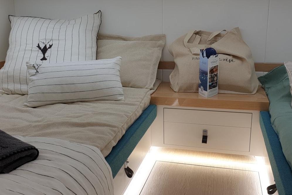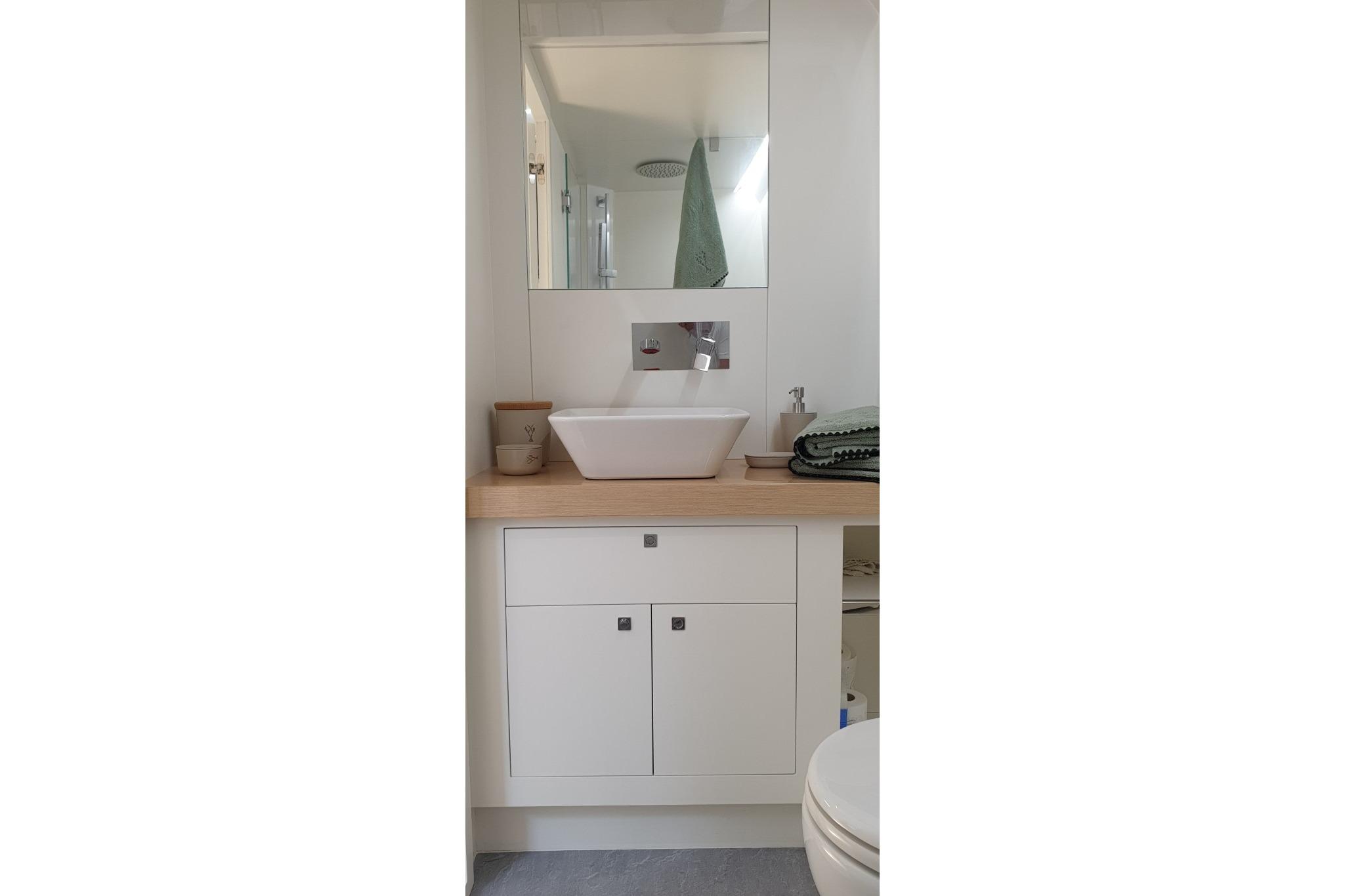 Tout est à portée de main avec un seul salle de bain, idéal pour le confort en mer. Ce modèle d'occasion est encore en excellent état et est disponible en stock au prix de 790 000 euros. Il est équipé de toutes les commodités que vous pourriez désirer : réfrigérateur, chauffage, climatisation, ainsi qu'un propulseur d'étrave pour faciliter les manœuvres.