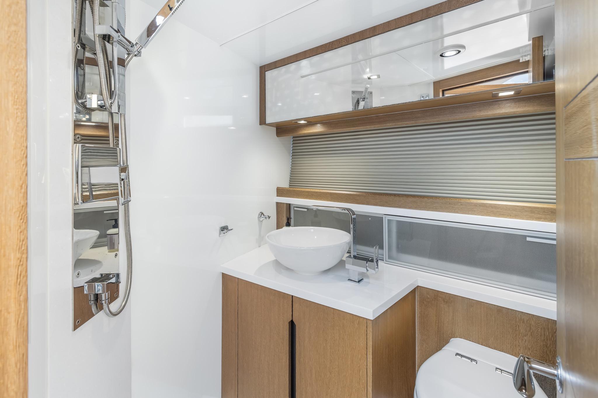 The Galeon 43 HTC offers the sleek exterior lines of a hardtop express without compromising interior volume. Inside, her salon impresses with high ceilings and abundant natural light flowing directly into an atrium-style galley down complimented with a two-stateroom layout, below deck. Her outdoor spaces are equally well thought out as well. The aft deck features a clever sliding seat module that extends aft to open up the cockpit for entertaining, while the hydraulic swim platform can either serve as a teak beach for water access, and/or store your personal watercraft of choice.