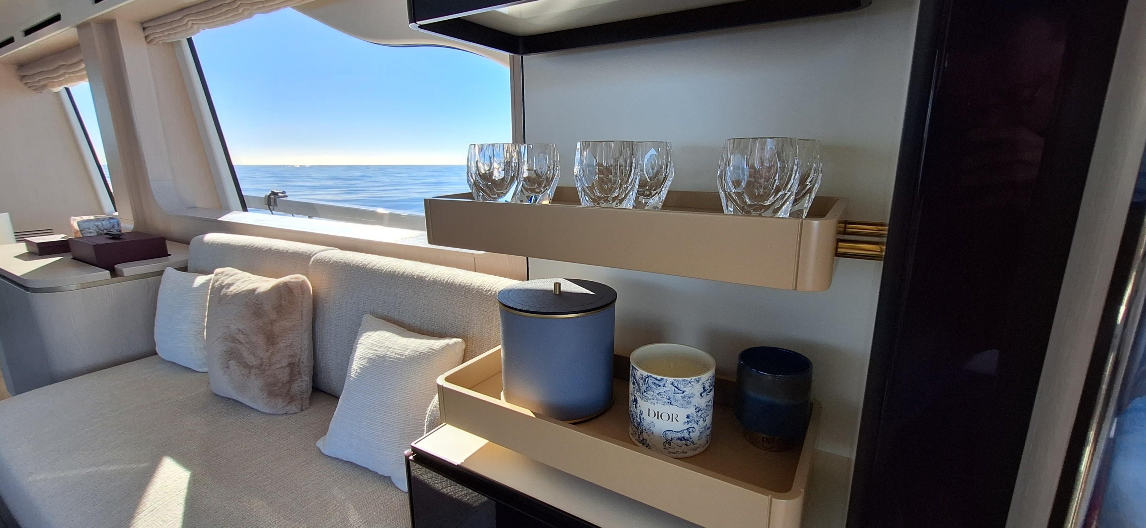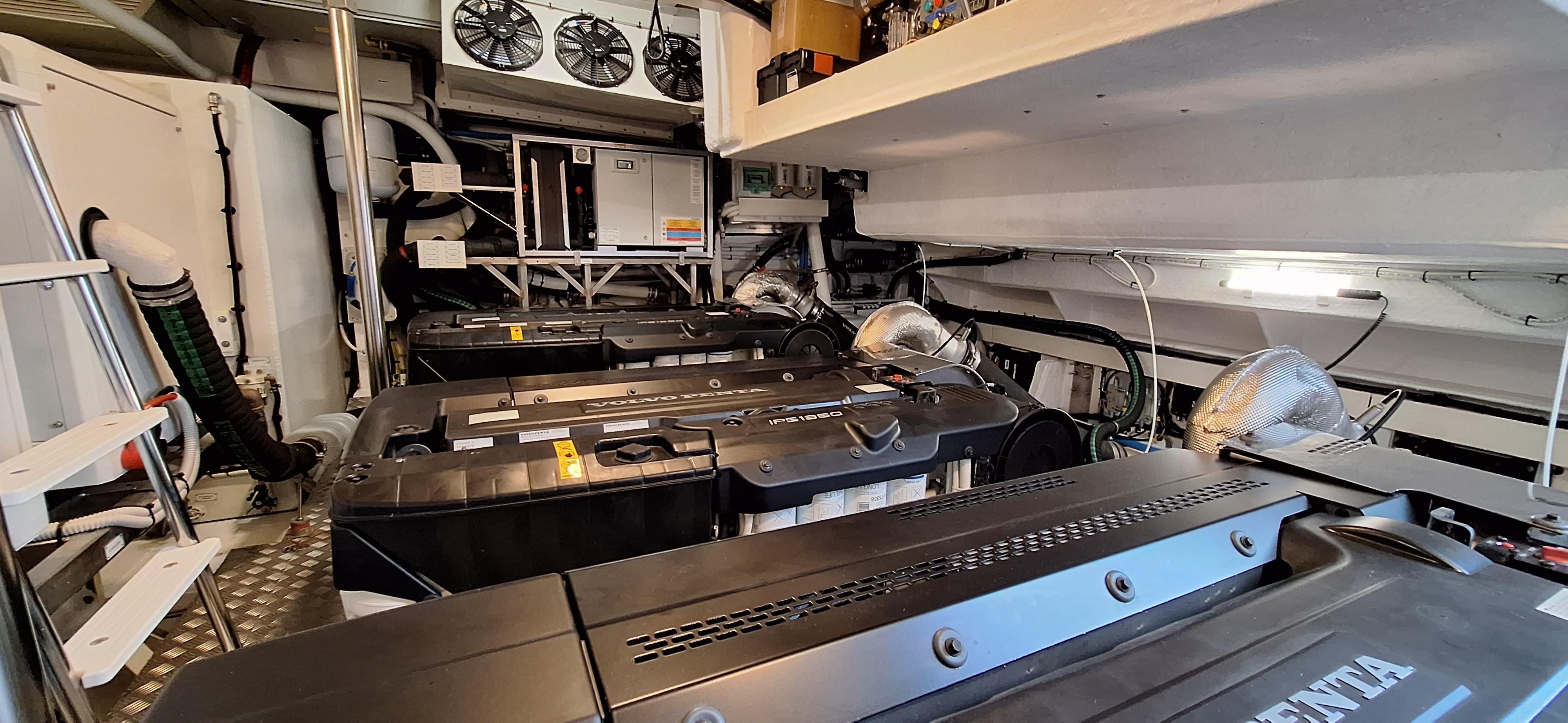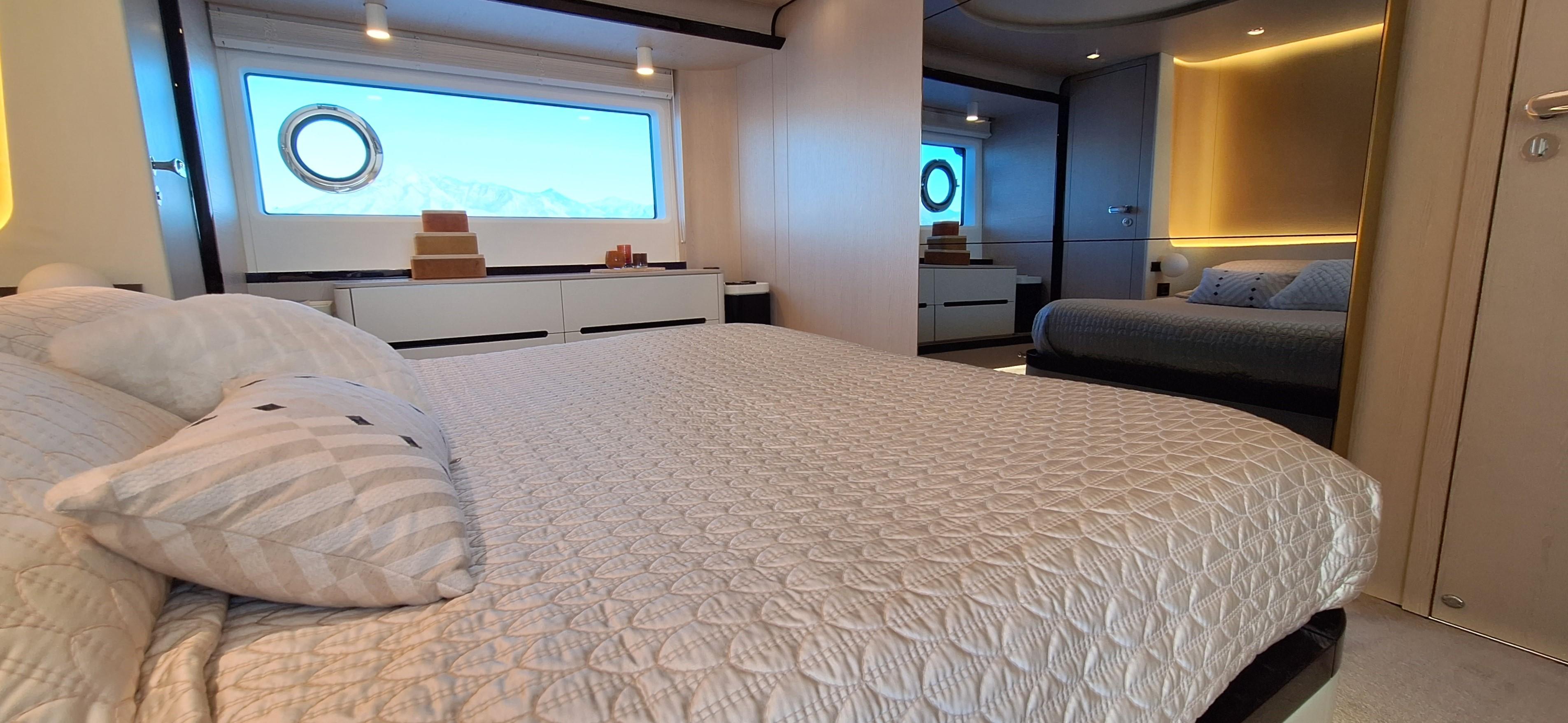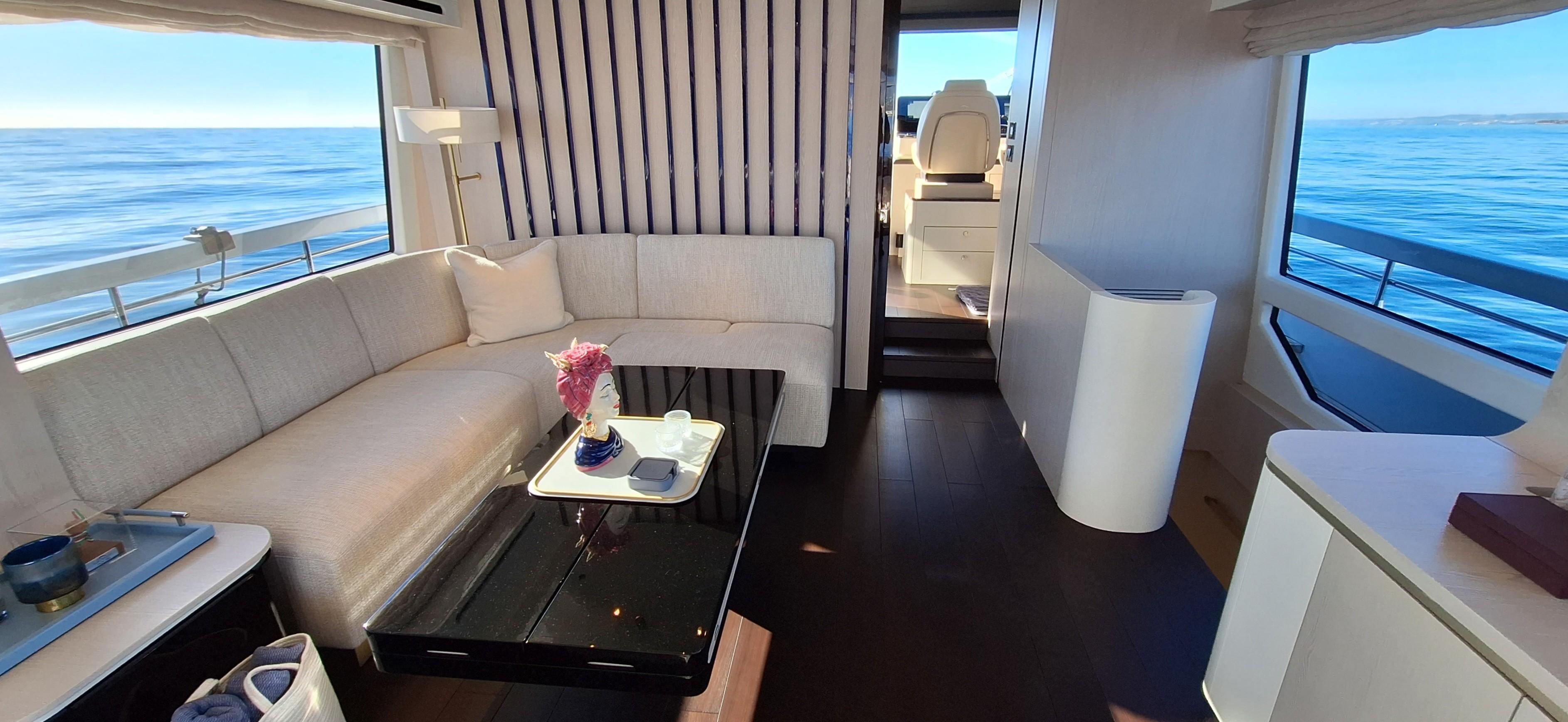 Deze Azimut 78 Fly is uitgevoerd in de exclusieve loungeversie, met twee royale L-vormige salonbanken tegenover het entertainmentcentrum aan stuurboordzijde. Dankzij de zwaarste motorisering, 3x Volvo IPS1350 (D13-1000), bereikt het jacht moeiteloos een topsnelheid van 33 knopen.