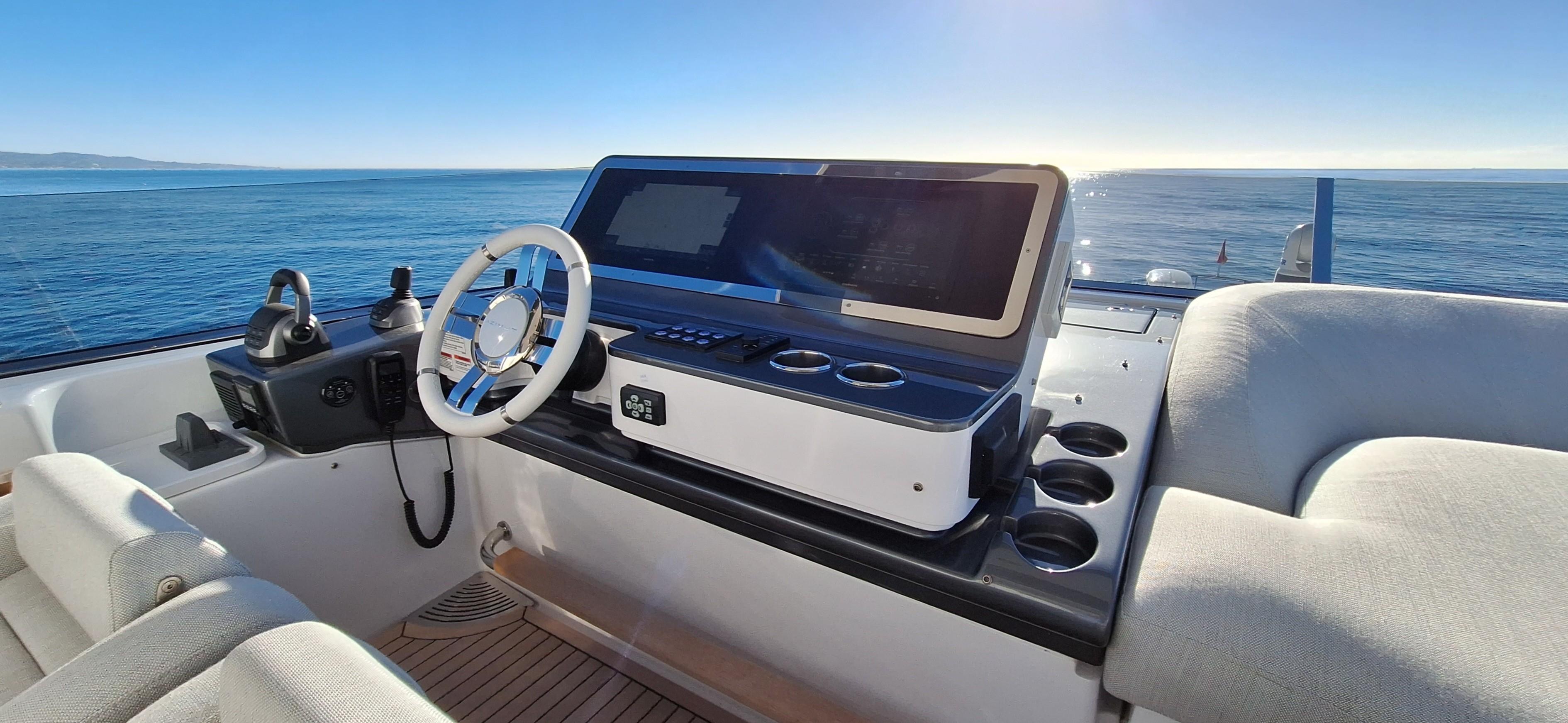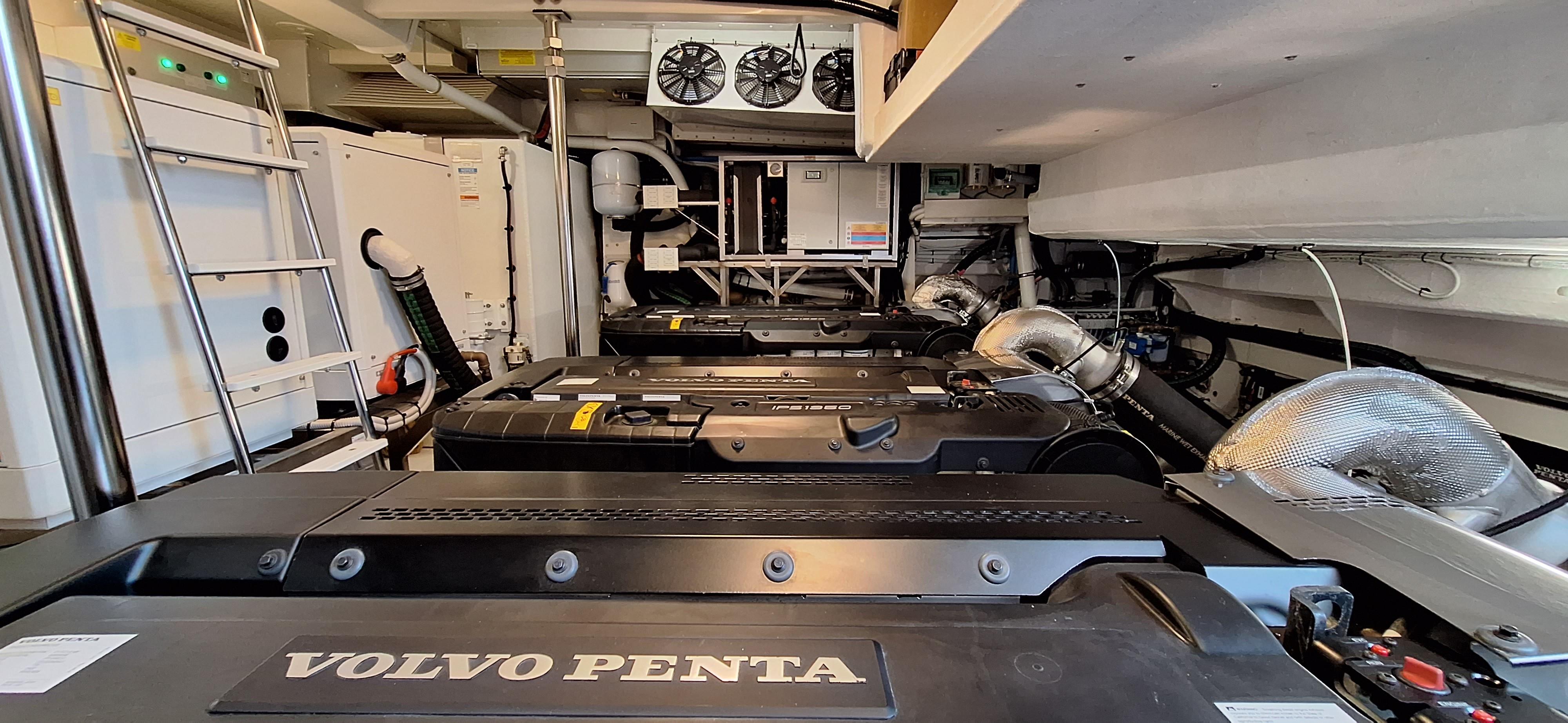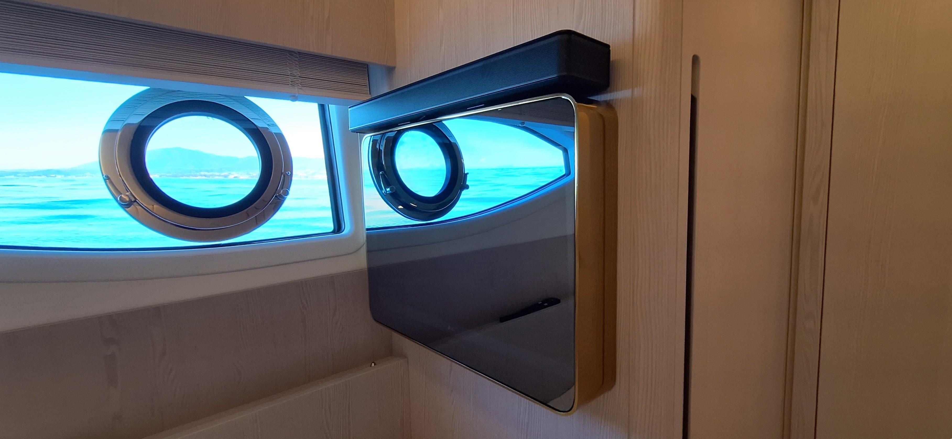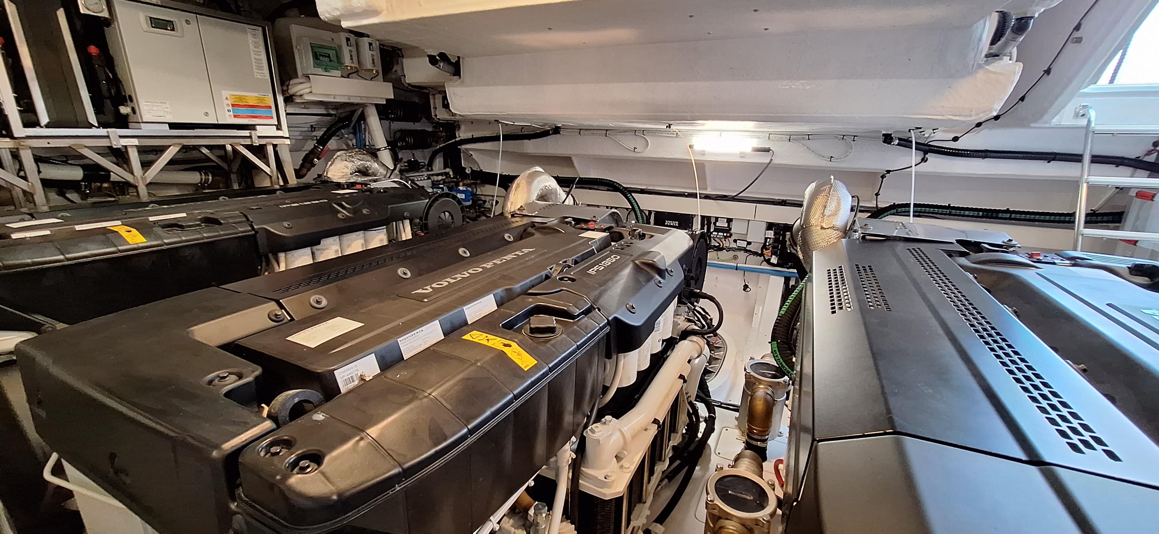 Deze Azimut 78 Fly is uitgevoerd in de exclusieve loungeversie, met twee royale L-vormige salonbanken tegenover het entertainmentcentrum aan stuurboordzijde. Dankzij de zwaarste motorisering, 3x Volvo IPS1350 (D13-1000), bereikt het jacht moeiteloos een topsnelheid van 33 knopen.